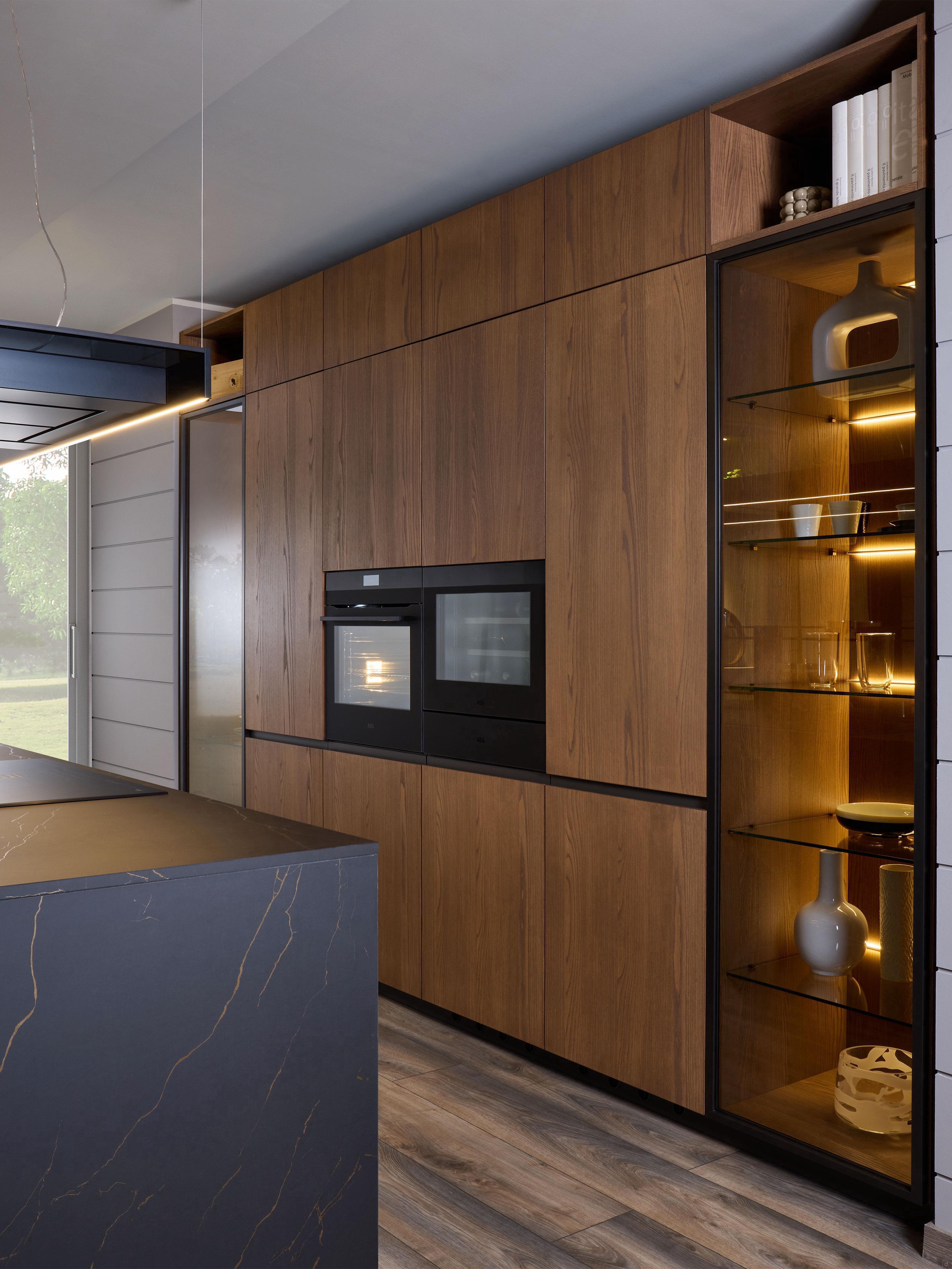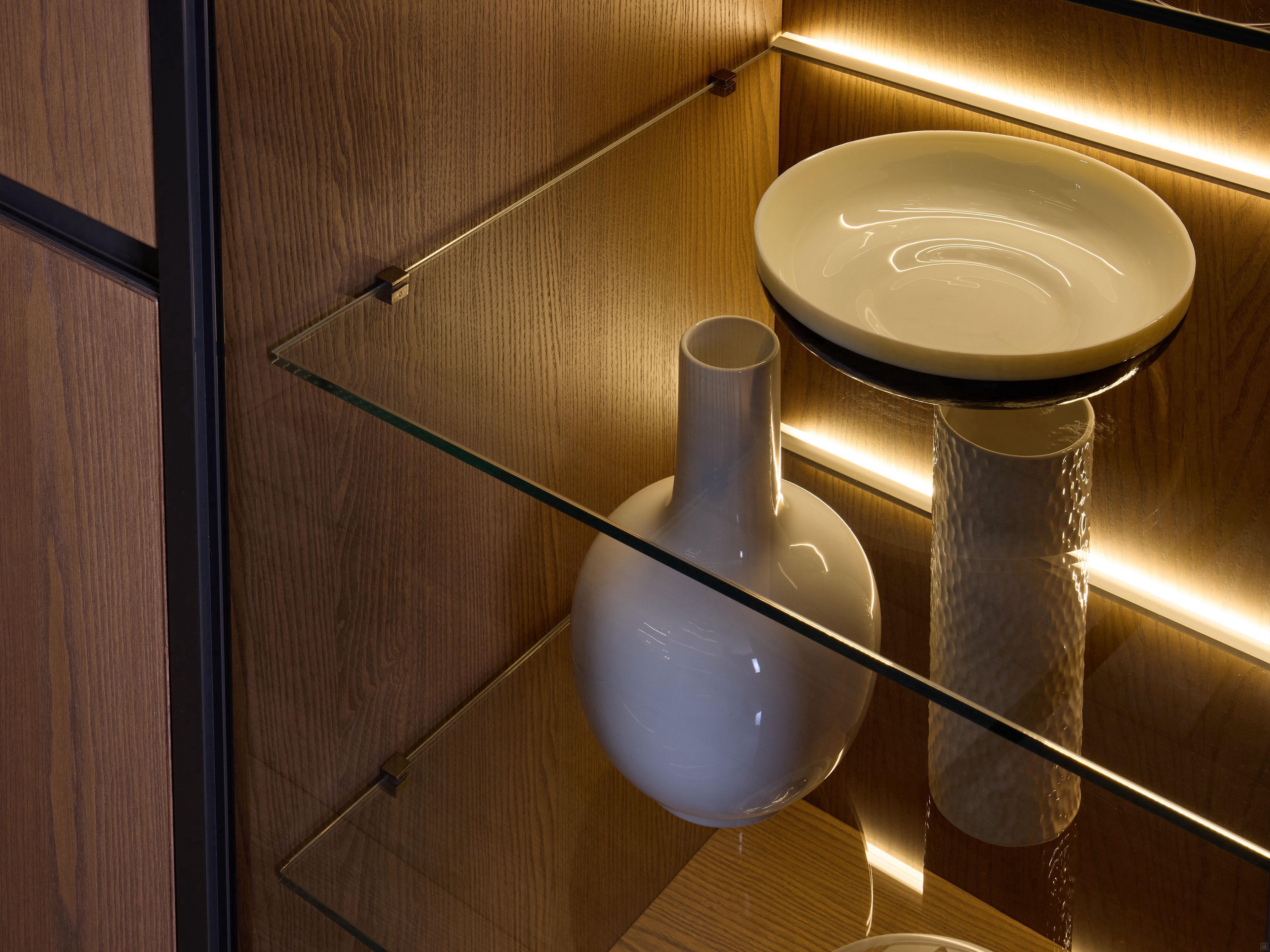display cabinets with Grigio Europa doors and integrated LED lighting on each shelf
