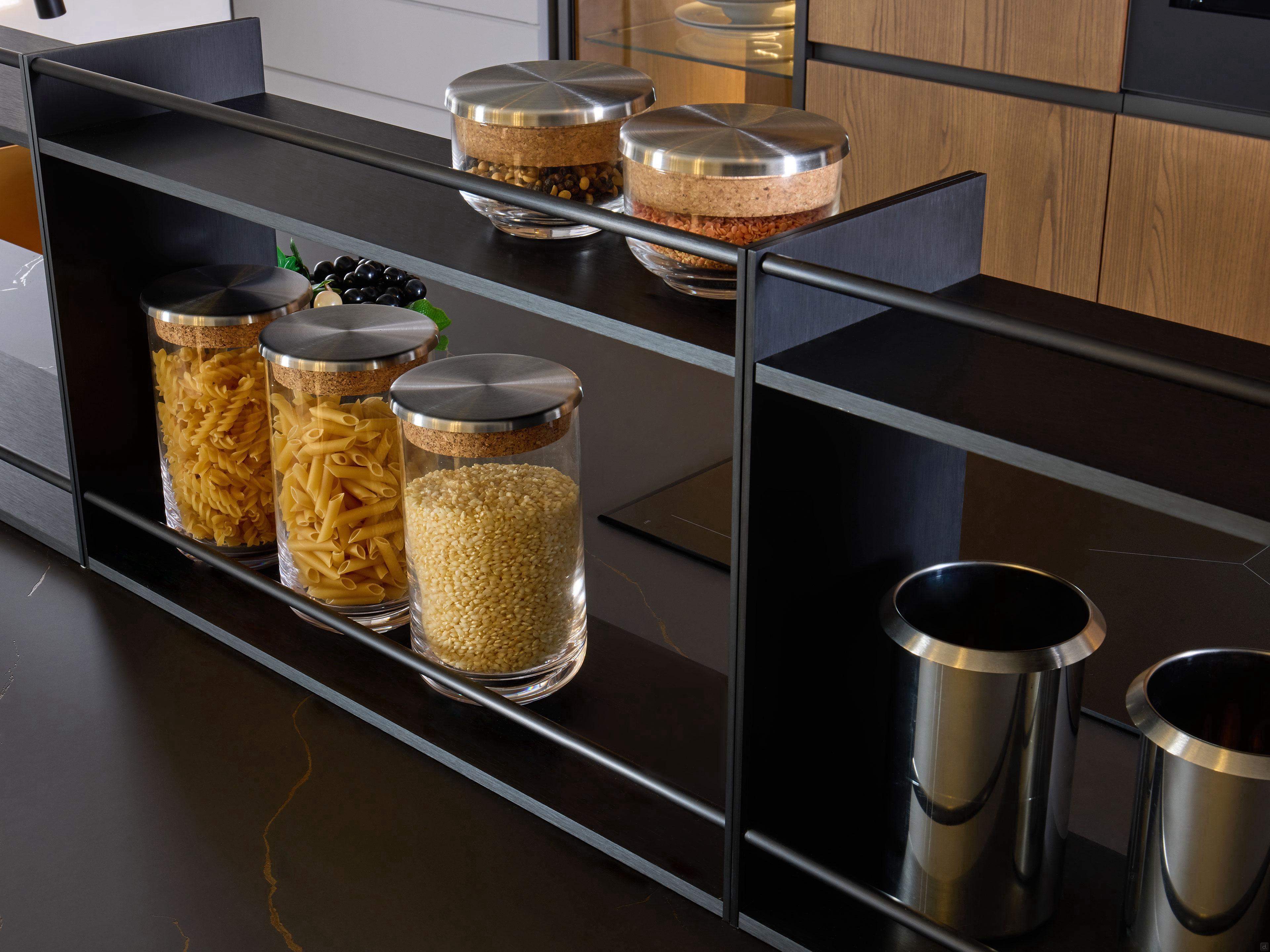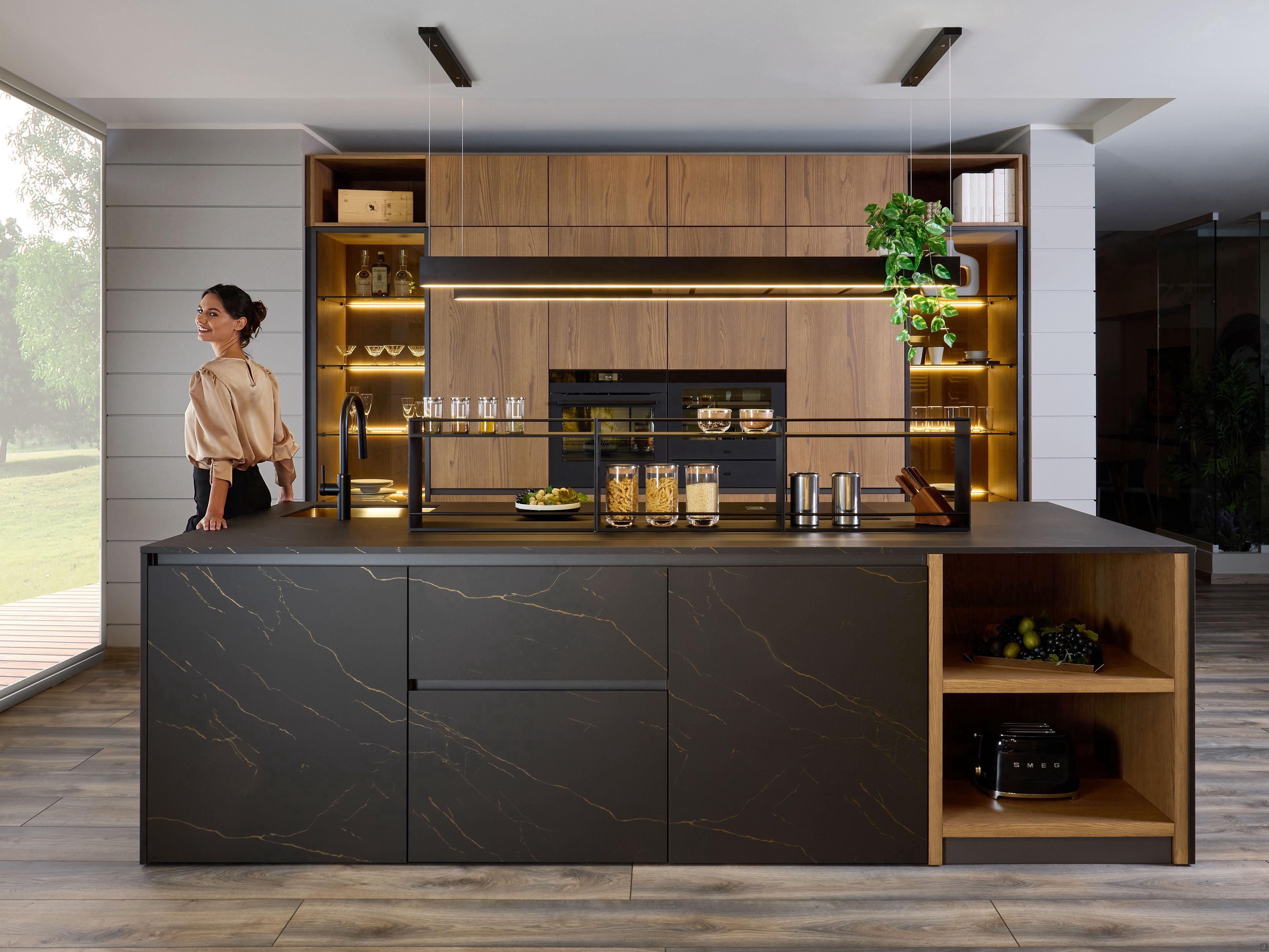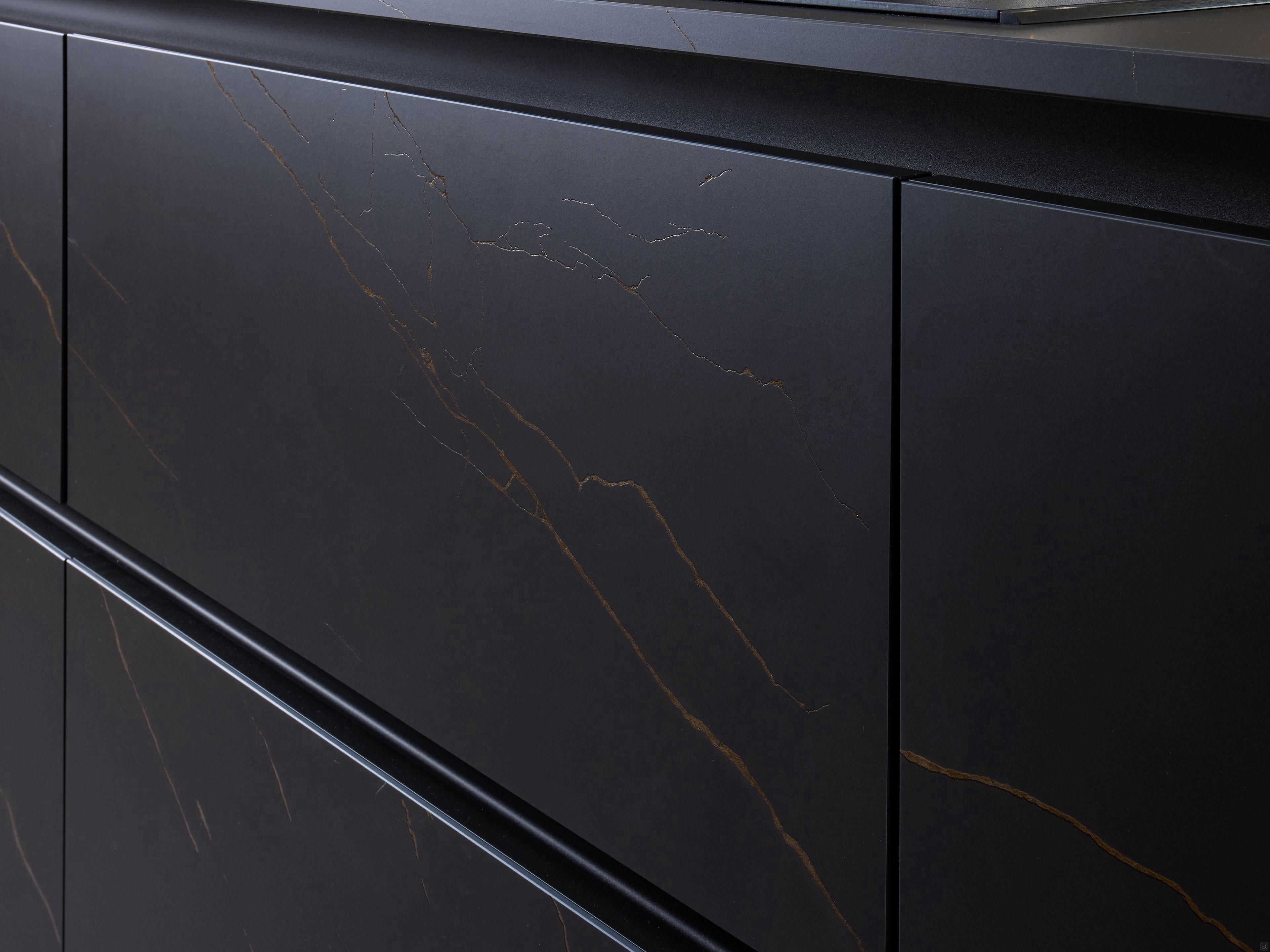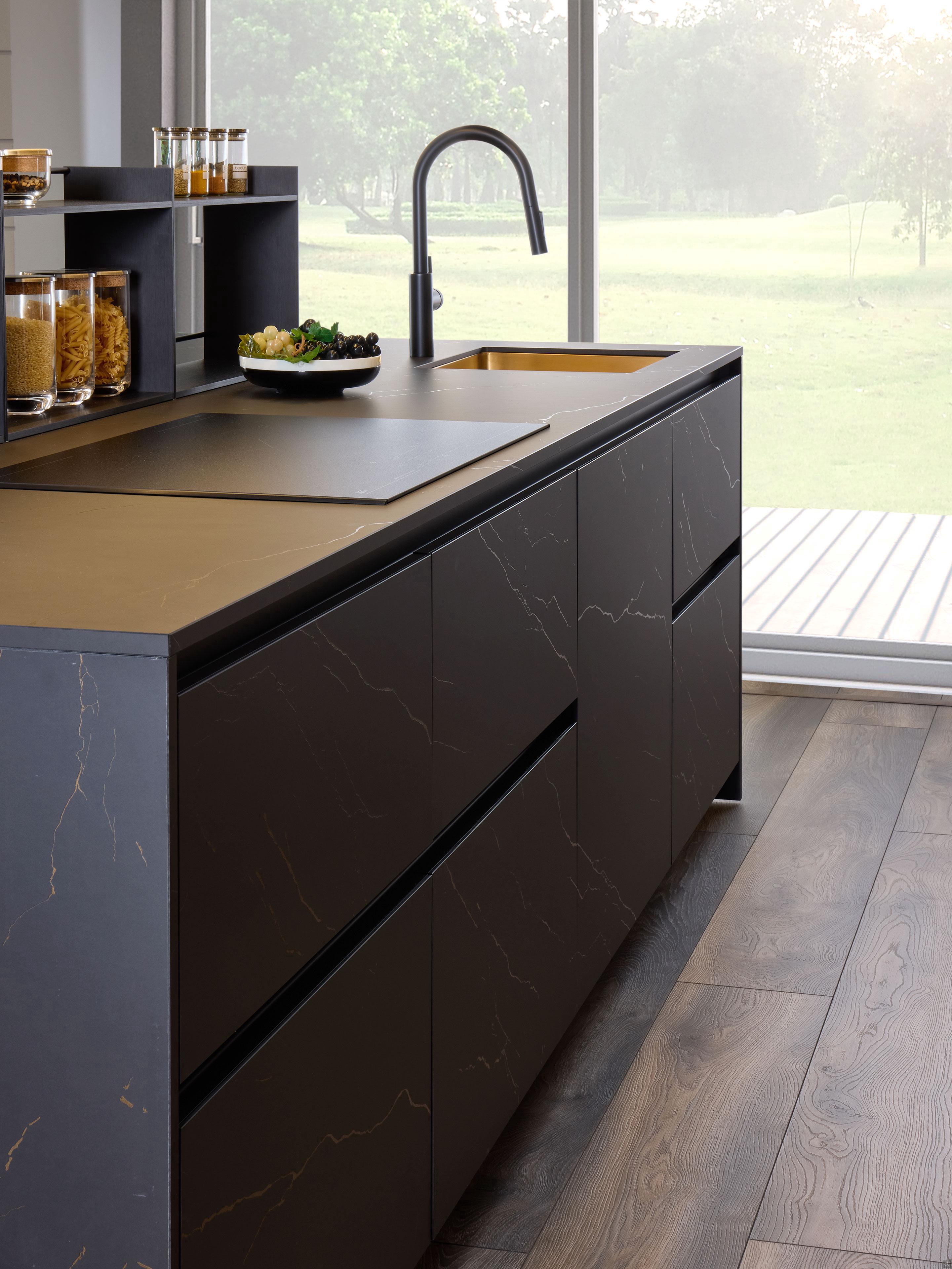 Numa Six 01 is a kitchen with an island with black and wooden finishes made entirely of Ambassador 466 HPL, distinguished by golden veins that decorate the entire surface of the island: top, sides, doors and drawers. This total matte black look with golden veins, which create a continuous pattern between all surfaces, makes Numa Six 01 an extremely luxurious kitchen with attention to detail.
