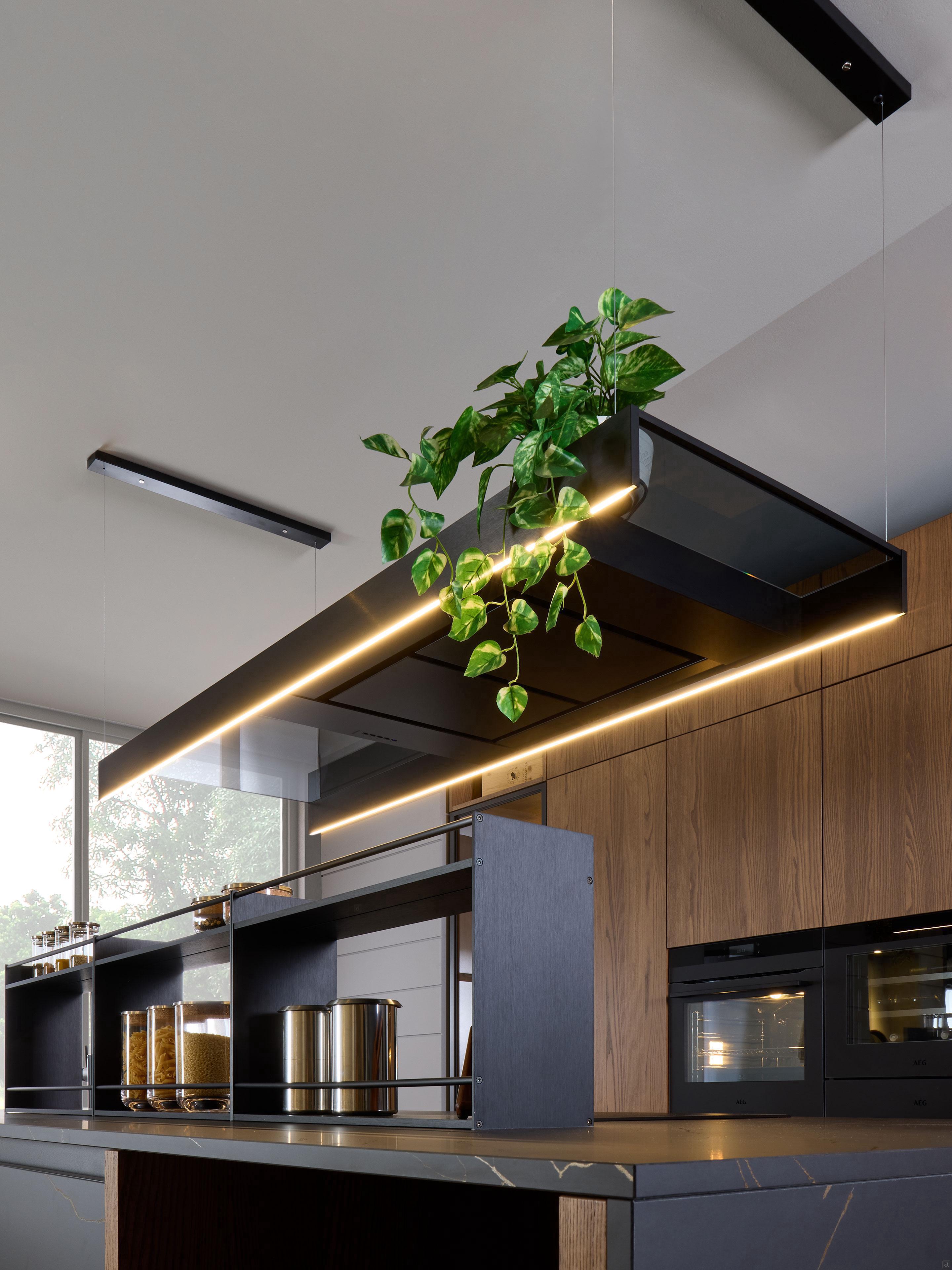 The range of fine finishes is completed by the Foster sink in Brandy-coloured stainless steel, whose gold/bronze tones perfectly echo the grain of the top, and Falmec's Light hood in matt black anodised aluminium to match the kitchen island.