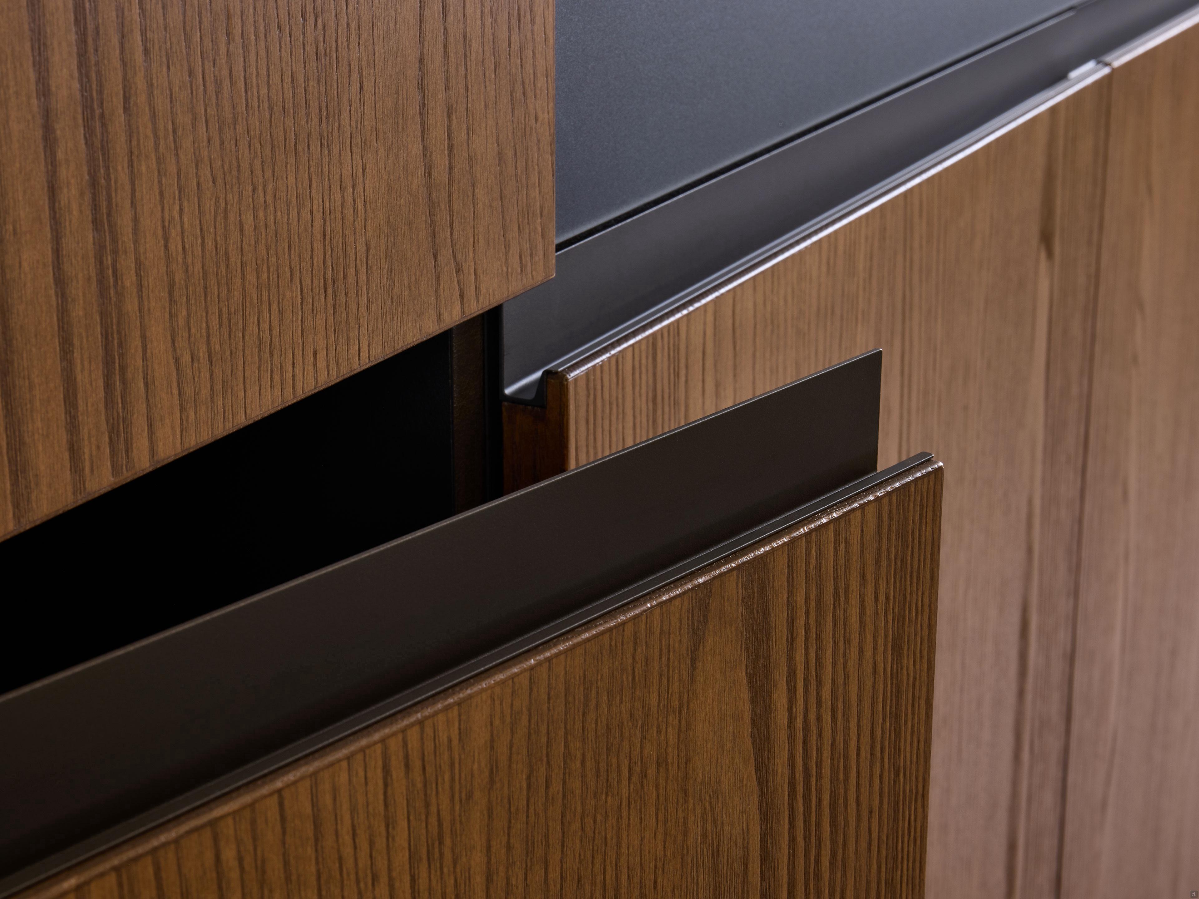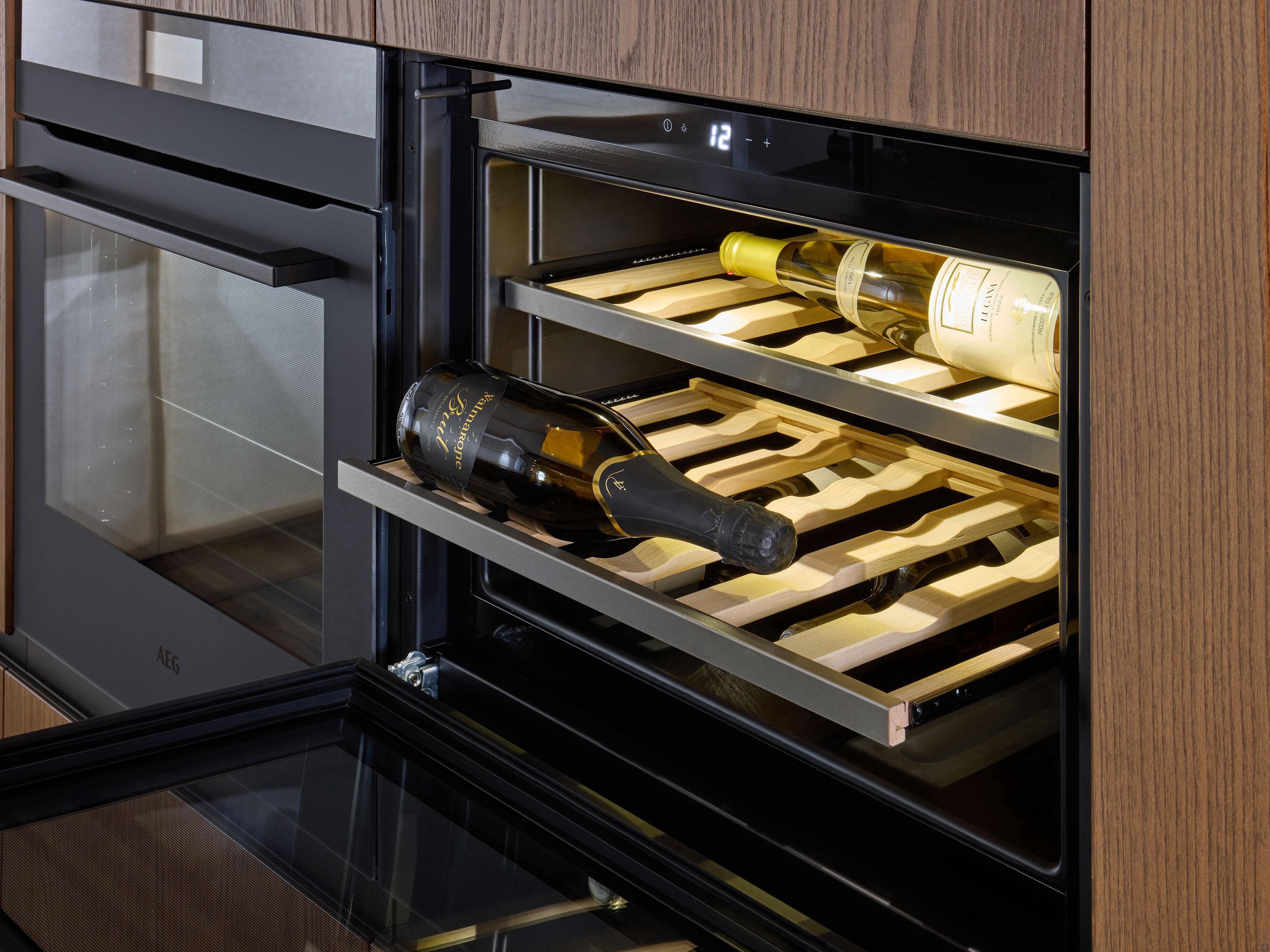 Also of excellence are the appliances located on the columns and island: oven, food warmer and wine cellar with a total capacity of 49 litres, all by AEG. As is the AEG satin-finished induction hob in SaphirMatt®, which is up to four times more scratch-resistant than standard glass-ceramic hobs, as well as being fingerprint and stain-resistant.