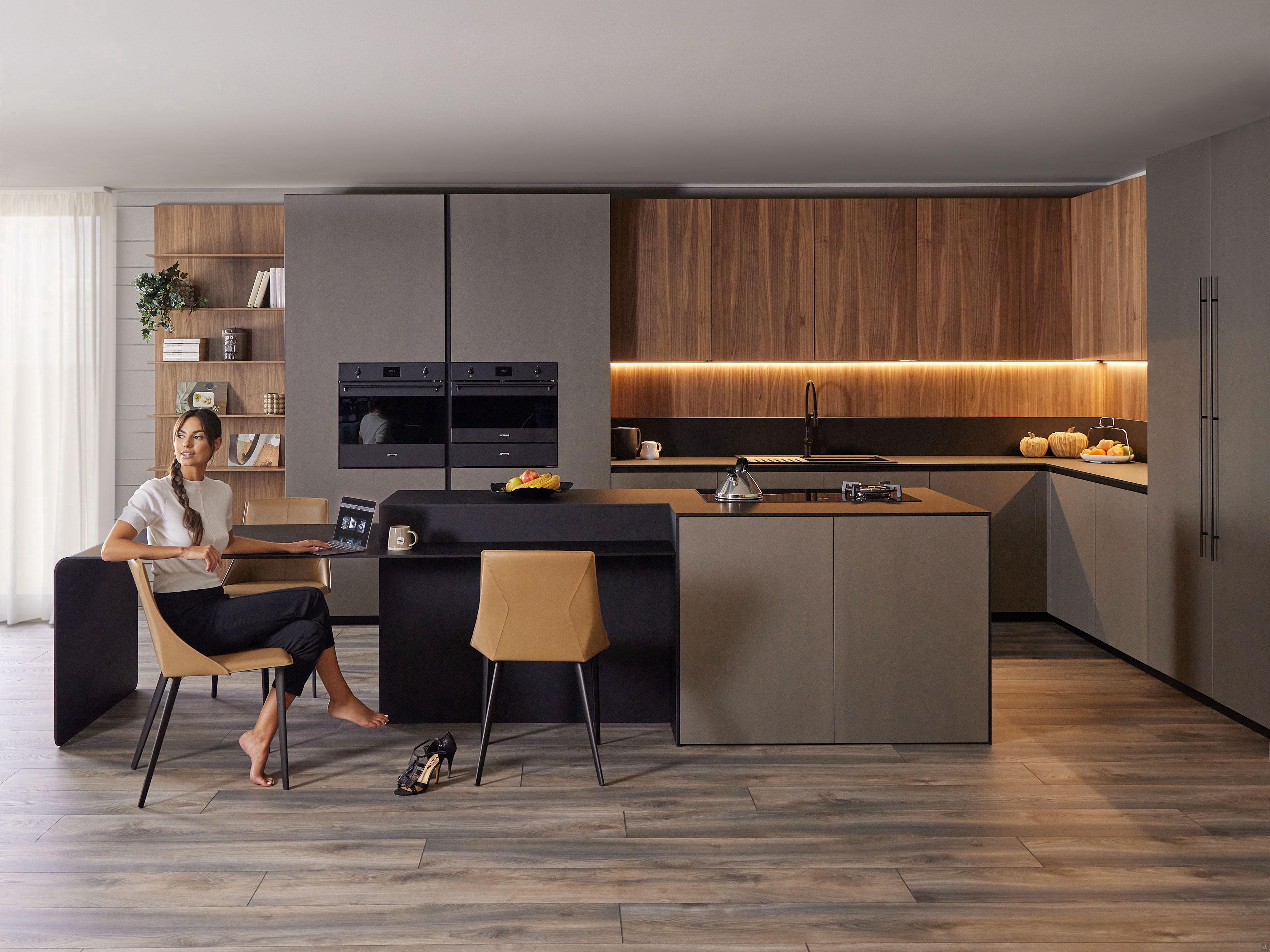 This composition features a corner kitchen with cooking island and integrated table, distinguished by triple finish: base and tall units in burnished metal, wall units and panels in Canaletto walnut, and top in black Fenix, a colour also recalled in the integrated table, appliances and details such as groove and plinth.