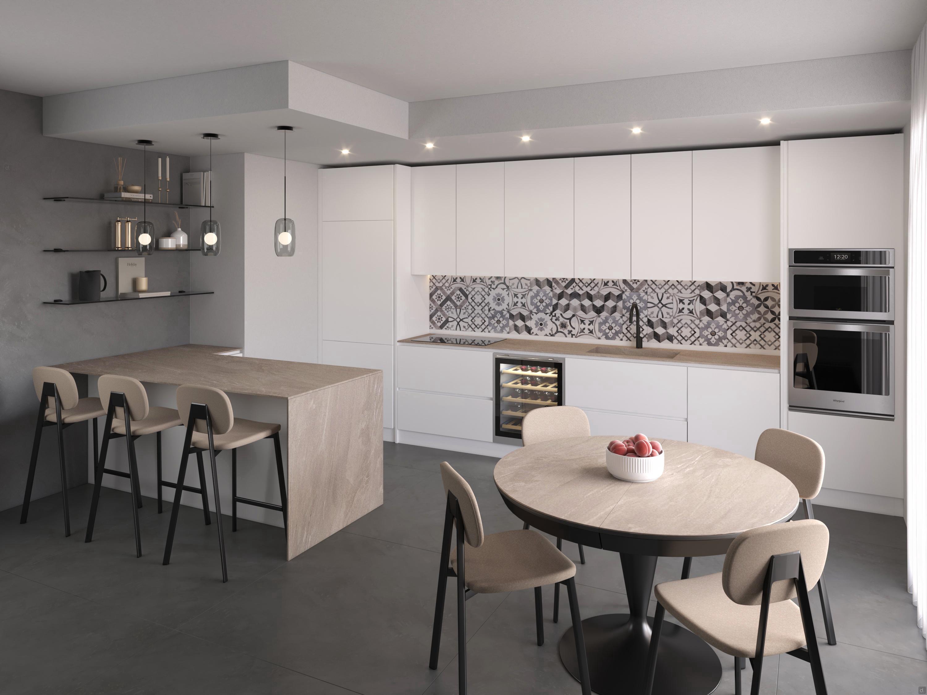 Characteristicslarge L-shaped kitchen with cooking islandstainless steel working-top with integrated sink and matching applianceselegant two-tone effect with ash cement cabinets and columns and heat-treated oak wall units double oven and big space to work