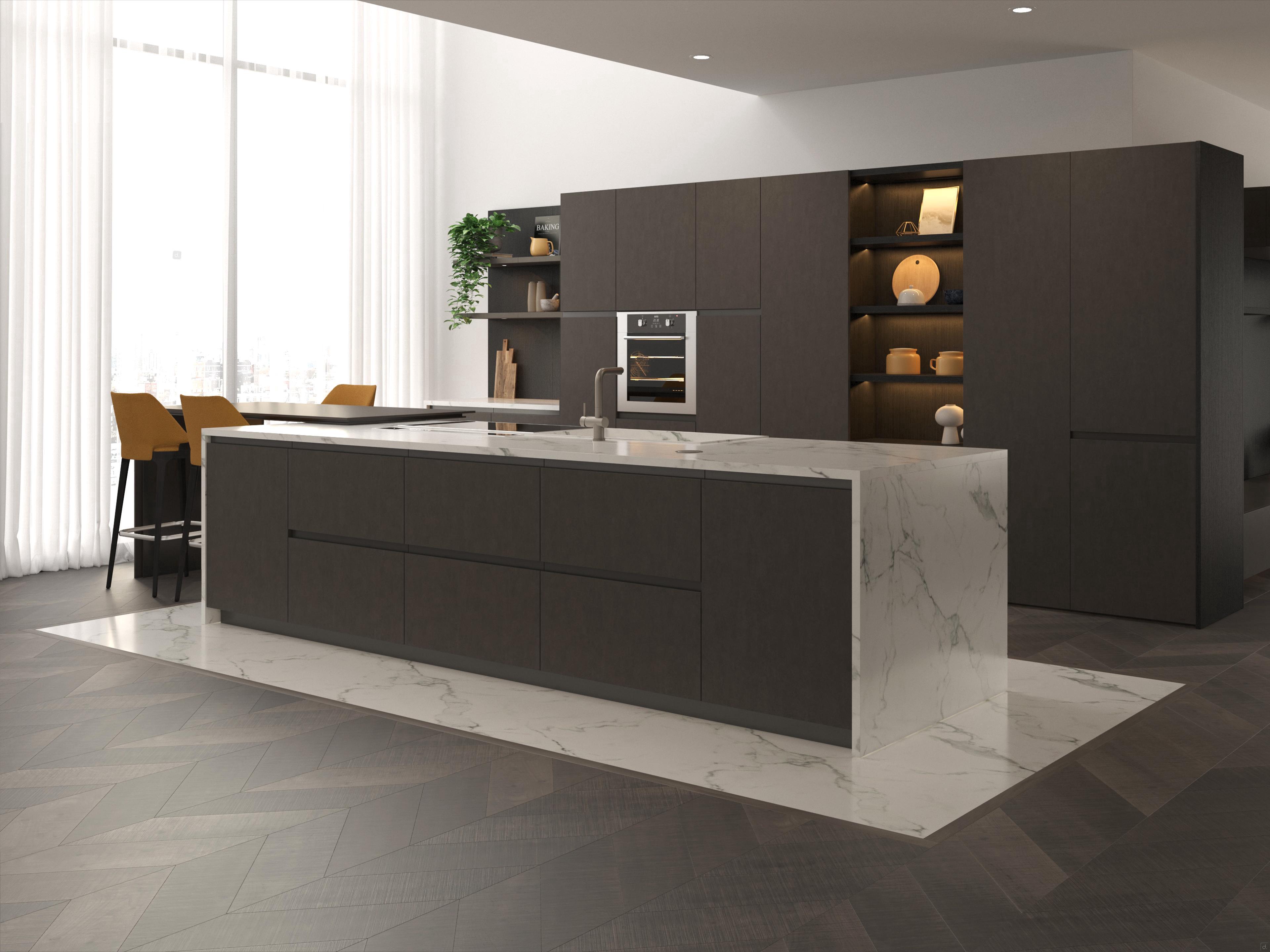 Another important detail in the design of this modern kitchen with central island is the total absence of handles, replaced by an elegant and minimalist recess grip with a moka shine satin metal groove.