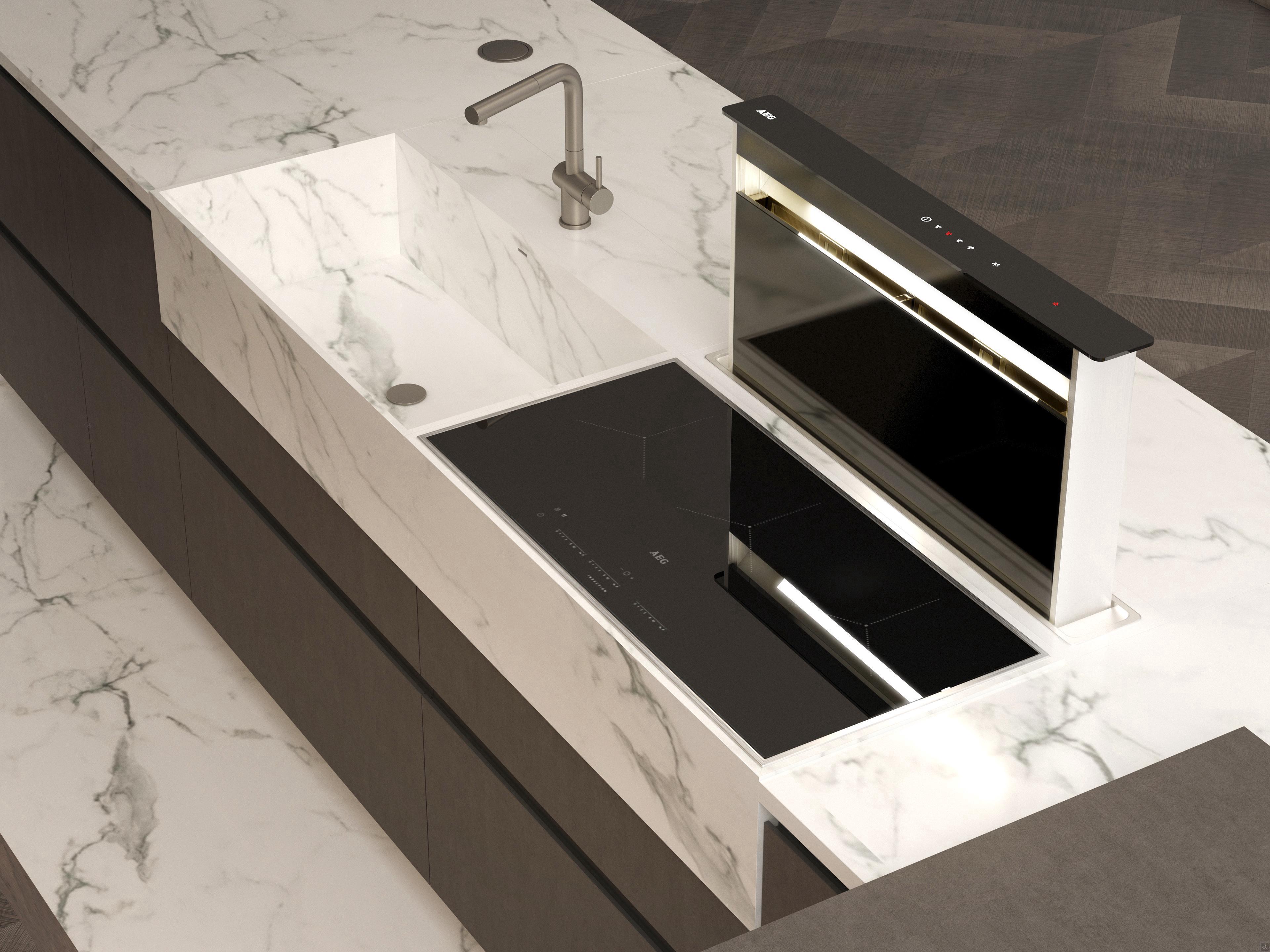 The working area, in particular, is made up of Brick system, a single block in marble h.24,3 cm that is encased onto the base units and houses the sink with integrated basin and a hob with a choice of induction or gas. The Brick system is available in different modularity from 90 to 240 cm and can be made of Laminam, marble or granite.