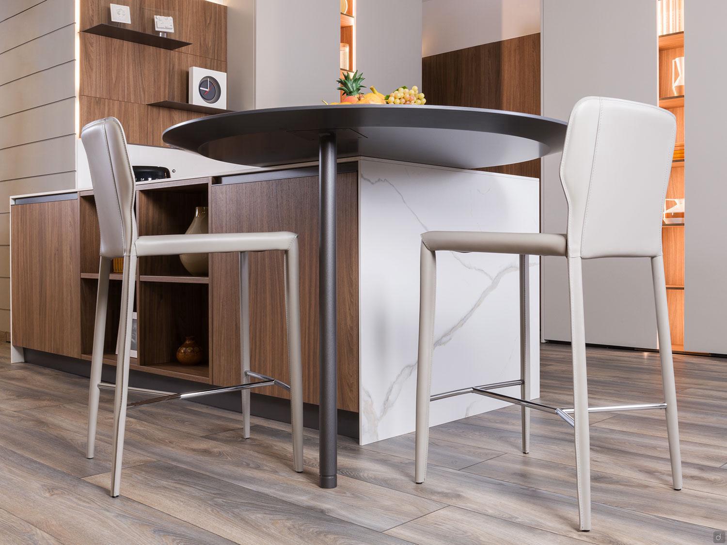 The latter is composed of an eye-catching round top Ø 125 cm, designed for 2/3 diners and positioned in such a way that it overlaps the end of the peninsula, uniting the kitchen and living room area.
