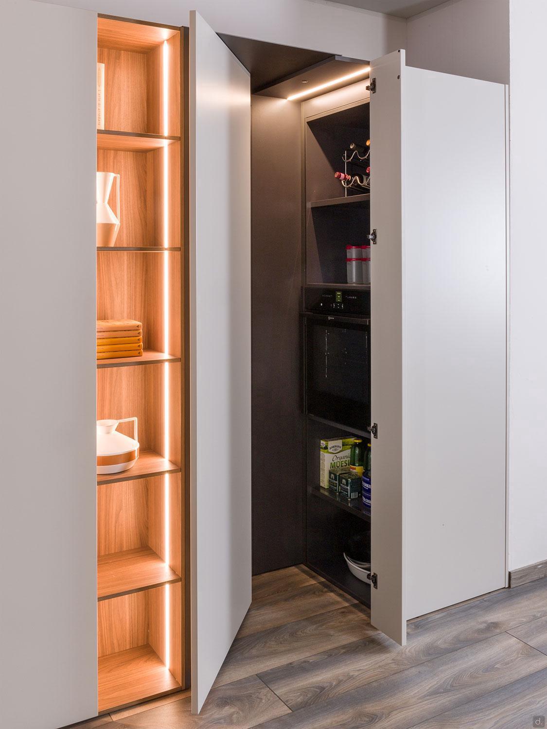 Flip storage column with tilting door, concealing the oven and pantry
