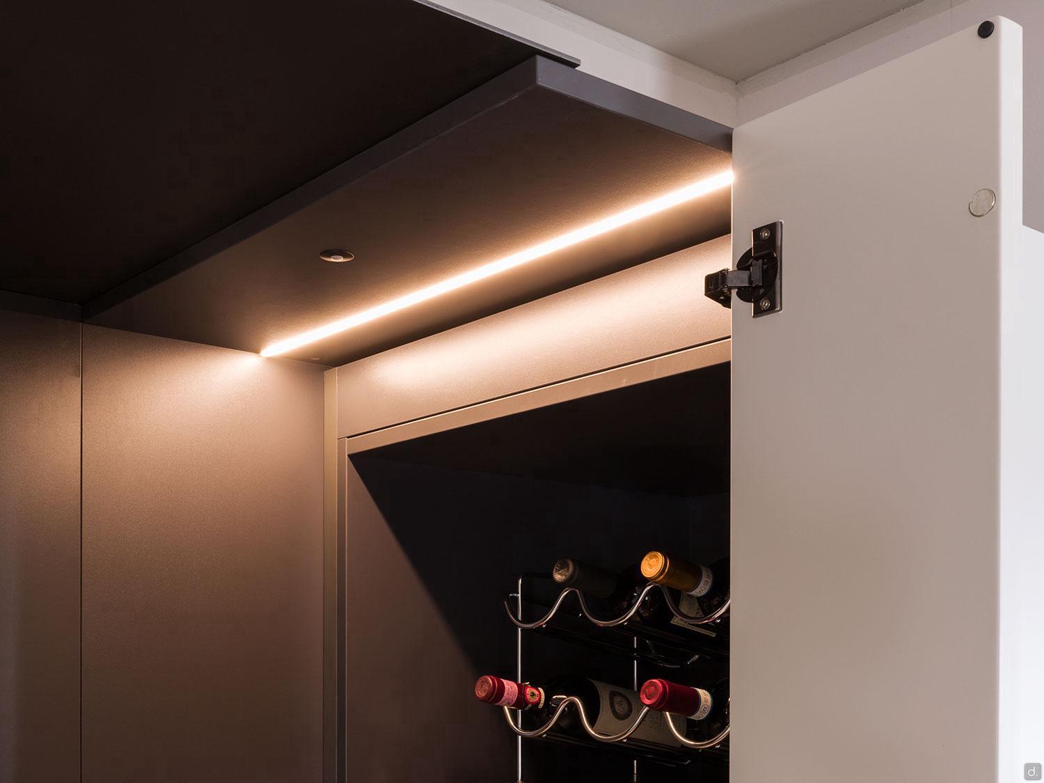 Storage columns, bases and wall units are finished with taupe matte lacquer, while the natural walnut wood effect melamine is used for the wall panels, the snack table and the peninsula side that faces the living zone of the open-plan space.