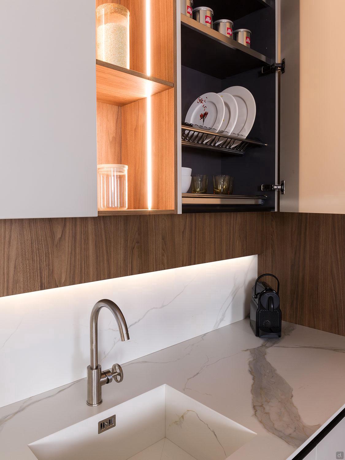 In addition to these two precious materials are the Calacatta marble-effect laminam countertop and the Moka Shine finish of the painted metal details: grip handles, shelves and the table leg.