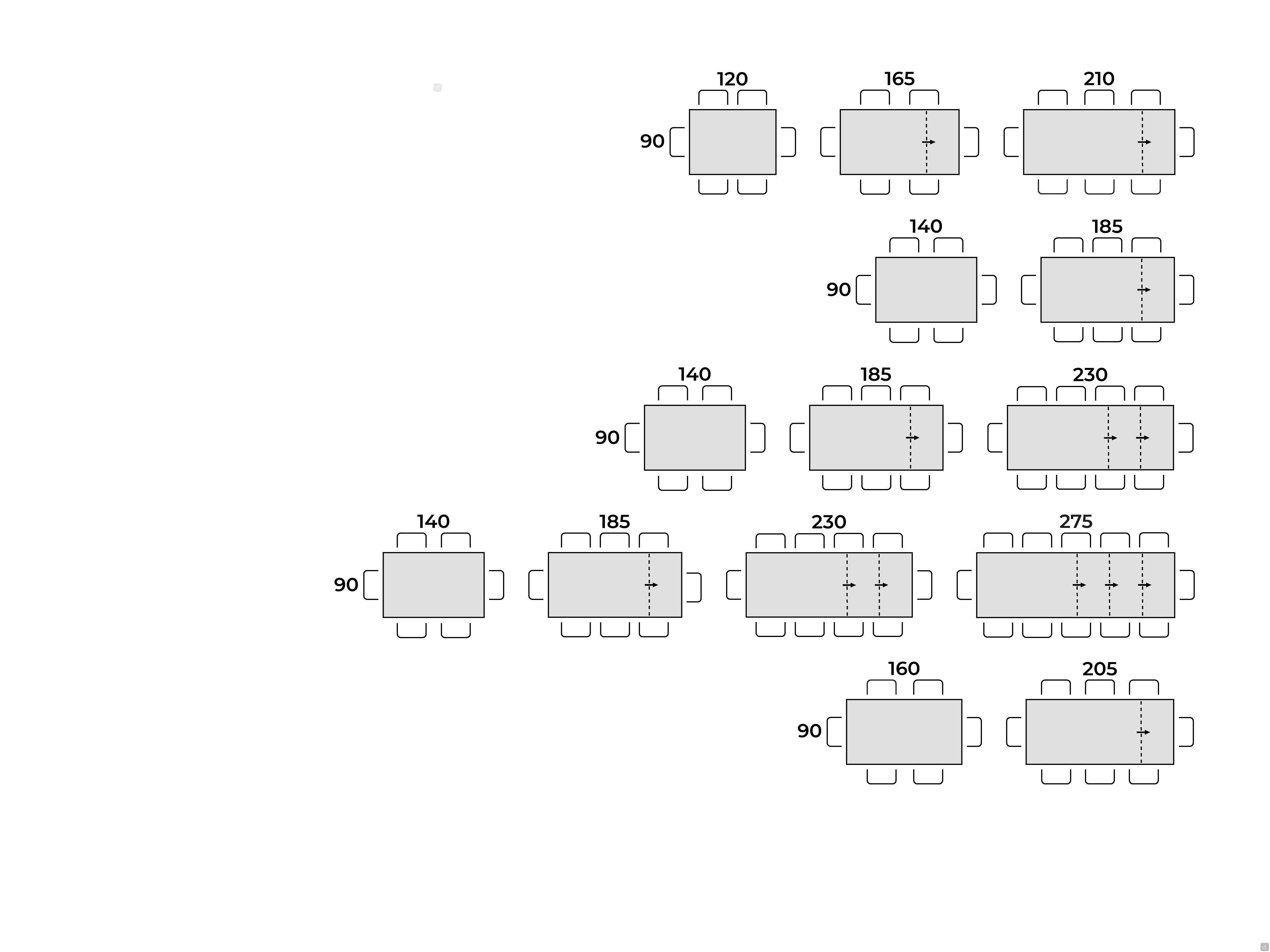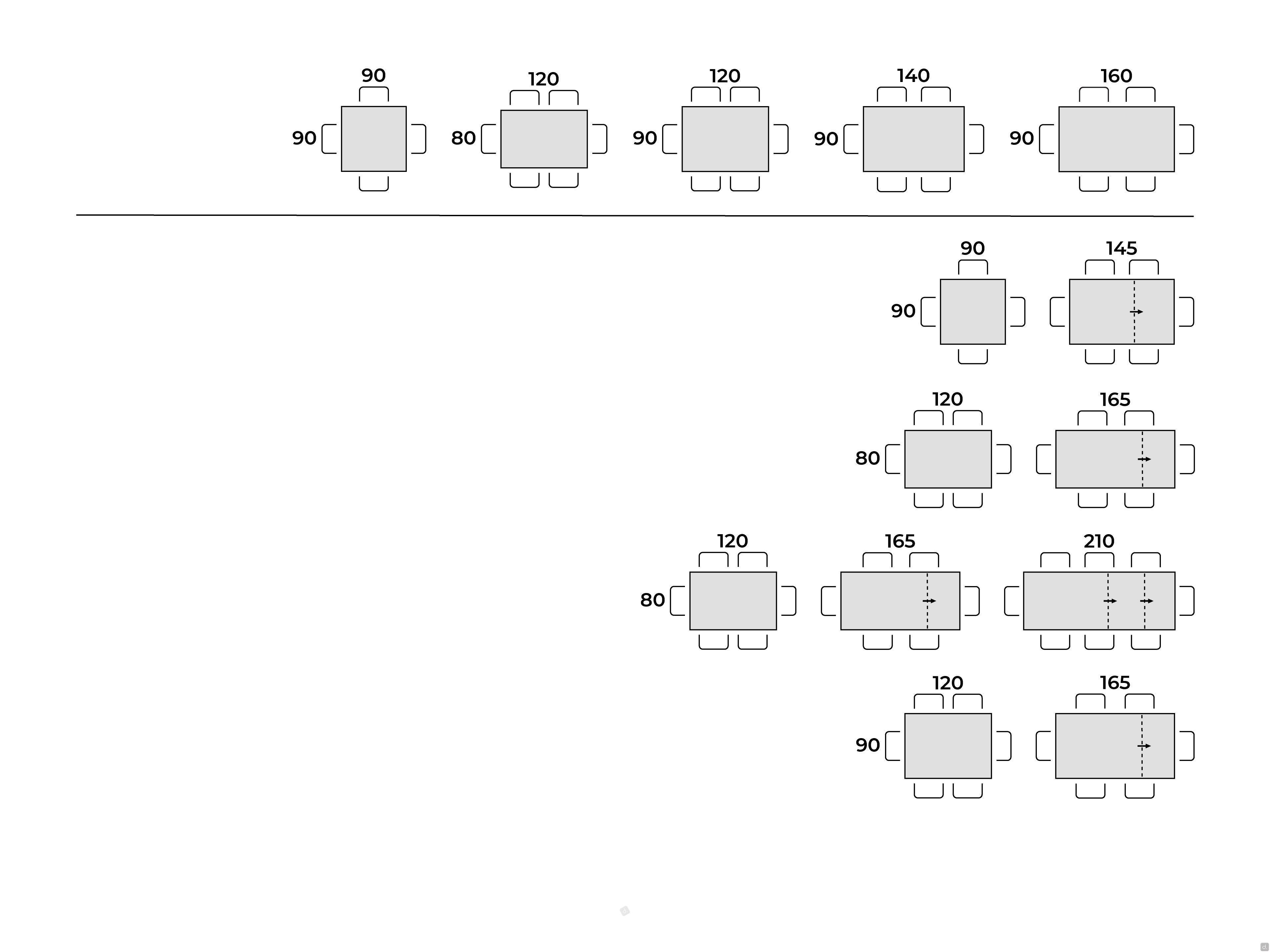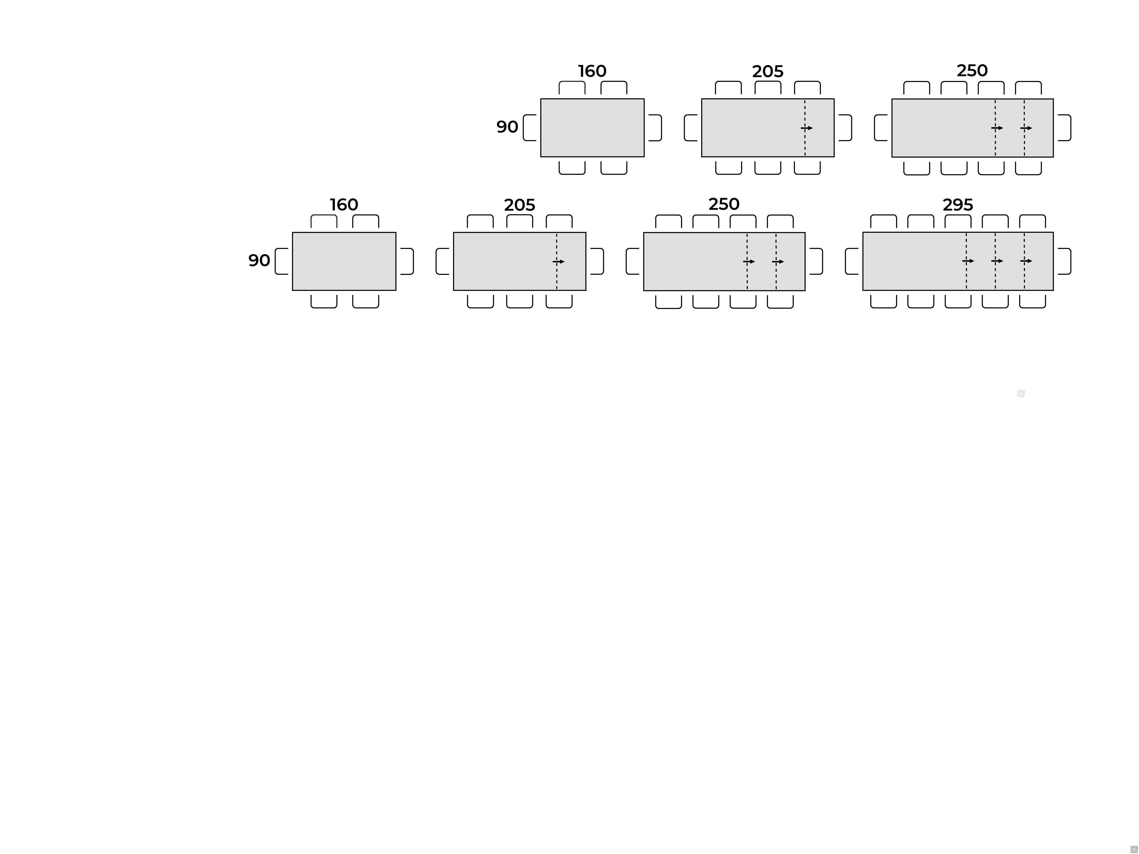 The 90 cm extendable model is equipped with one 55 cm folding extension. The 120 cm extendable model is equipped with one or two 45 cm extensions, while the 140 cm and 160 cm extendable models are equipped with one, two or three 45 cm side extensions.