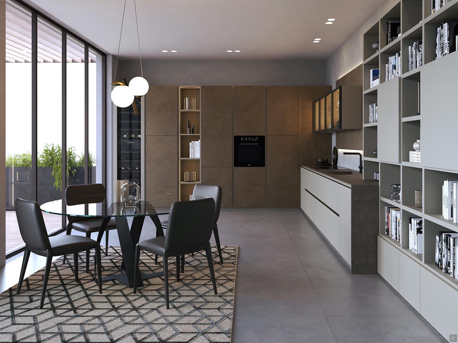 Another distinguishing feature of this custom modular kitchen is the two-tone colour scheme, which creates a delicate balance between the two sides of the L-shaped composition. The two-tone effect is achieved by combining the platinum matte lacquer of the base units with the bronze-coloured Aladust painted aluminium of the tall units and panelling. Aludust is a special type of metal finish treated on the surface with a manual lacquering that makes it unique and unrepeatable. To complete the colour alternations, a 1,2 cm thick Laminam top in Fokos Piombo finish was chosen.