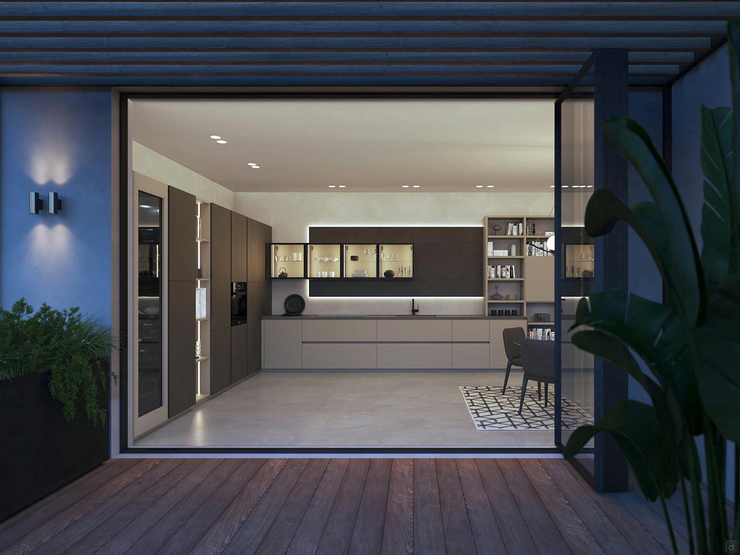 Plan Line 04 is a modern corner kitchen with wine cellar, designed for luxury open spaces that want to keep a bright and modern look.