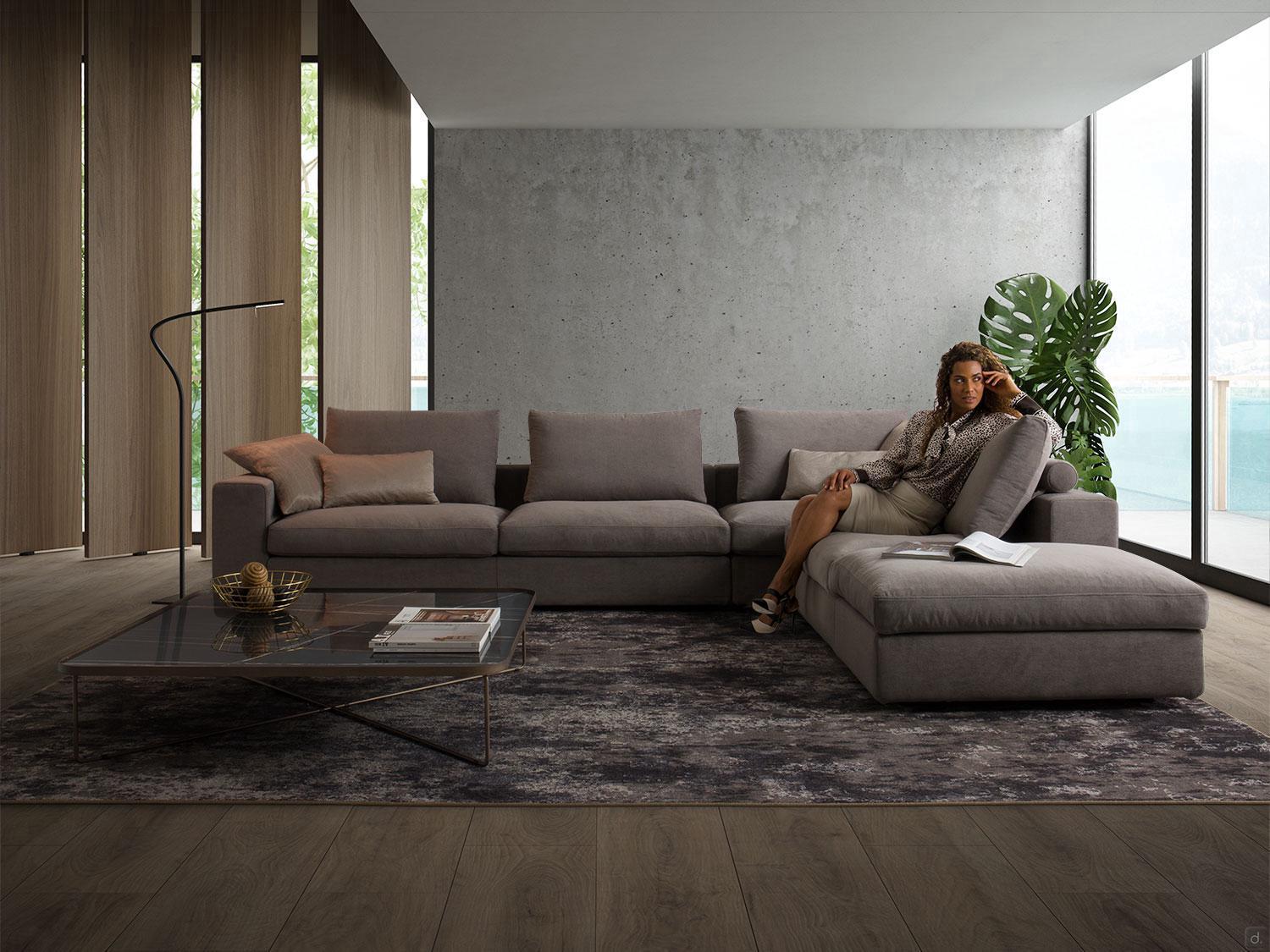 Hyeres modern down sofa with generous, welcoming and cosy shapes. The comfortable back cushions are padded in soft natural feathers-down, wheareas the seat cushions are carefully shaped in expanded polyurethane foam for added support and covered in an acrylic material with feathers-like effect. Simple and sober in lines it offers the utmost comfort and relax.Back cushions feature a back bolster that keep them into position by standing on the low backrest. You can choose the size of the back cushions depending on whether you prefer a more formal sofa when the cushion is as wide as the seat, or more lounge layout when cushions are smaller than the seat and it remains more distance between them.The wide range of colours and textures in fabric, velvet, faux-leather and leather guarantees an excellent customization. Hyeres is available in several different layouts and measurements to compose 2,3 or 4 seater sofas, L-shaped or corner; the living area is completed with the pouf from the same collection.