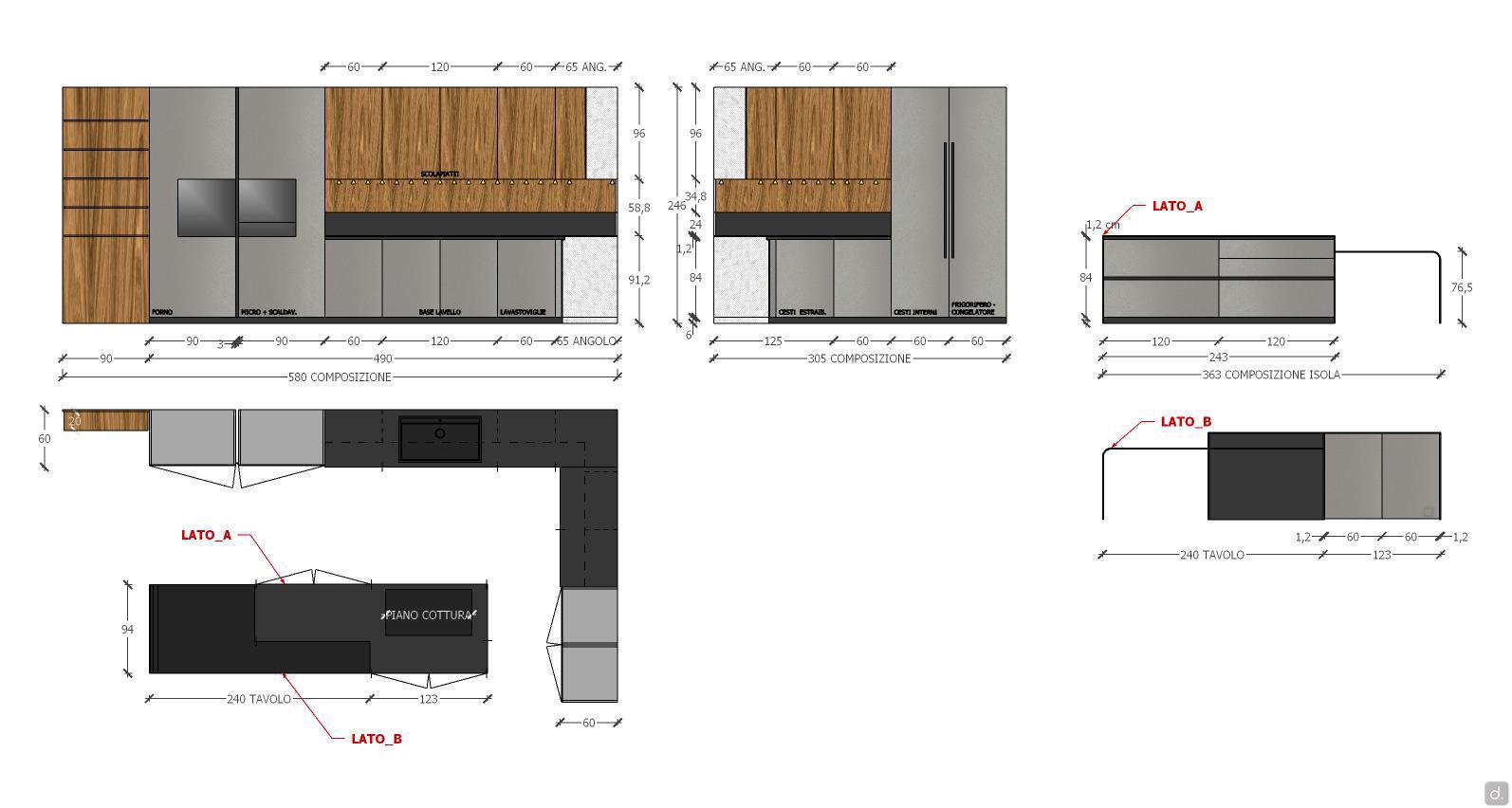 This corner composition with cooking island and integrated table is also distinguished by a triple finish: base and tall units in burnished metal, wall units and boiserie in Canaletto walnut and top in black Fenix, a colour also found in the integrated table, in the appliances and in details such as grooves, handles and plinth. Adding to the prestige of this luxurious kitchen are accessories and fine details: the induction hob, the Smeg double oven with food warmer, the Smeg sink with removable bowl, the steel pull-out mechanism for the corner unit, and the 120 cm wide cutlery tray in Canaletto walnut.