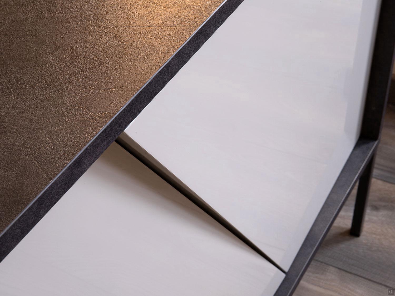 Aikido outlet is a modern sideboard with oblique-cut doors, a contemporary piece of furniture with a distinct yet measured and timeless personality, perfect in both a classic and modern context. What is striking is the particular geometric play of the doors: a 30° slanting cut divides them into two slightly misaligned parts and creates a refined and unprecedented three-dimensional effect on the surface with plays of reflections and chiaroscuro. The body and doors are made of wood and rest on 20 cm high metal feet; the sideboard is offered in a double finish: the glossy lacquered doors are well matched to the structure made of textured effect melamine, creating a pleasant contrast of colours and textures.