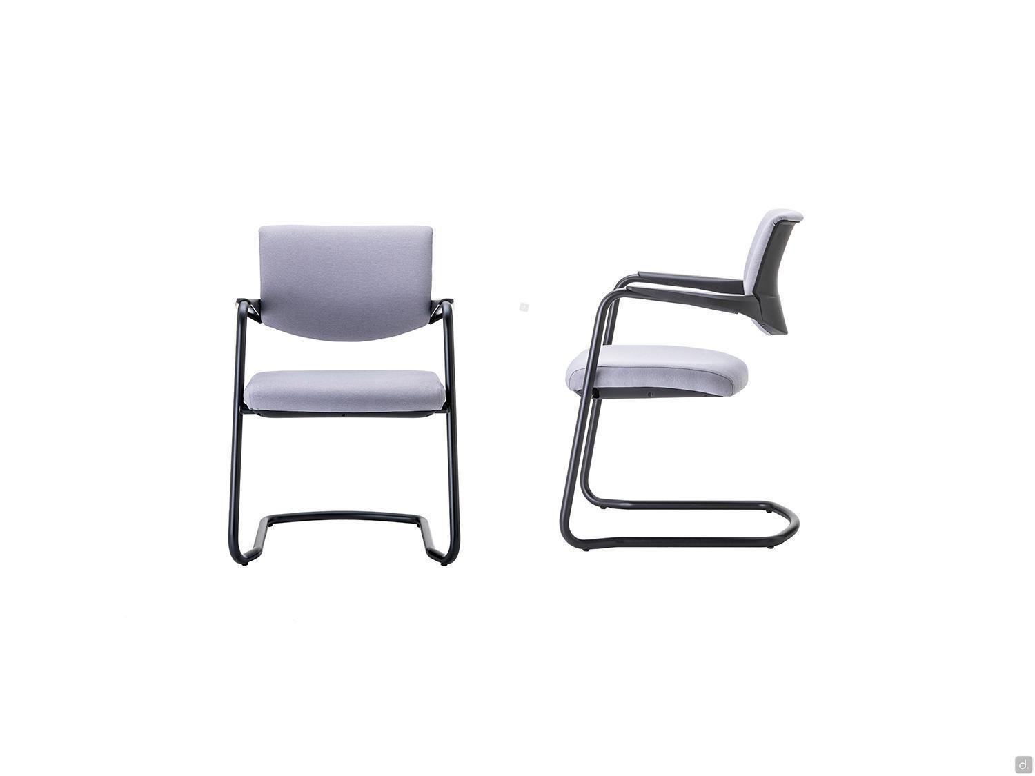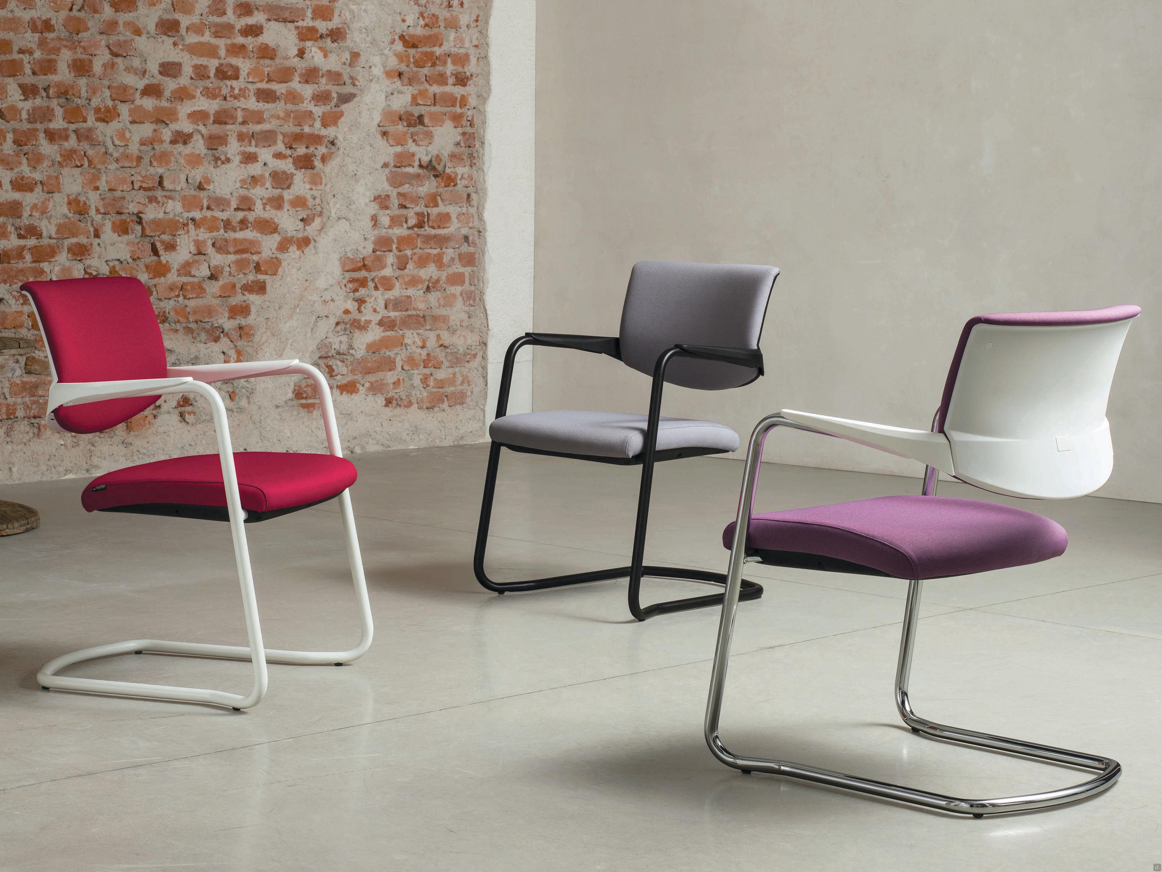 Steve is a modern upholstered cantilever chair characterised by a pleasant contrast of materials and colours created by the combination of the rear back and armrests surface material with the upholstery cover of the seat and back. The cantilever metal base, together with the armrests, give a particular lightness effect to the seat which results comfortable too thanks to the low upholstered cover.