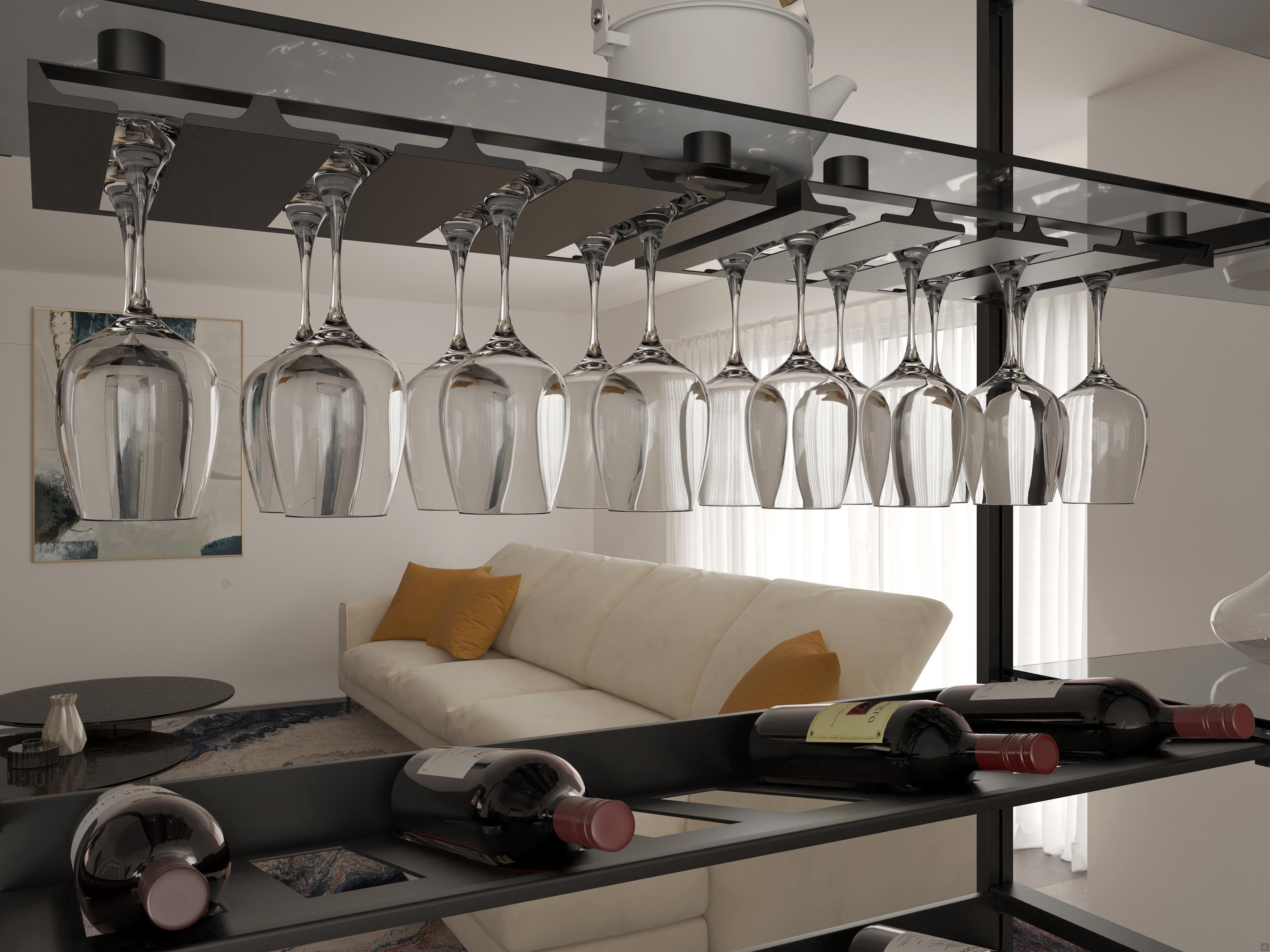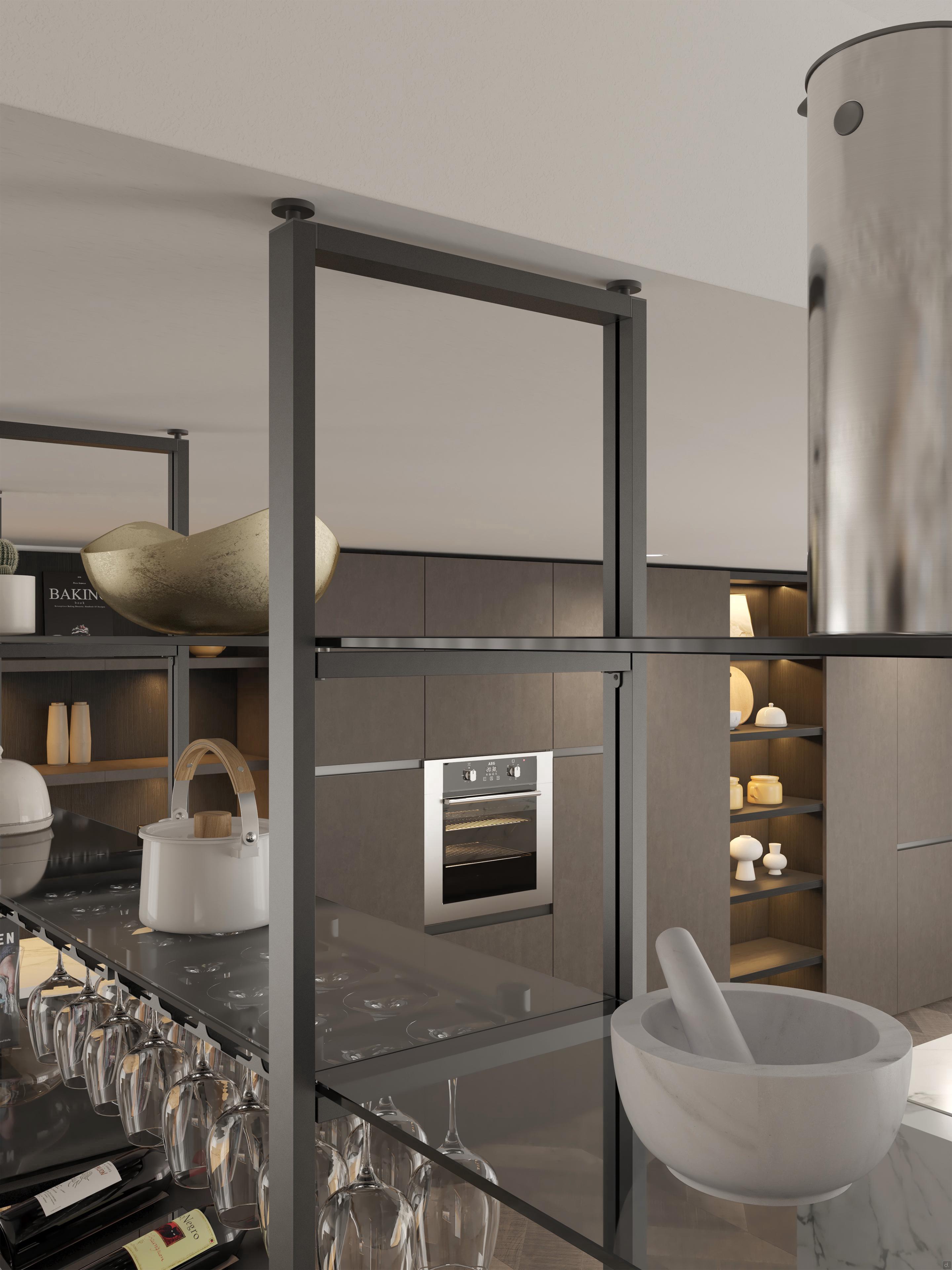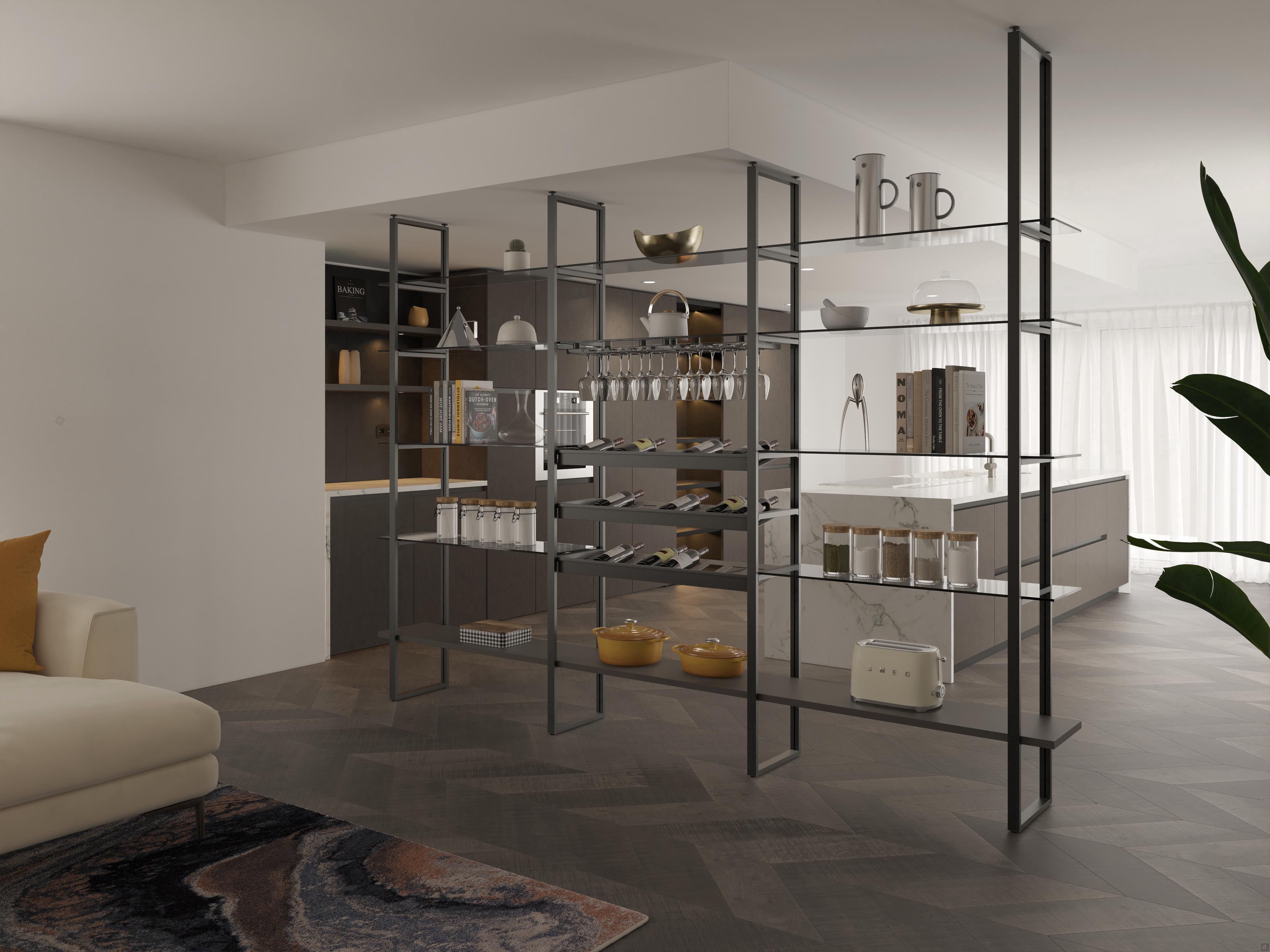 Milton is a modular metal bookcase with a minimal design which is characterised by versatility and the possibility of customizing the shape, materials and colours. The individual modules made of uprights and shelves can be combined together, playing with different widths, positioning and shelves. The uprights can be mounted on a wall and the floor, suspended on a wall, or floor-to-ceiling, making it possible to create captivating, dynamic compositions. The combination of the materials metal, glass and wood makes the Milton bookcase an accessory with an evergreen design. The bookcase features many highly refined details, and is capable of fitting into contexts with both classic and modern furnishings, enhancing the available space not only with a strong aesthetic impact, but also functionality with the shelves and suspended storage compartments.