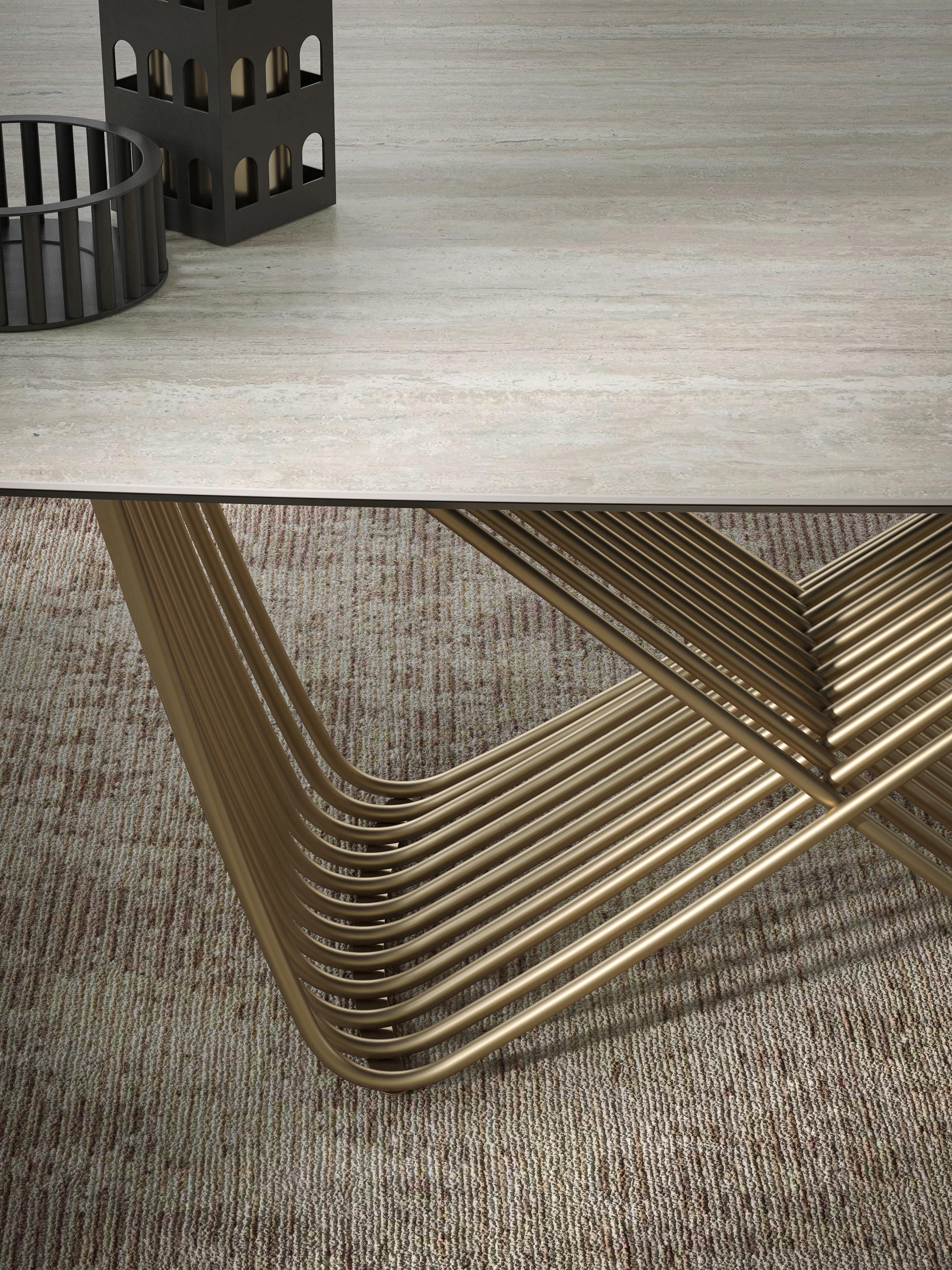 Board is a porcelain stoneware table with central base featuring a fascinating interweave of curved metal tubes. The rectangular or barrel-shaped top is also made of clear, lacquered or hammered glass, marble stone and solid wood with straight, sloping or irregular edges. The elegant structure lends lightness and personality to the living room table, enhanced by the particular playfulness created by the dense metal weave. Board is perfectly suited for living areas with a modern and sophisticated design..