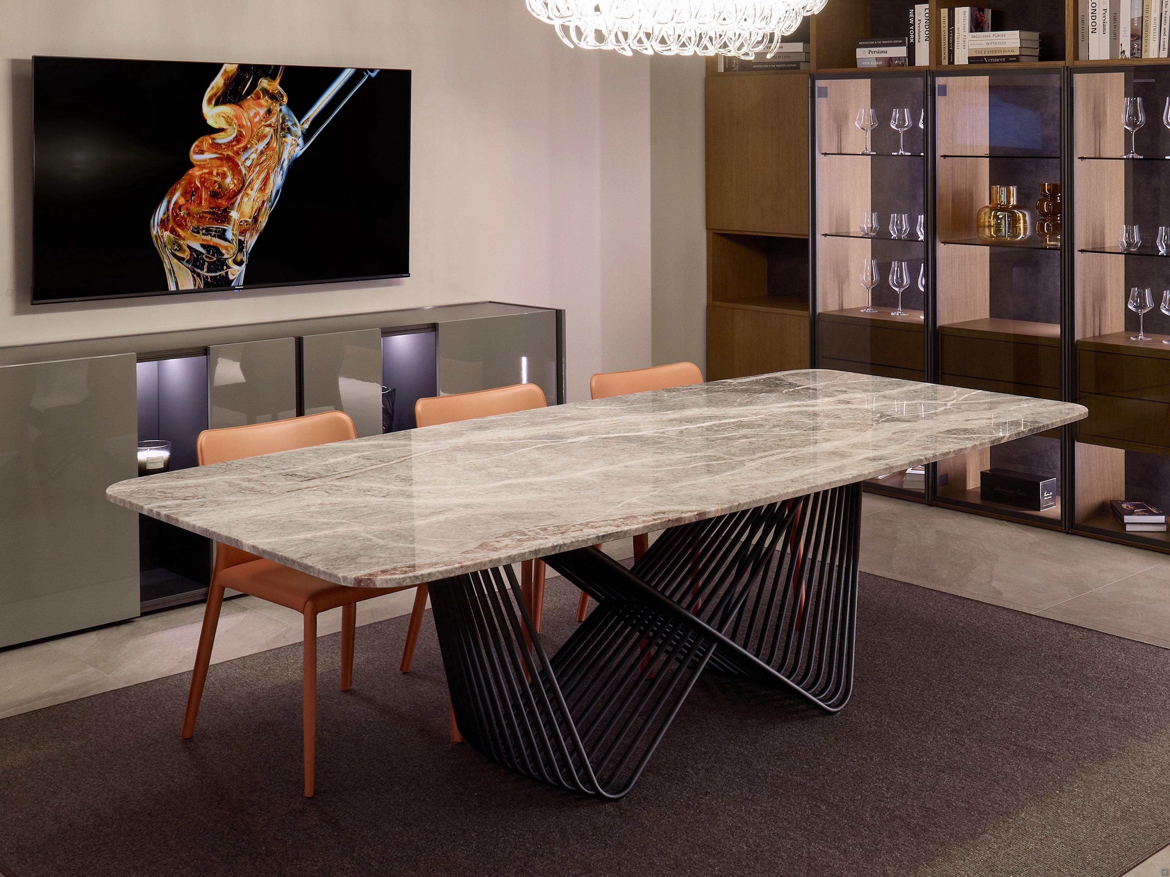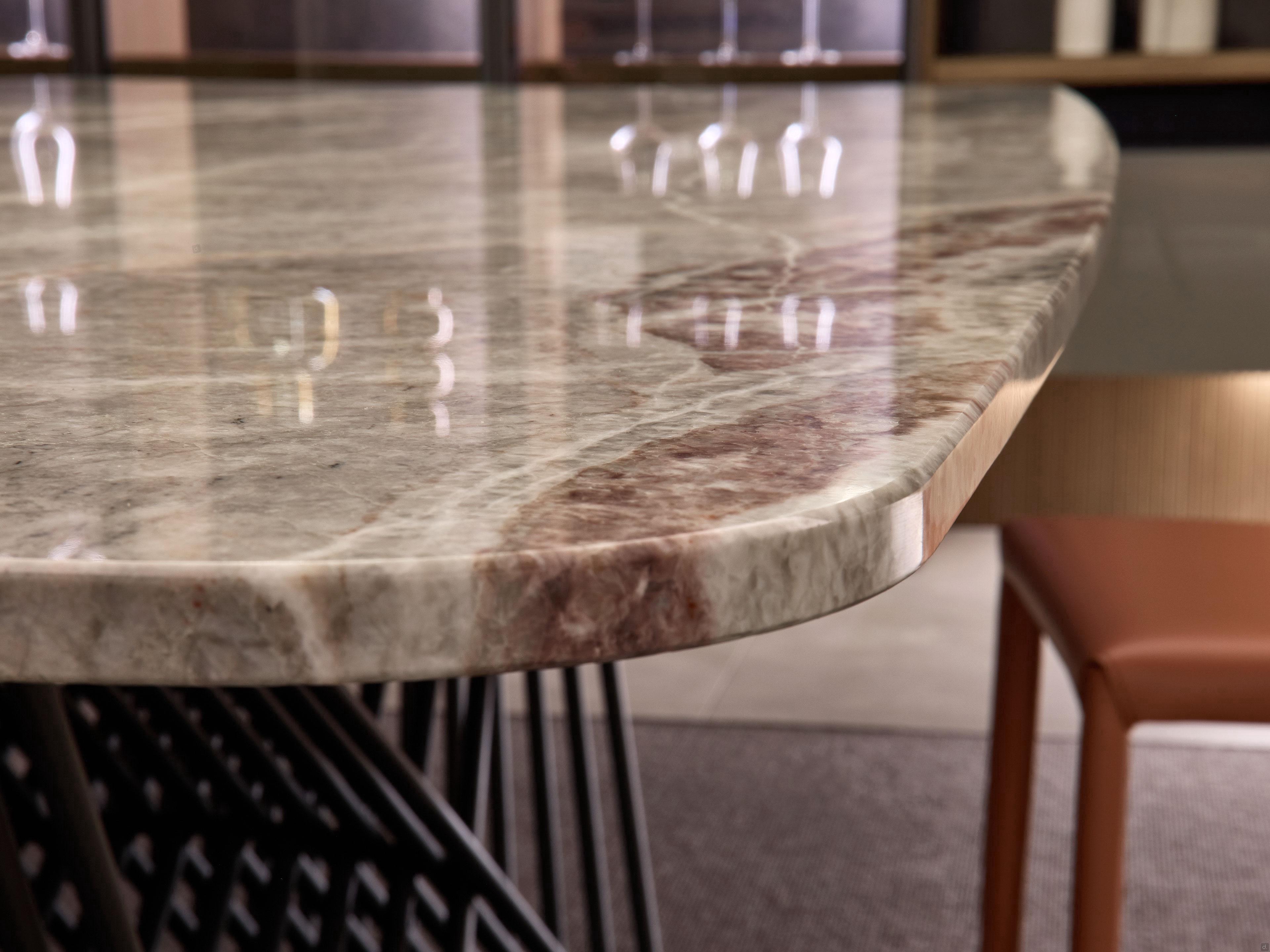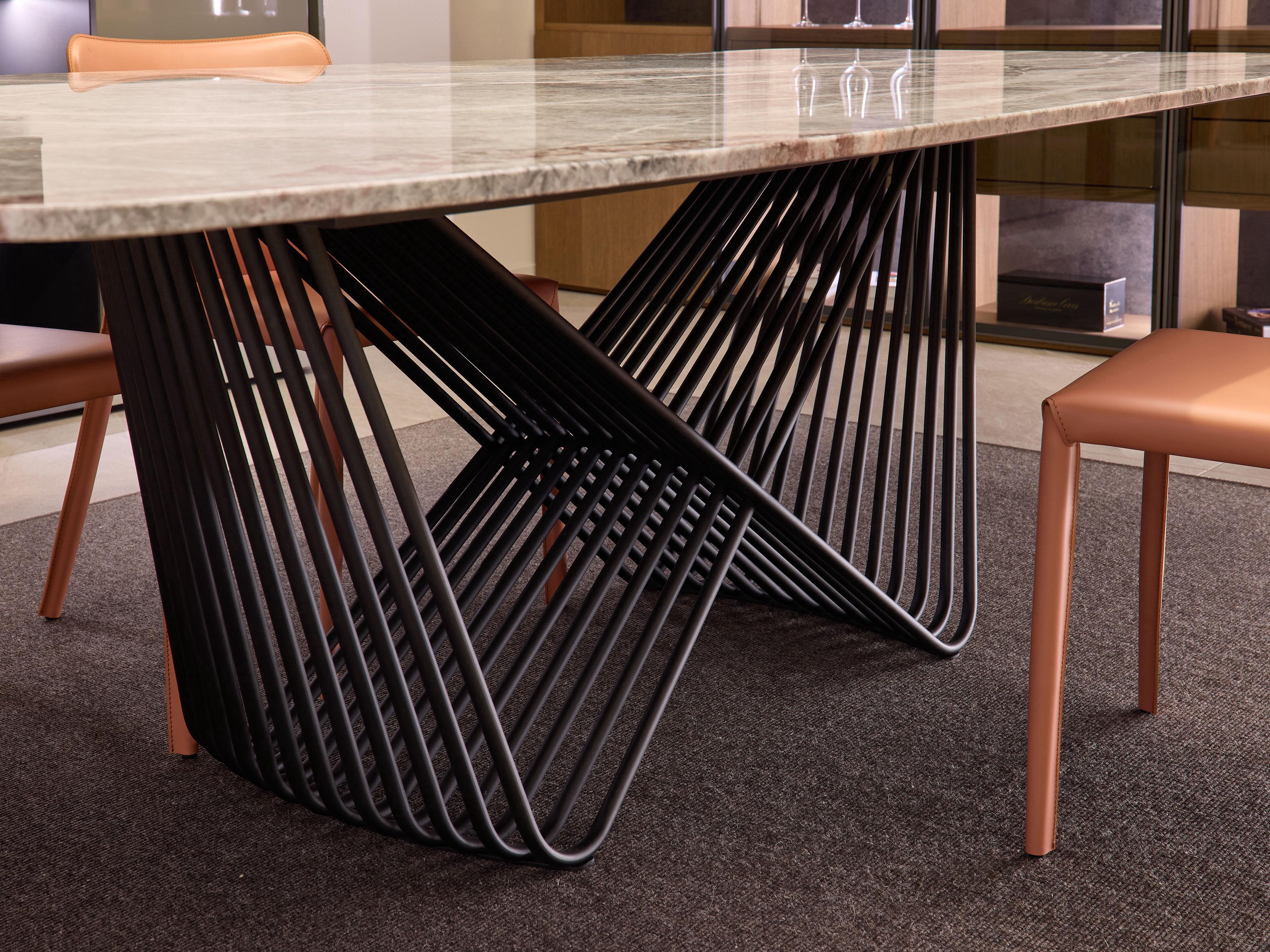 Board outlet is a rectangular table with a tubular metal base distinguished by a charming woven central base and a barrel-shaped top. The top is made of marble in the refined and delicate Peach Blossom finish. The elegant structure of the central plinth gives lightness and personality to the living room table, enhanced by the particular dynamism created by the dense metal weave. Board outlet finds its perfect placement in living areas with a modern and refined design.