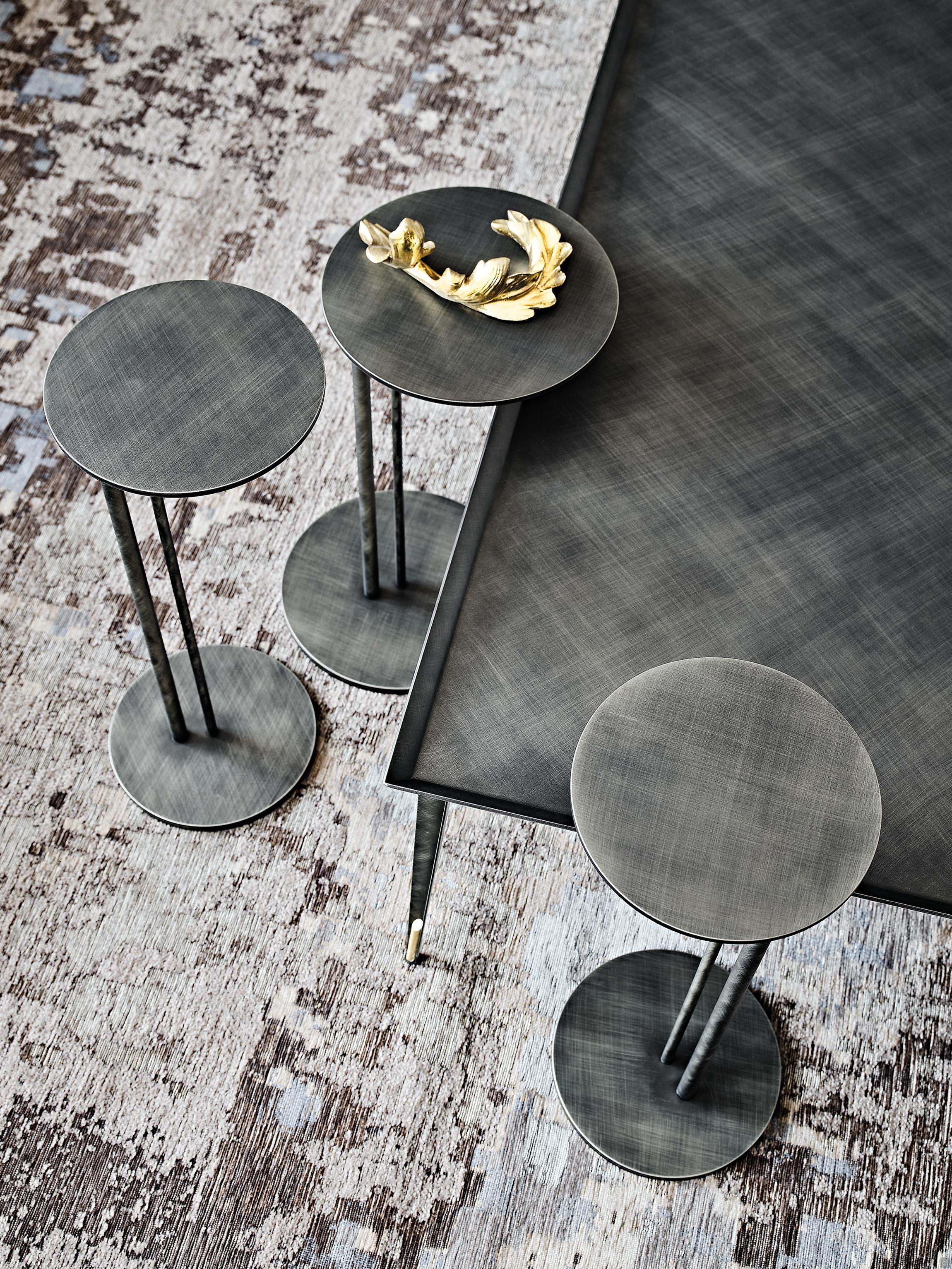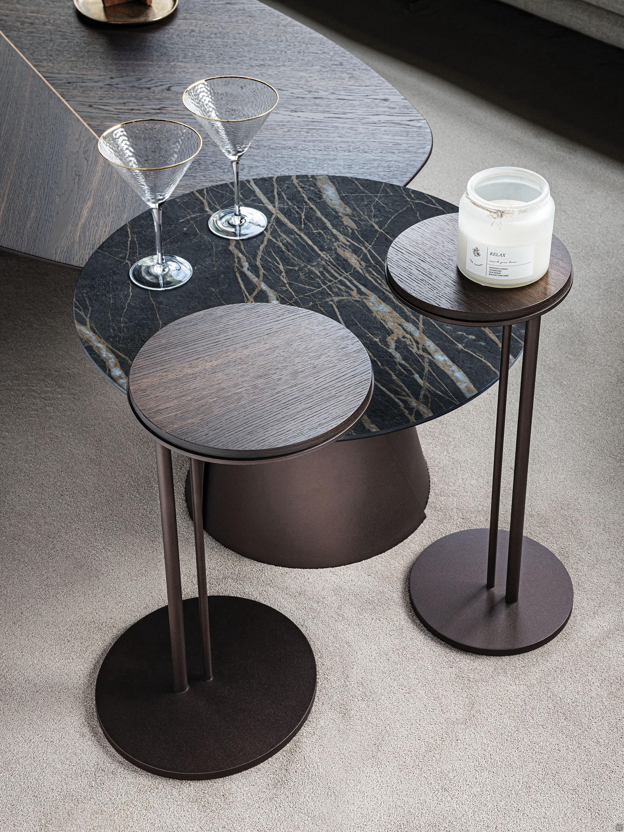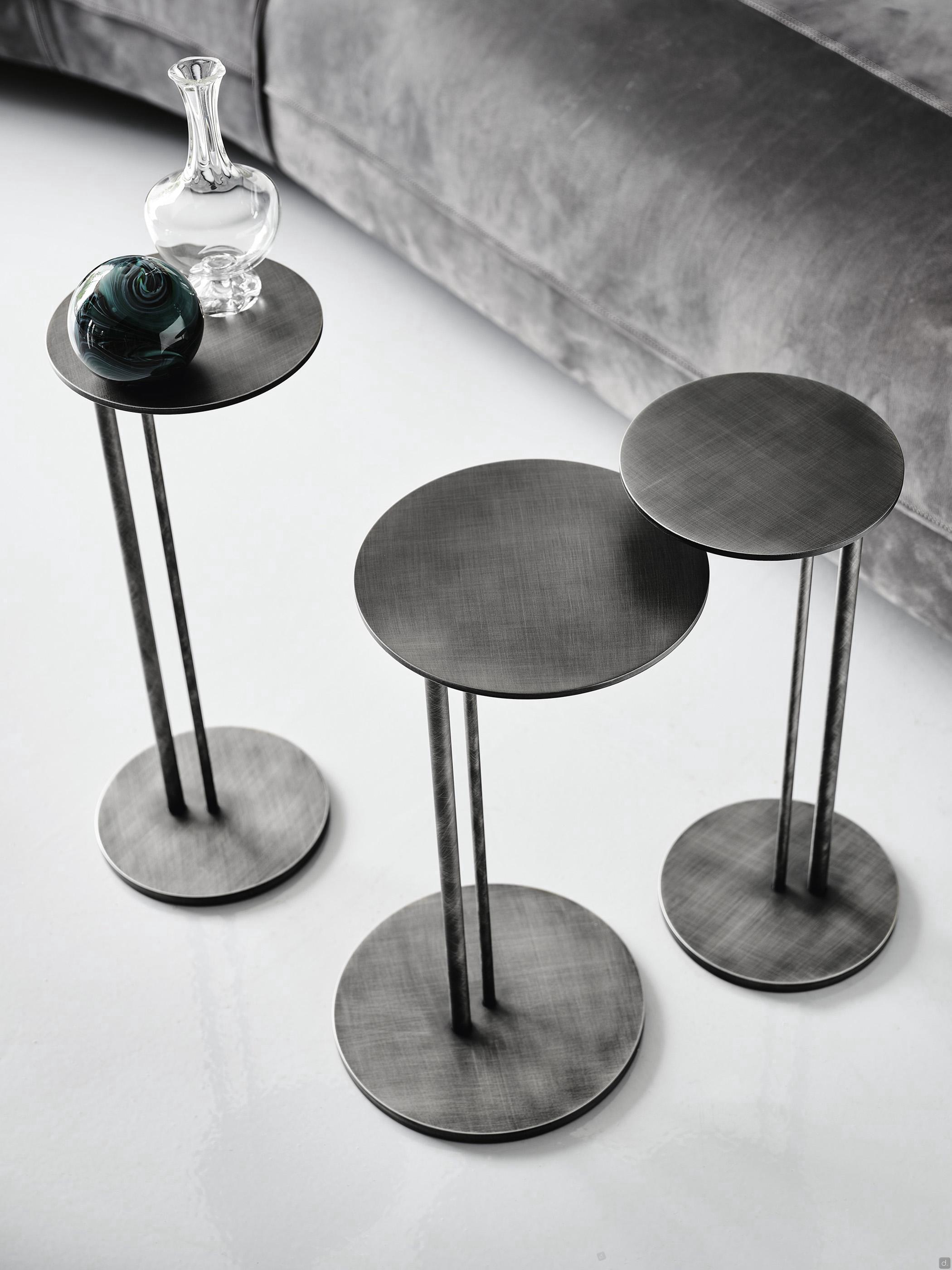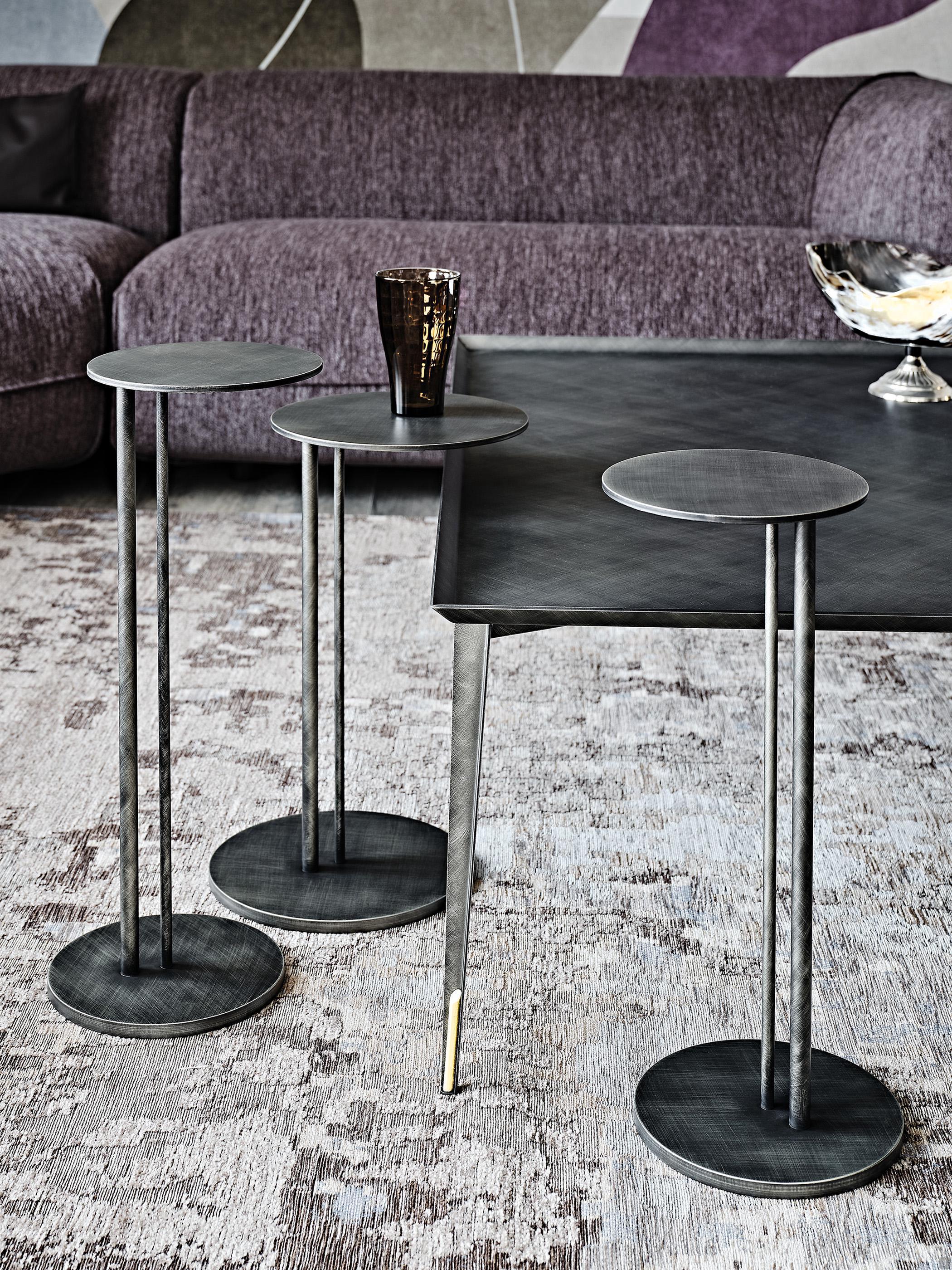 Sting round side table by Cattelan. Slim sofa tables single or as a composition with overlapped heights. Ceramic stone top or brushed bronze.