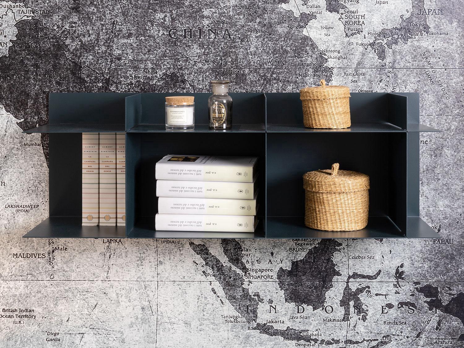 Plan Metal is a sideboard in lacquered metal sheet with backing available in 4 measurements in different matt nuances, to be positioned in horizontal or vertical depending on the user during the assembly phase.The essential design is valued by the functionality of the shelves and of the dividers, which make it perfect to furnish equipped walls. Additionally, Plan Metal gives the possibility to create customized compositions putting aside modules of different measurements, orientation and model.