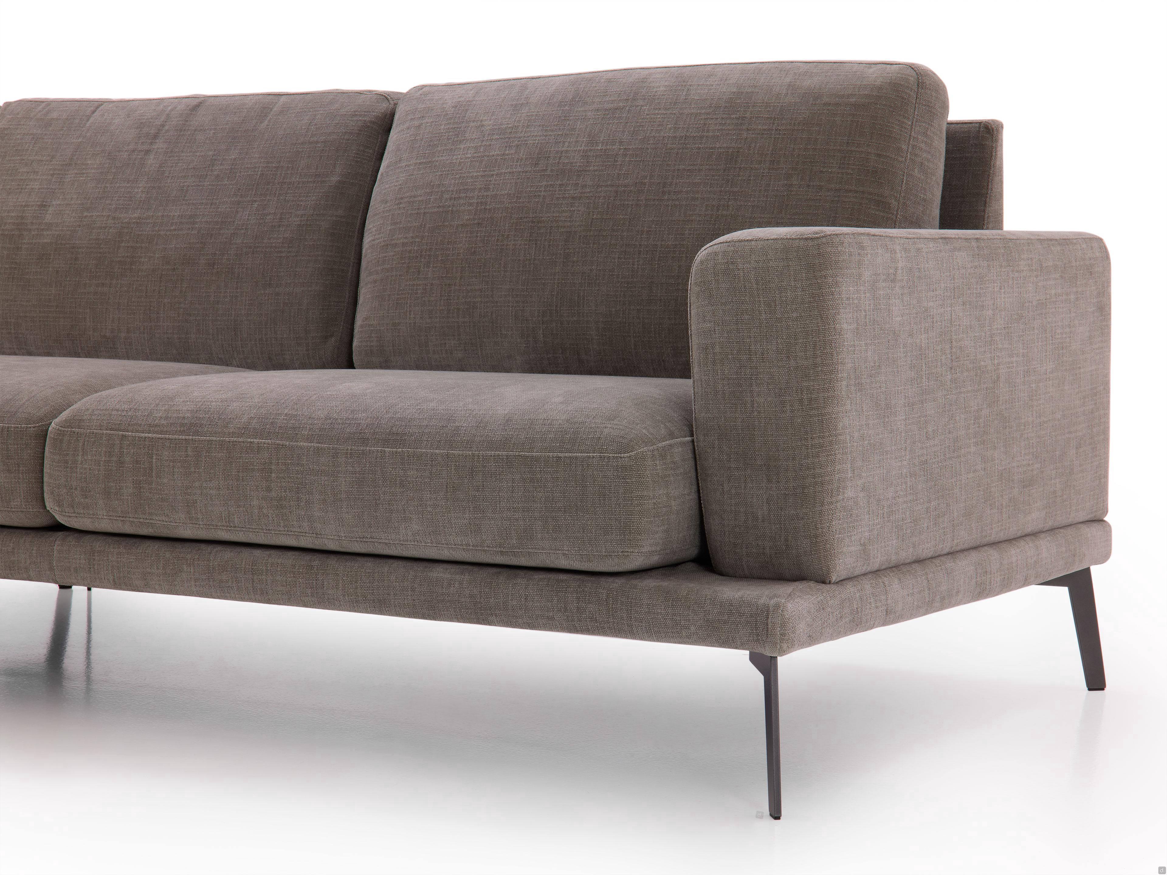 Agadir outlet is a sofa with chaise longue that stands out for its modern and essential design, where a few well-cared-for details stand out, and the concept of lightness conferred by the slender, anthracite-painted metal feet.The high manufacturing quality allows the sofa to be placed not only on the wall but also in the centre of the room. The shapes are simple and rigorous, characterised by the high back and armrests, enhanced by the stitching that always matches the chosen upholstery: the back with variable section tapering upwards and the armrest recessed with respect to the depth of the structure certainly contribute to making the sofa unique. The seats are upholstered in non-deformable foam, combining comfort and practicality: compared to down, the sofa is always kept tidy, not having to fluff the cushions after use.The fully removable cover is made of a soft, water-repellent and stain-resistant chenille-effect fabric.