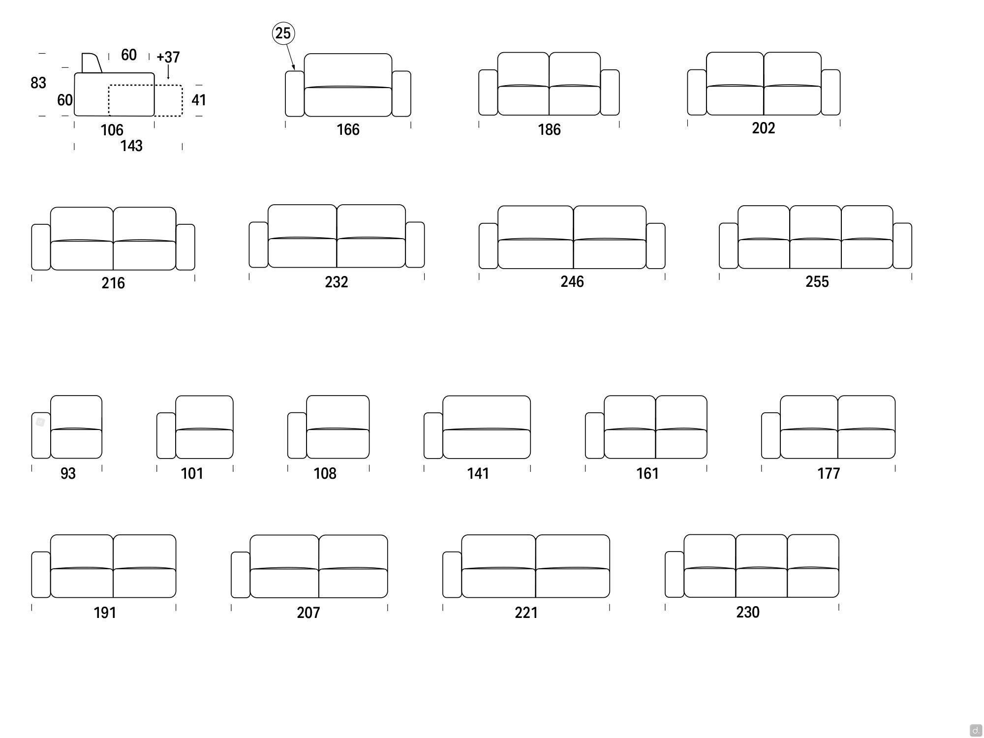 Model and MeasurementsView available elements and measurements in the ConfiguratorWidth: - armrest: cm 25Depth:- total: cm 106 (cm 143 with seat pulled out)- seat: cm 60 (cm 97 with seat pulled out)- chaise longue: cm 159- dormeuse: cm 195Height:- backrest: cm 83- seat: cm 41- arm: cm 60