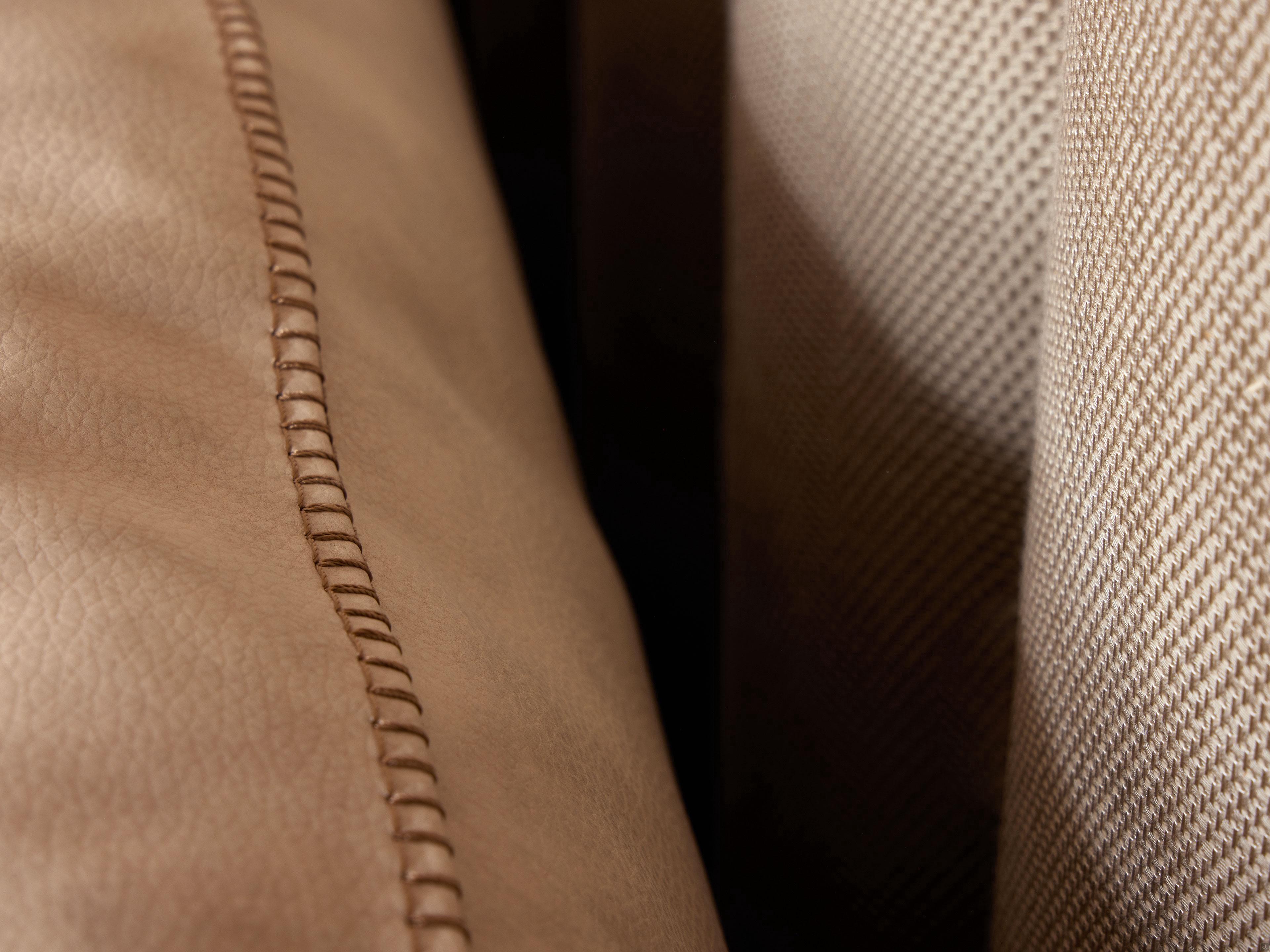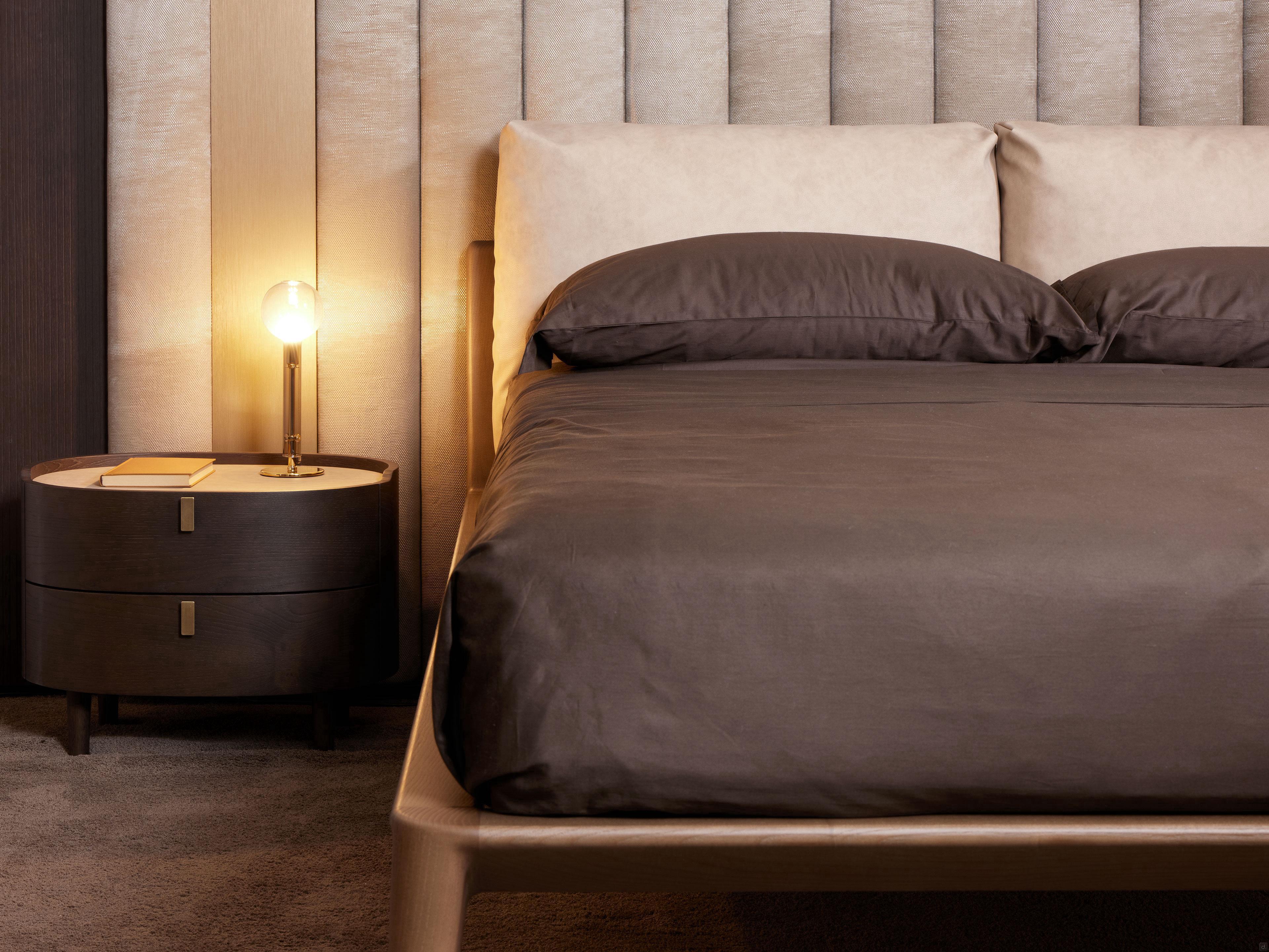 The large, soft headboard cushions rest on the bed base and rise to a discreet height, perfect for offering great comfort while reading. The headboard cushions can be upholstered in various finishes such as fabric, imitation leather or leather. The graceful embossed outer stitching in horse stitch is discreetly visible, running along the back sides of the cushions; you can also choose the colour, thus creating delicate contrasts. This decorative detail makes the Aries bed even more valuable, especially for a centre position in the middle of the room.