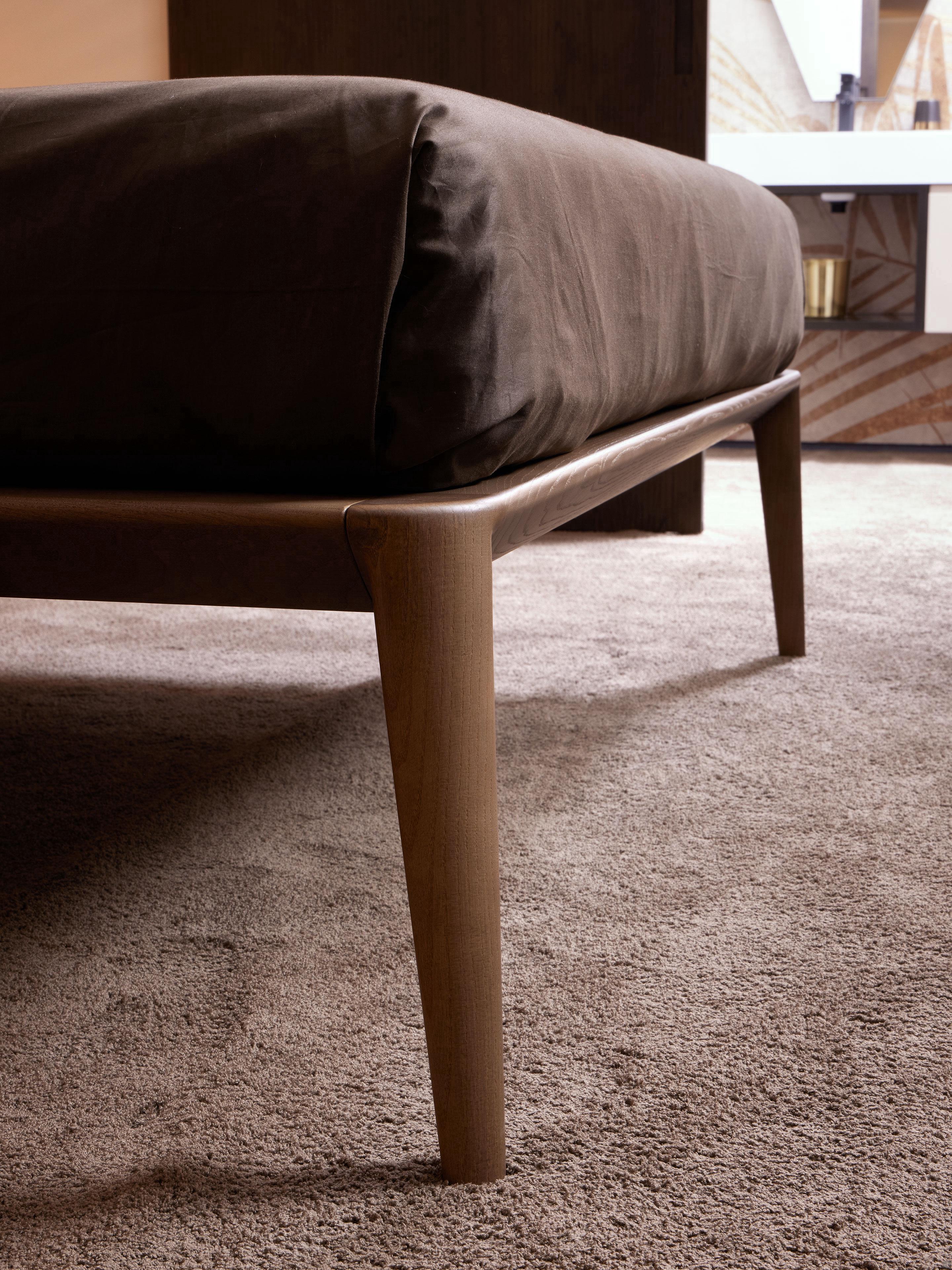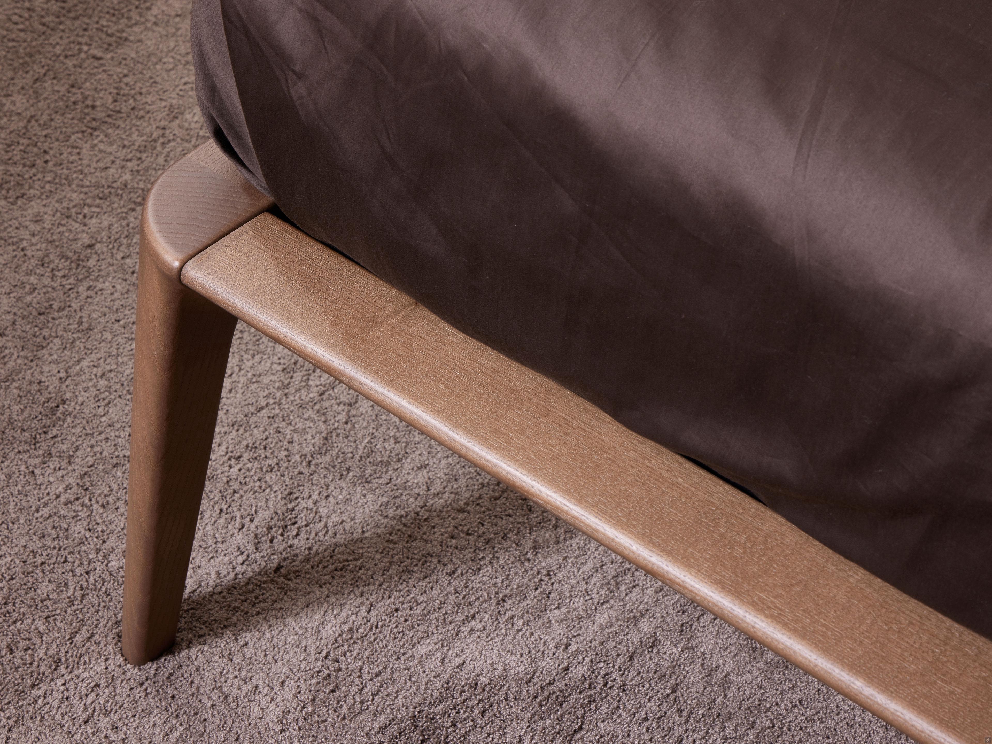The solid ash bed with cushion headboard Aries catches the eye from the first glance, thanks to its generous and harmonious shapes. The bed frame is made of solid ash, also in a worn oak-effect finish, with great attention to detail. On the sides, the special flaring processing is clearly visible, which harmonises and lightens the joints between the frame and feet, thus creating a pleasant play of simple, continuous lines. At the back, the headboard develops upwards, completed by the rounded upper crosspiece, leaving a large exposed section on which the cushions gently rest, creating a pleasant "lightness" effect.