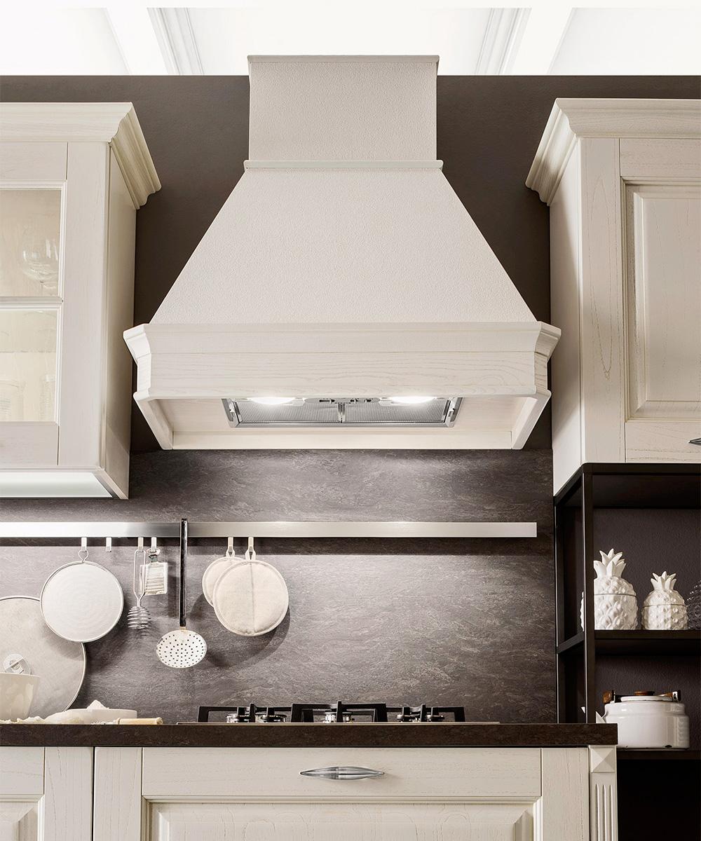 Twenty 02 is a classical linear kitchen with a wall-mounted decorative hood matching with the bespoke white pickled solid wood furniture. They are combined with a contrasting lava stone effect top and splashback and the anthracite painted metal frame of the open column.