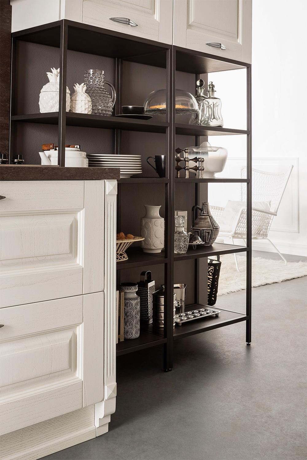 Twenty 02 is completed with the elegant glazing bar showcases and interior lighting, and also the characteristic anthracite painted metal frame of the open column topped with two cupboards, to give a pleasing full-empty effect.