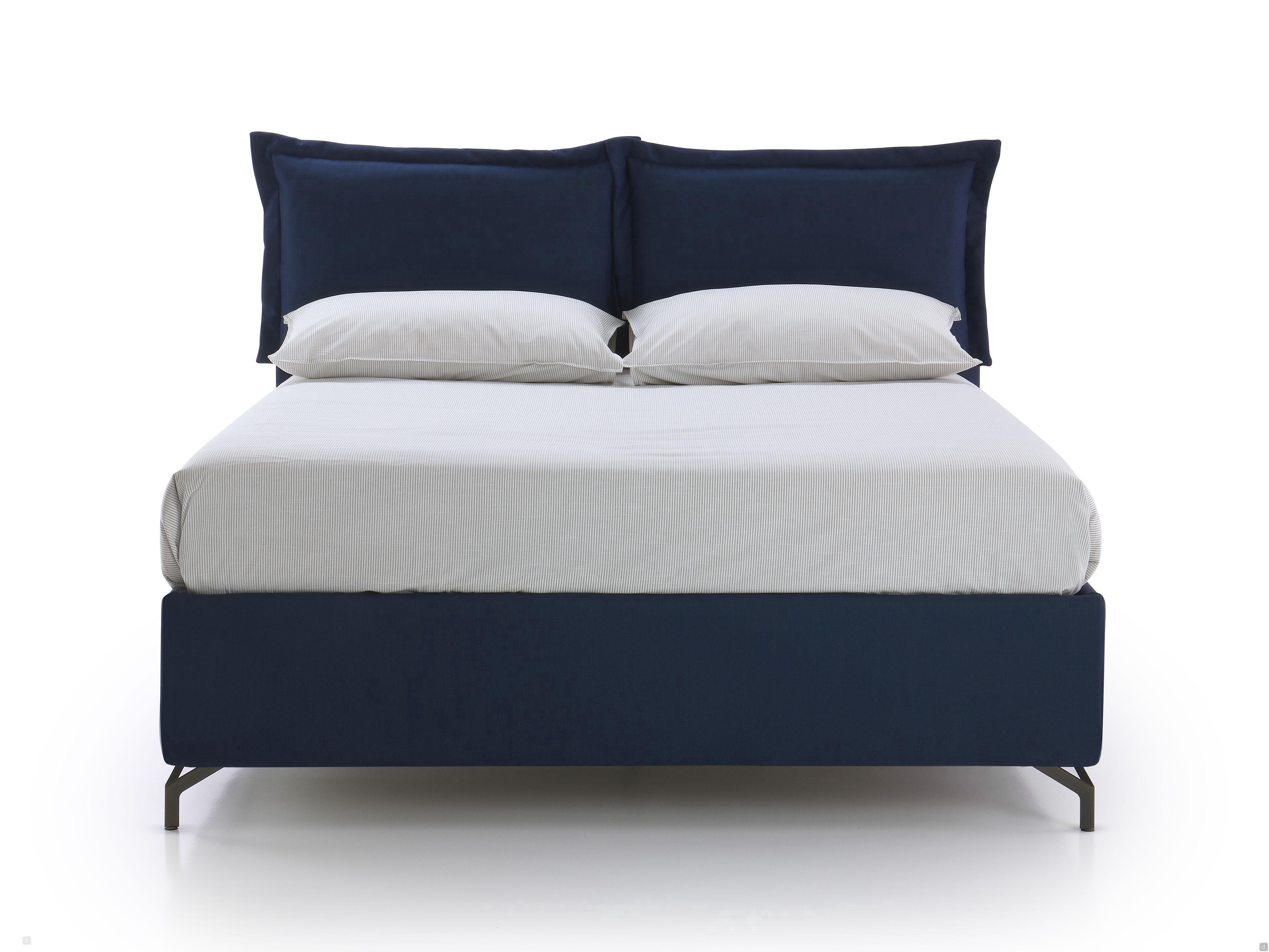 MilleLetti outlet is an upholstered double bed with electric box and removable fabric cover.The headboard with applied cushions is only 4 cm thick, making this model a real space-saving solution that is also ideal for compact rooms.The storage box, with reinforced bottom for heavy loads, offers ample space to store boxes, blankets and anything else you want to keep tidy. The opening is controlled by a convenient wireless remote control that allows access to the compartment without the slightest effort.The bed is also equipped with a Wood Relax orthopaedic bed base with a wooden frame, consisting of 26 curved and flexible multilayer beech slats, two of which are shaped on each side for a better grip on the mattress, with rigidity sliders in the lumbar area for customised support.The cover of the bed, which is completely removable, is in soft-handle fabric with a slightly melange weave in an elegant blue colour.