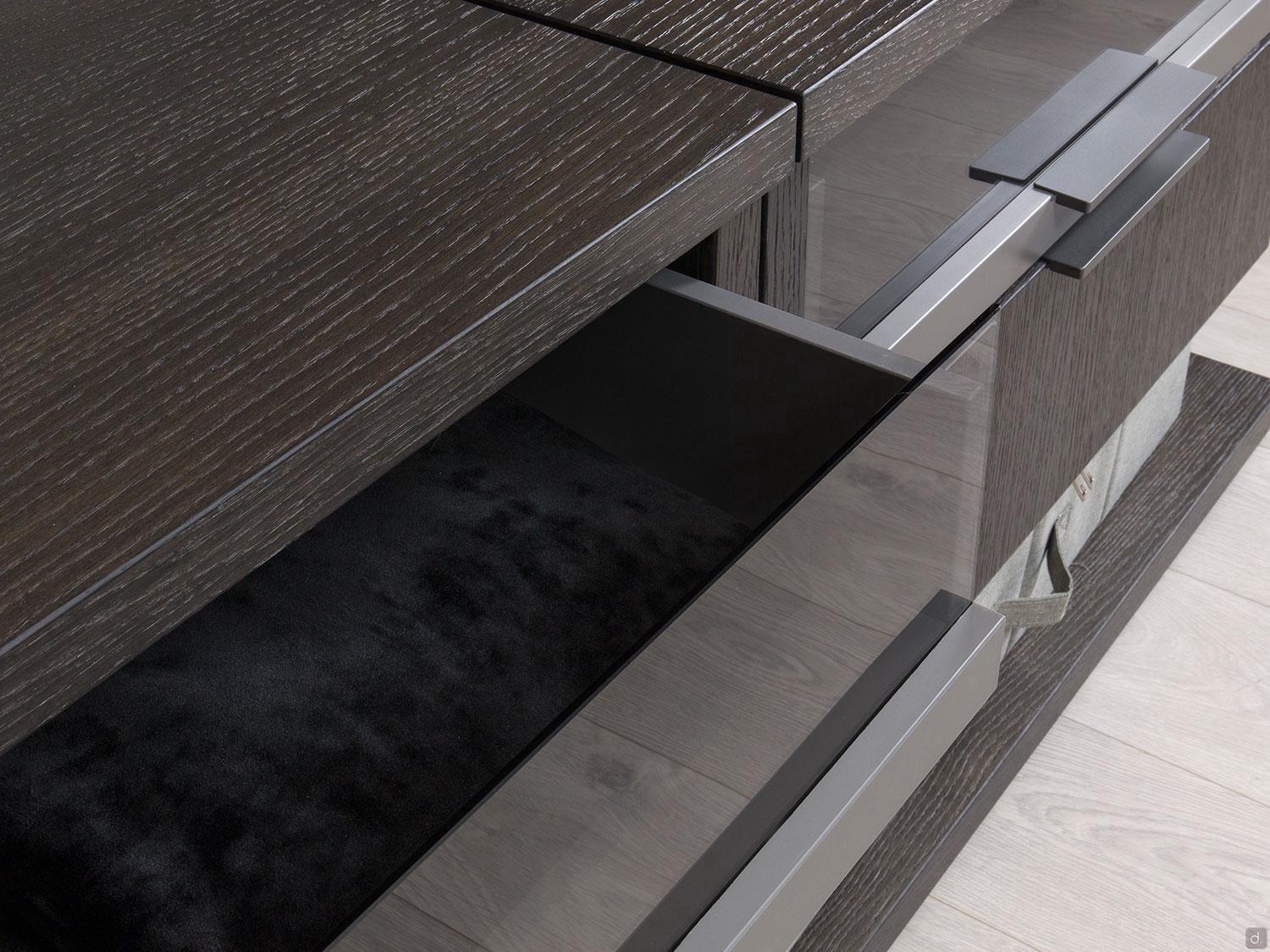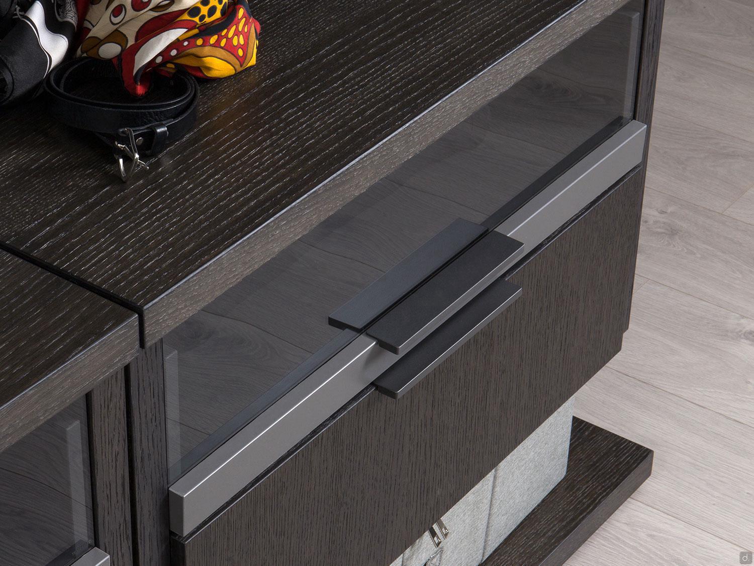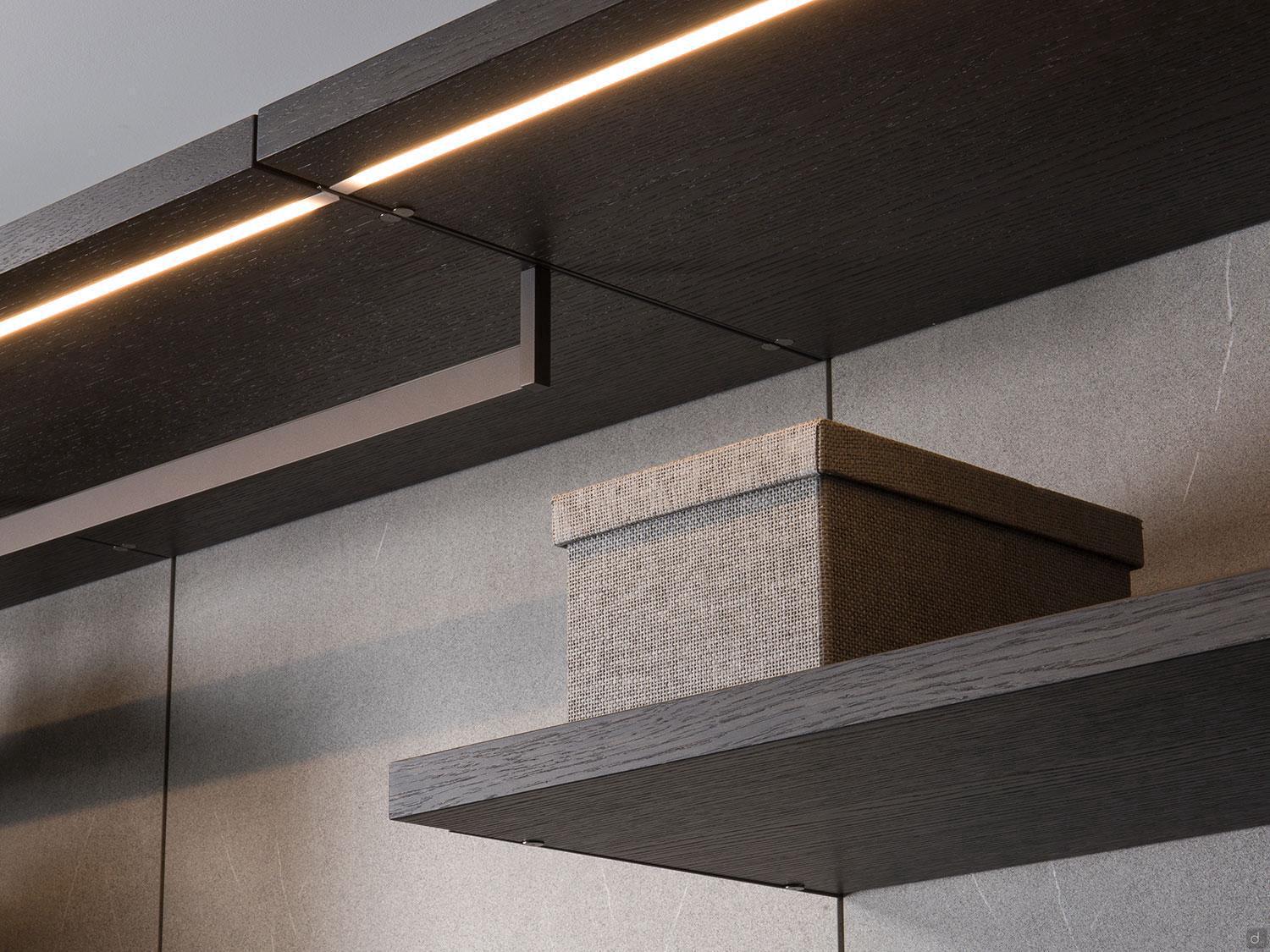 The Bliss Player outlet is a U-shaped boiserie walk-in wardrobe with a practical and functional rack system.It is offered in an elegant double finish: the back panels in Piasentina stone-effect melamine are matched with fittings made of Fashion Wood Coal Oak. Bliss Player outlet is equipped with a floor bench, suspended drawer units, rasters with fabric-covered containers, shelves and hanging tubes for excellent organisation of space. The upper shelves are equipped with LED bars milled into the underside that provide even, uniform lighting. One of the back panels is also equipped with an inspectionable compartment with flap opening that allows access to any electrical panels located in the wall behind.