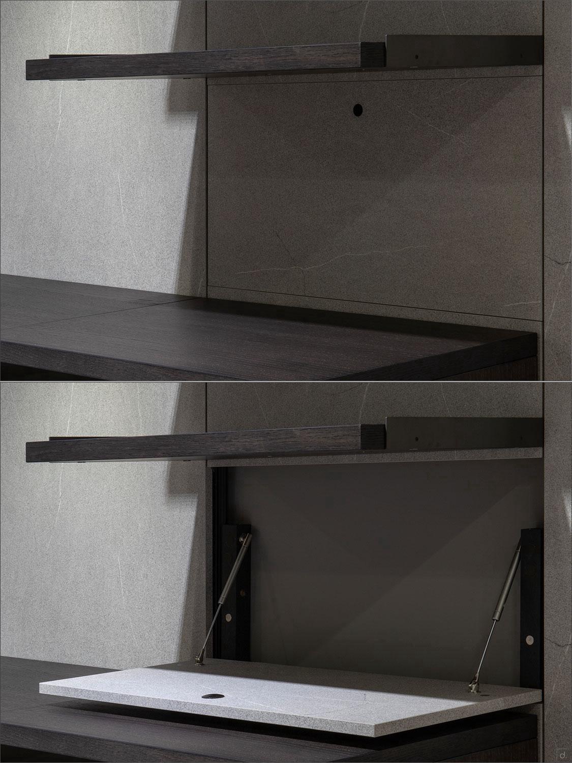 Measurementscm 238,4 d.57,6 h.255,1Materials and Finishes- panels: Piasentina stone effect melamine - fittings: Fashion Wood Coal Oak- brackets and tubes: Moka Shine painted metalAssembly TipsTo assemble the wardrobe you need- in width cm 0.6- in height cm 1