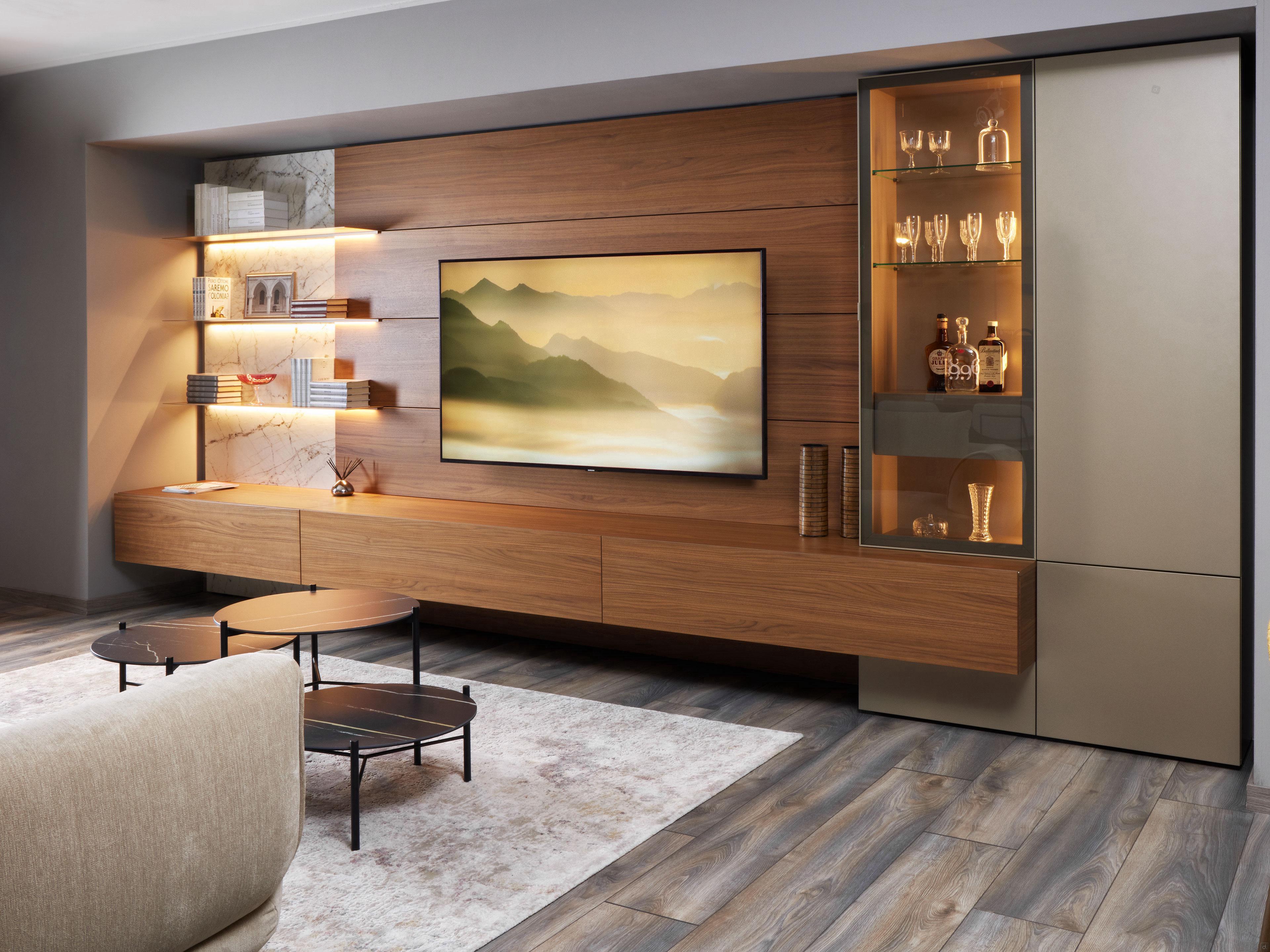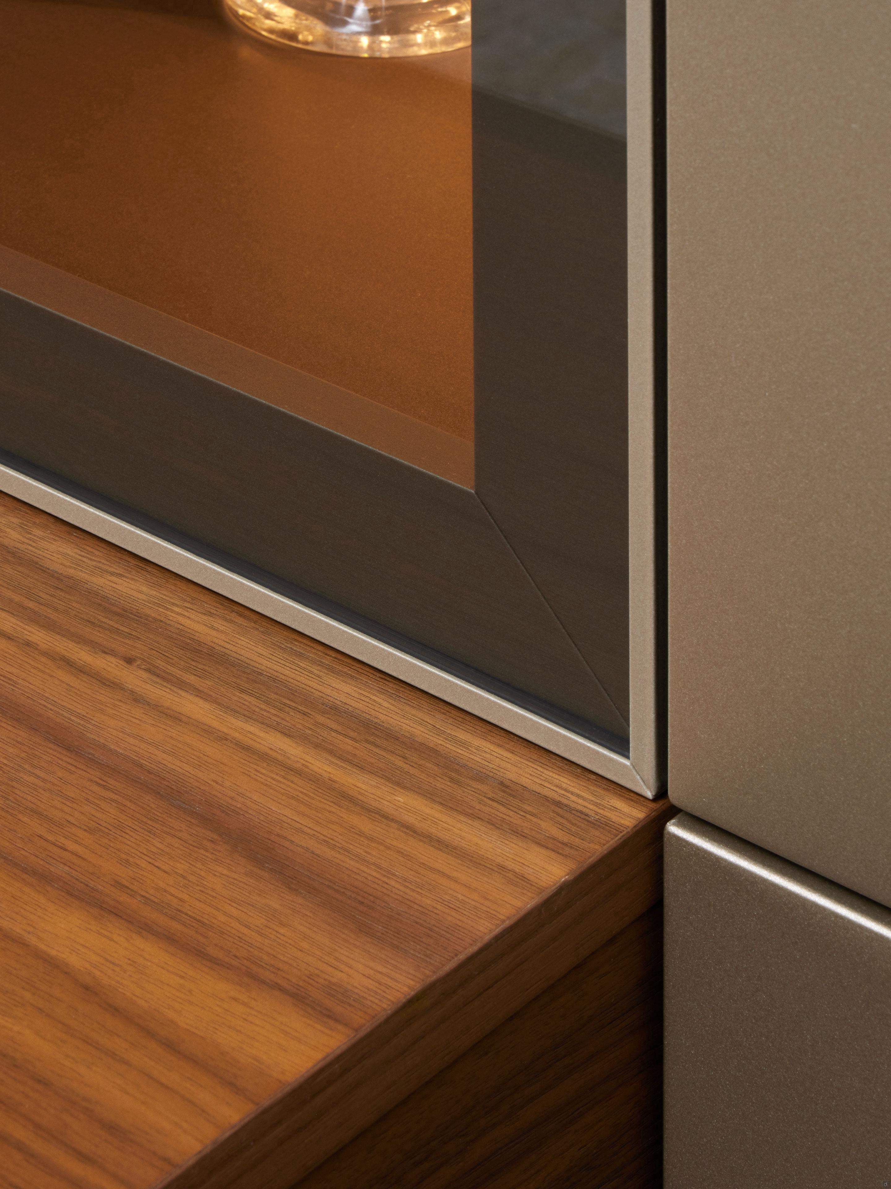 Struttura e Frontali Basi, Vetrina e Colonna Battente: realizzate in pannelli in particelle di legno cm sp.2. Rivestite con nobilitazione sintetica anche laccata opaca, lucida, metallizzata o con piallaccio di legno verniciato. La laccatura lucida si intende estesa solo all'esterno dei fianchi e ai relativi bordi perimetrali. Interno e schiene sono forniti con il corrispondente colore laccato opaco.  Il frontale della vetrina è realizzato con telaio strutturale in alluminio, laccato opaco, metallizzato oppure epossidico. Il vetro è temperato, cm sp.0,4.
