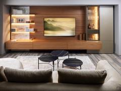Pannelli Boiserie: realizzati in particelle di legno cm sp.2,5, rivestiti con nobilitazione sintetica anche laccata opaca, metallizzata o con piallaccio di legno verniciato. I pannelli in Laminam vengono invece forniti nello spessore cm sp.1,2. Retro pannello boiserie in MDF nero spessore cm 1,9, completo di predisposizioni e ferramenta per il fissaggio a parete. Il pannello mantiene la boiserie distanziata 2,4 cm dal muro e viene sagomato di volta in volta, in funzione degli ingombri della composizione.