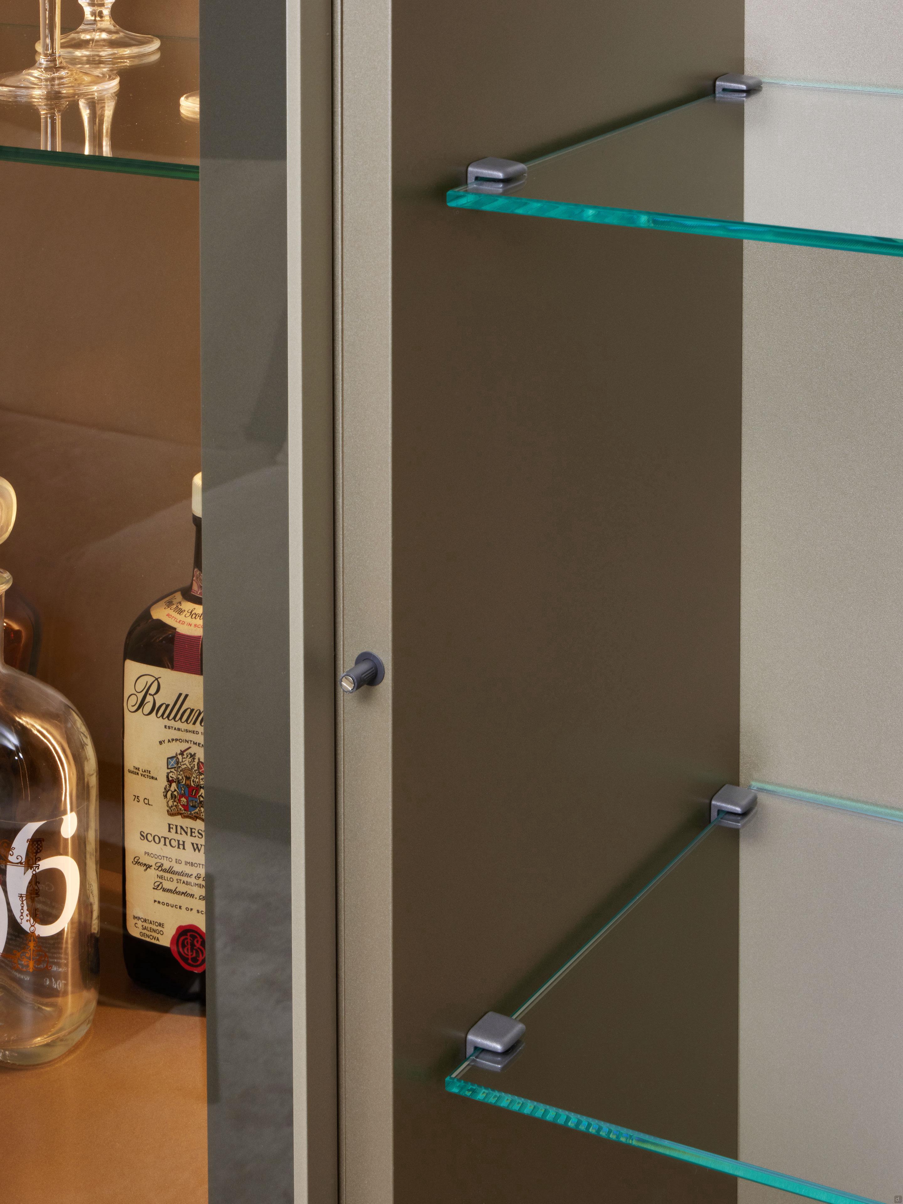 Ripiani Interni: in vetro trasparente, cm sp.0,6. La vetrina ne include di serie 2, mentre la colonna battente 5 (uno nel modulo inferiore, i restanti 4 nel modulo superiore da 160 cm).