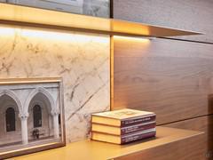 Barre Led sotto-mensola: da 11,6 W ciascuna, complete di alimentatore da 75 W con protezione sovraccarico. Fissaggio magnetico alla mensola, con copertura frontale in tinta alla mensola da 1,2 cm e luce led incassata da 3000K. I pannelli boiserie, così come il retro-pannello in MDF, prevedono di serie una scanalatura per il passaggio dei cavi di alimentazione, che escono sempre da destra (guardando frontalmente la mensola).