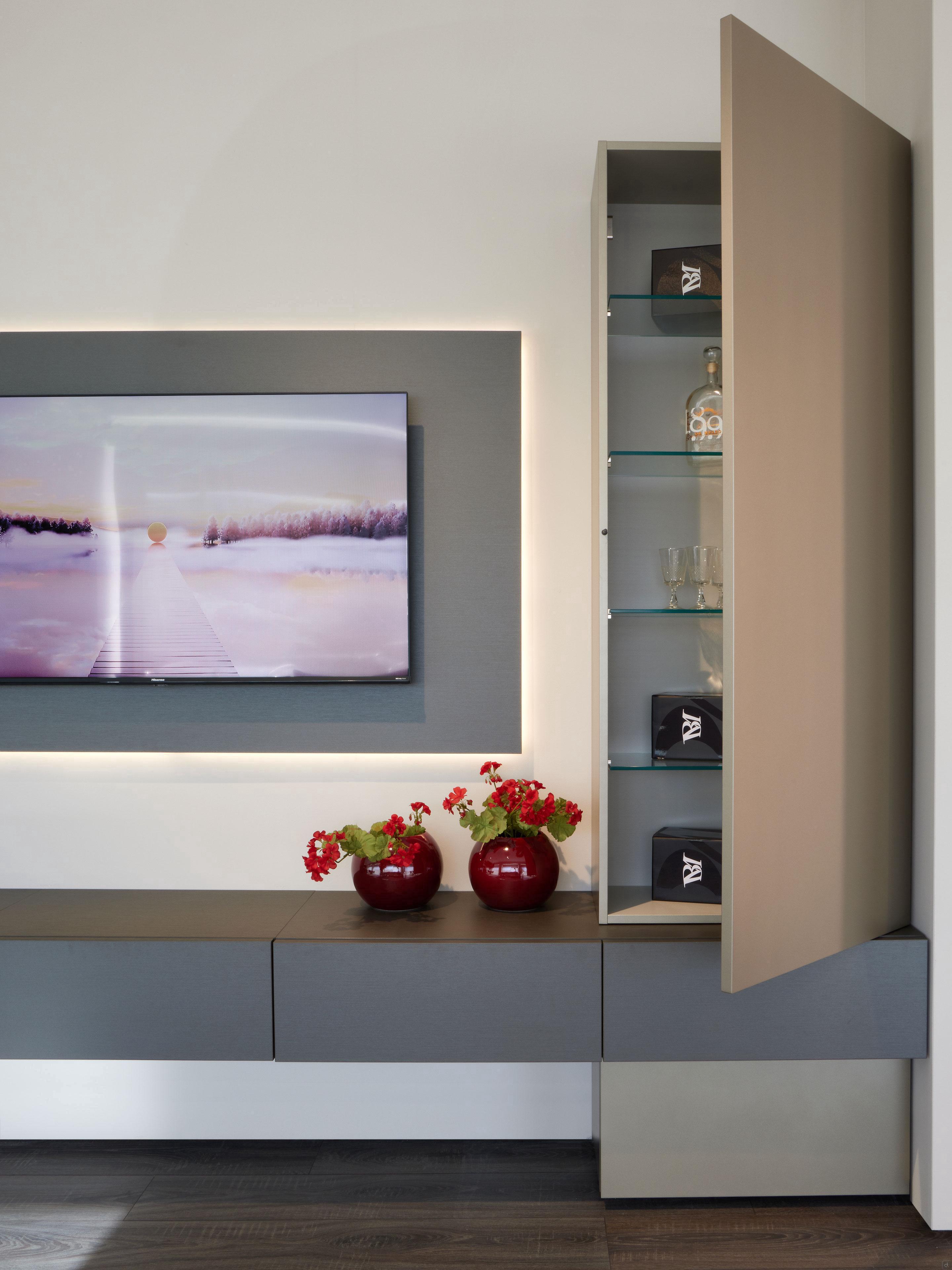 Plan 40 outlet is a wall unit with columns and suspended base units, symmetrically arranged around a TV panel that is also fixed to the wall behind and completed by an optional rear LED frame.Proposed with a double finish: it features base units and TV panel in a textured melamine melamine while the columns are made in a refined metallic lacquer.The Plan 40 outlet wall unit offers excellent storage space; the two side columns are each equipped with four shelves and the five wall-hung base units are fitted with a drawer with push-pull opening, with the exception of the central base unit which has a flap opening.The columns end with a hinged compartment resting on the floor and offering extra storage space.