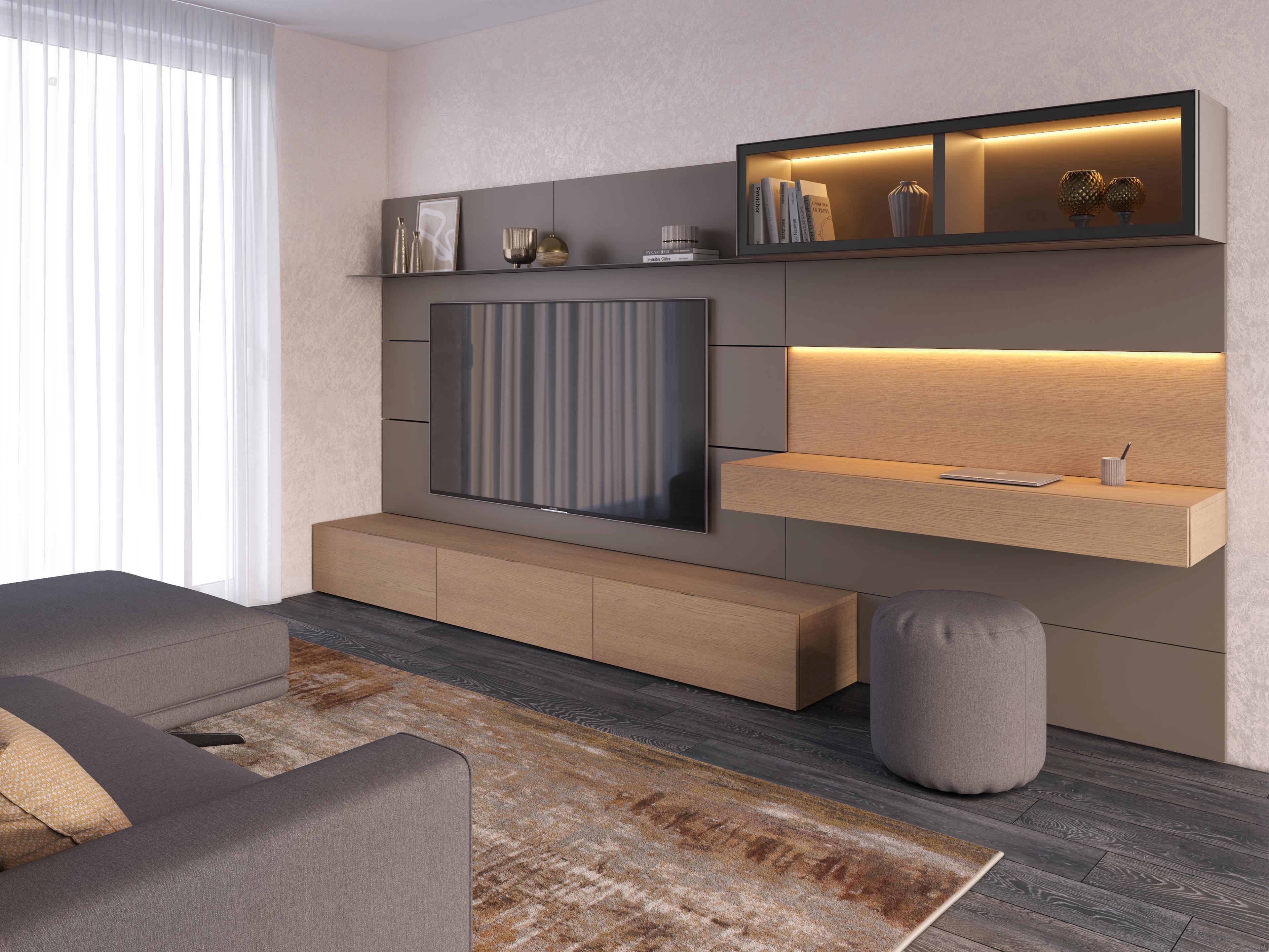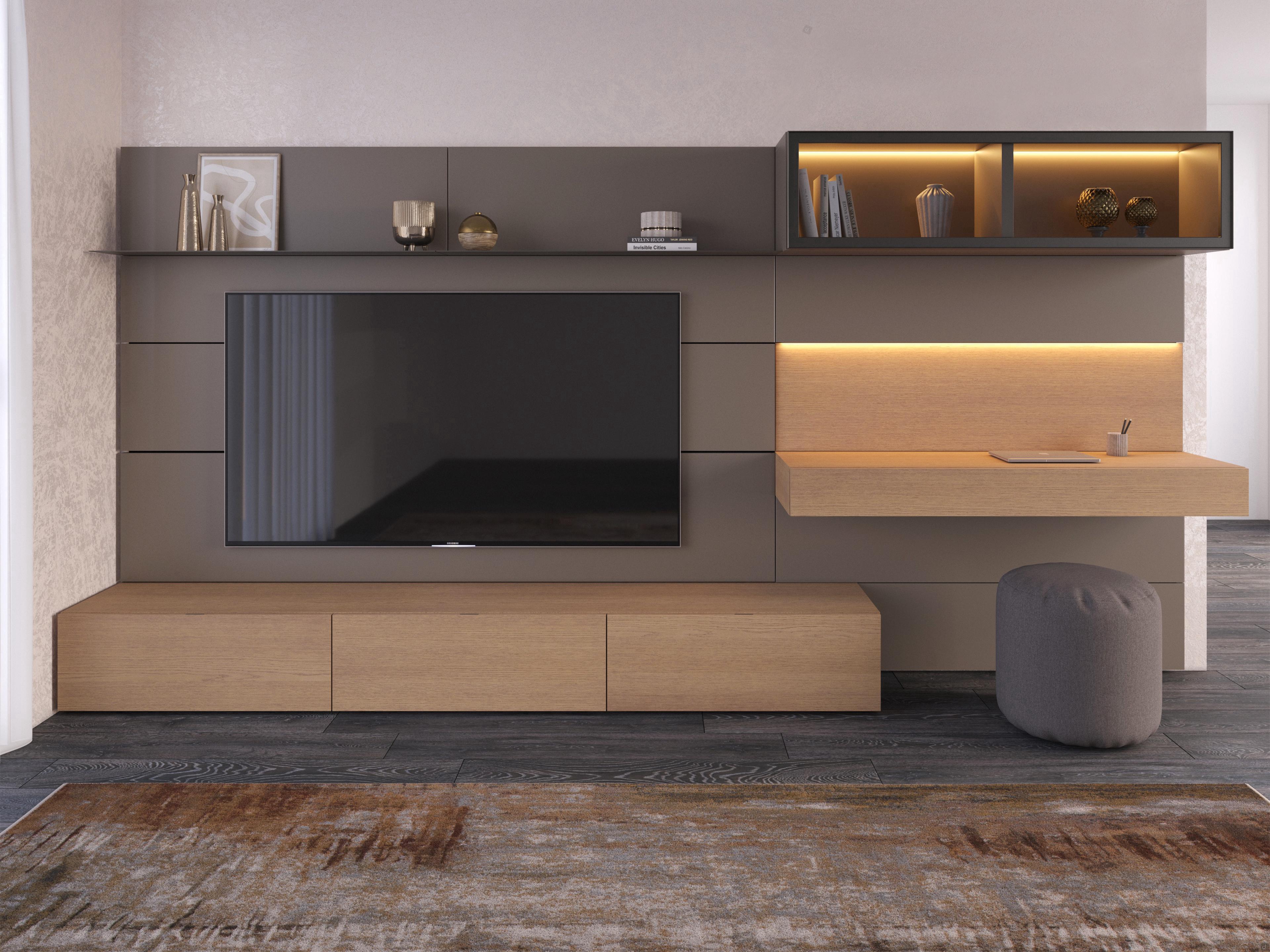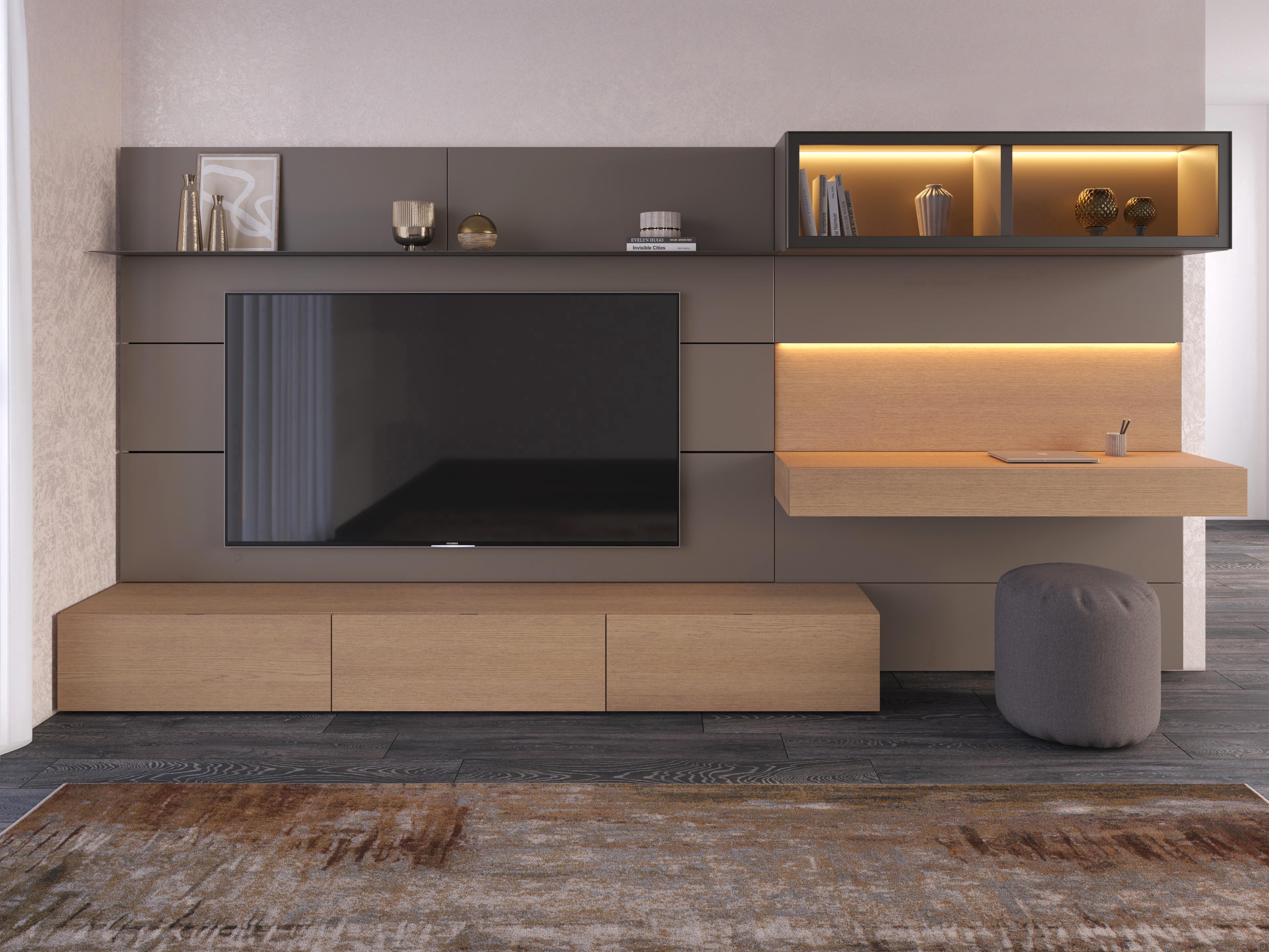 Horizontal built-in Led Bar for Showcase Wall Unit: 11.7 W in the 120 cm version and 14.7 W in the 150 cm version, complete with power supply. Diffused 3000K light, recessed in the top of the wall unit. Remote control lighting available as an additional option.