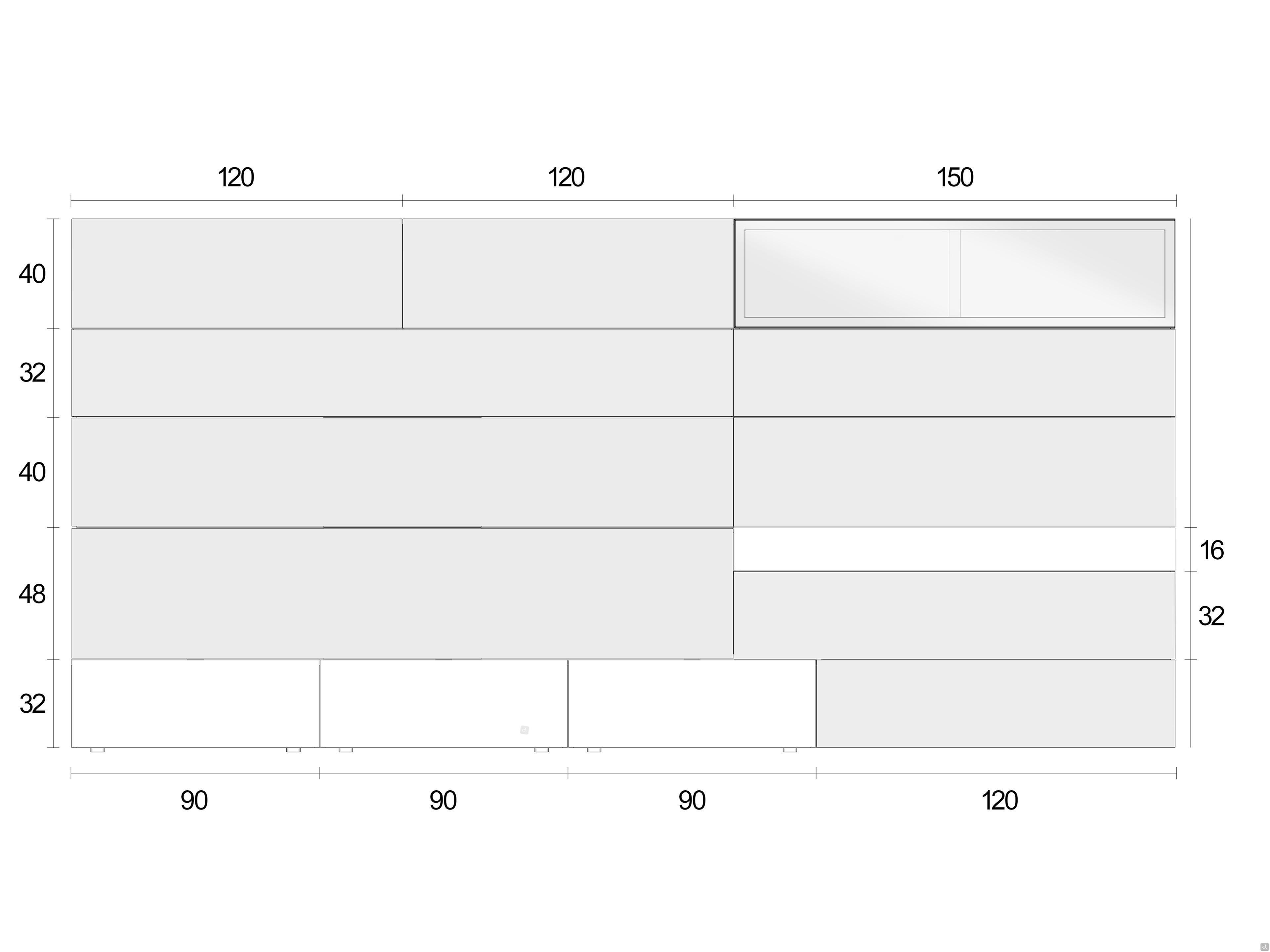 Structure and Cabinet fronts: made of 2 cm thick particle board panels. Coated with synthetic melamine, also matt lacquered, glossy lacquered, metallic lacquered or with varnished wood veneer. The high-gloss structure only extends to the outside of the side panels and their perimeter edges. Interiors and backs are supplied in the corresponding matt lacquer colour. For elements with drawer the interior is always Sketch Rock. The front of the showcase wall unit is made with a structural aluminium frame, matt lacquered, metallised or epoxy lacquered. The glass is tempered, 0.4 cm thick.