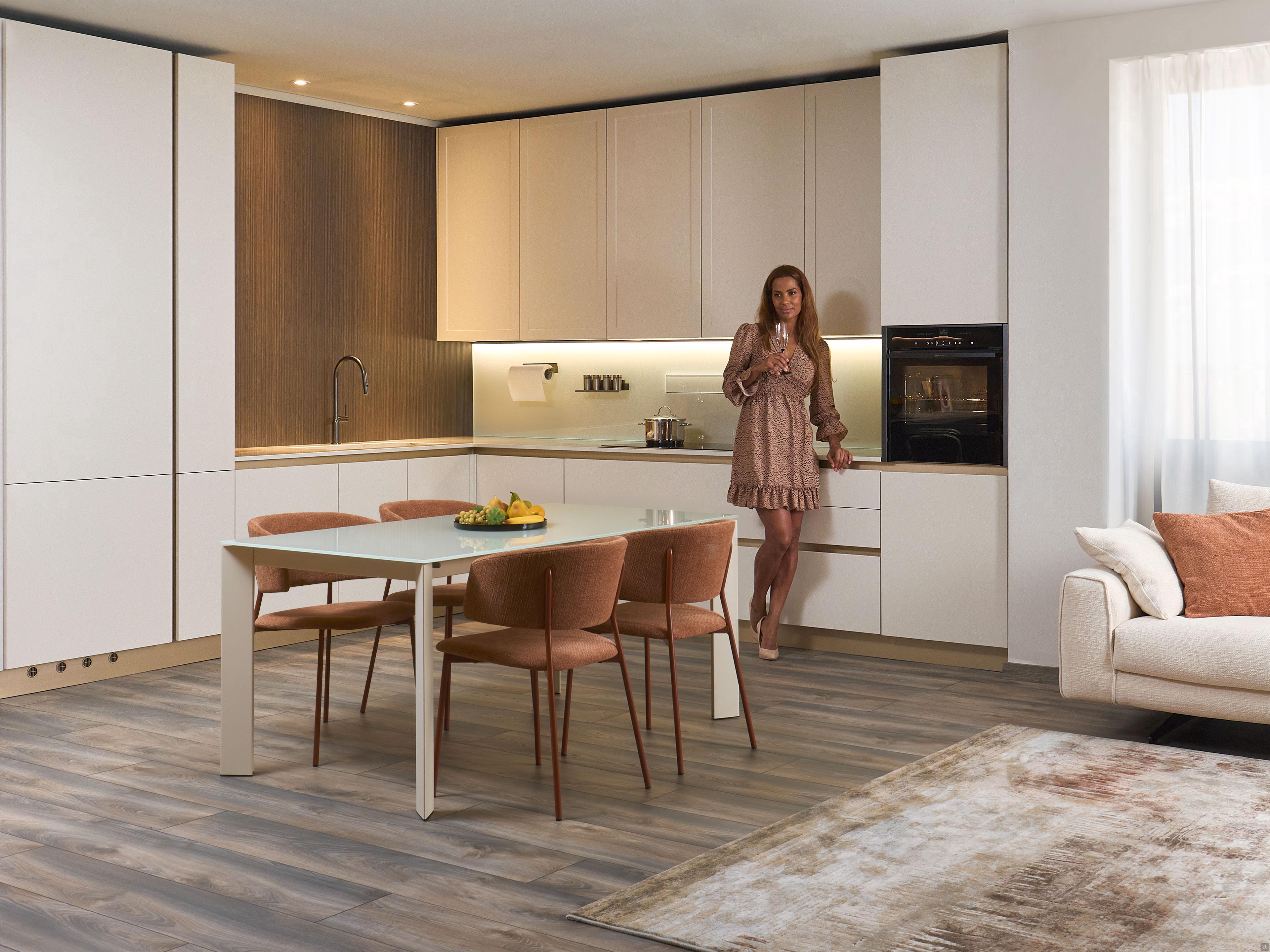 This elegant colour combination of white and gold is also echoed in the worktop, made of Dekton Awake, a special "marble effect" finish that reinterprets the iconic attributes of the precious paonazzo stone and is distinguished by precious light grey, cream, terracotta and rust veins. Dekton is a state-of-the-art material for kitchen worktops, a blend of more than 20 minerals characterised by high resistance to scratches, stains, fire and heat.