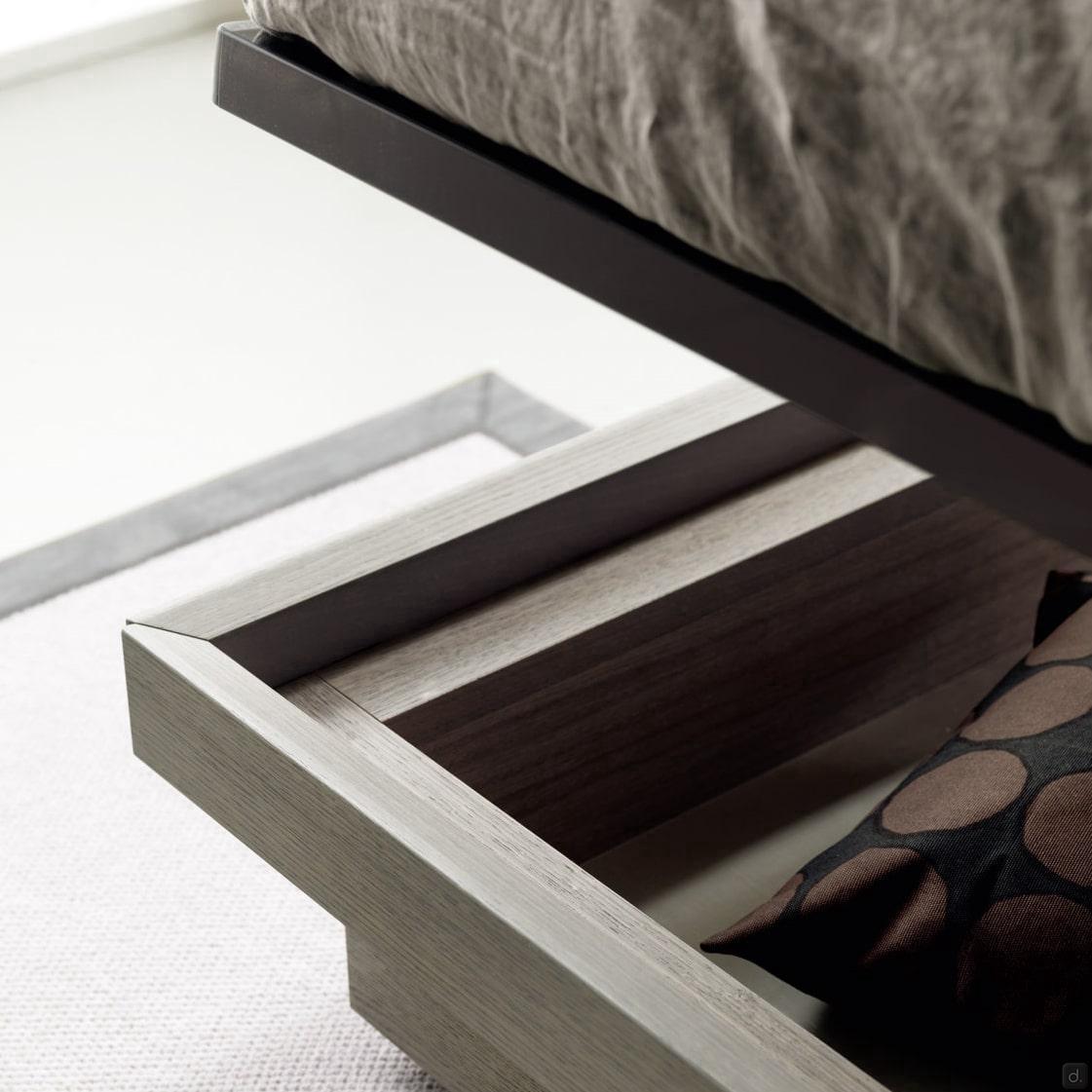 Maryland can be equipped with a big, roomy storage box with double lift-up system a bit recessed compared to the bed surface: this allows you to have a lot of space for bed linen, blankets and winter / summer clothes while still keeping a sleek design.