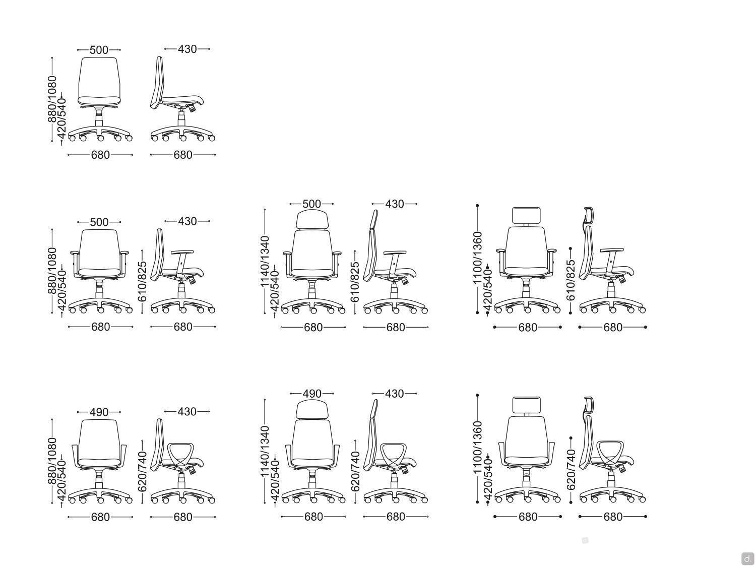 Model and MeasurementsModels: without armrests, with armrests, with armrests and headrestMeasurements: view the measurements in the MenuDepth: - seat: cm d.43Height:- seat: adjustable from cm h.42 to 54- fixed armrests: cm h.20- adjustable armrests: from h.19 to 28,5Note: to calculate the overall height from the floor add the armrests height to the seat height.Materials and FinishesCover:fabric, faux-leatherPromo Cover:- fabric, faux-leatherBase:- polyammide- aluminium