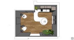 Completeremo l'ambiente cucina/snack inserendo un paio di tavolini e qualche pianta vicino alla porta finestra. La pavimentazione sarà in legno color nocciola.