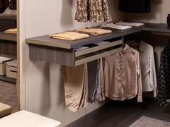 Porte-pantalon extractible : structure en panneaux de particules de bois, finition au choix en mélaminé, laqué mat, métallisé ou chêne à pores ouverts, également disponible avec un plateau supérieur extractible. Cadre métallique en finition marron, en laqué métallique et fond de plateau en mélaminé.
