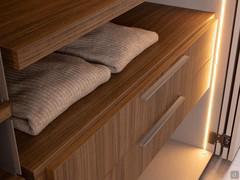 L'aménagement interne de l'armoires Driver Wide permet de personnaliser et de compléter l'intérieur de votre armoire avec des blocs-tiroirs, des étagères, des grilles, des barres penderie et des barres LED. Le choix des blocs-tiroirs est large et complet en termes de modularité, allant d'un seul tiroir à six tiroirs, en passant par les différentes combinaisons de tiroirs de différentes dimensions. Les porte-chemises suivent les blocs-tiroirs dans leur finition, avec des éléments métalliques et éventuellement des boîtes de rangement en tissu. Des barres verticales de LED en polycarbonate opalin, délicatement insérées dans le fraisage, diffusent la lumière de manière homogène et agréable.