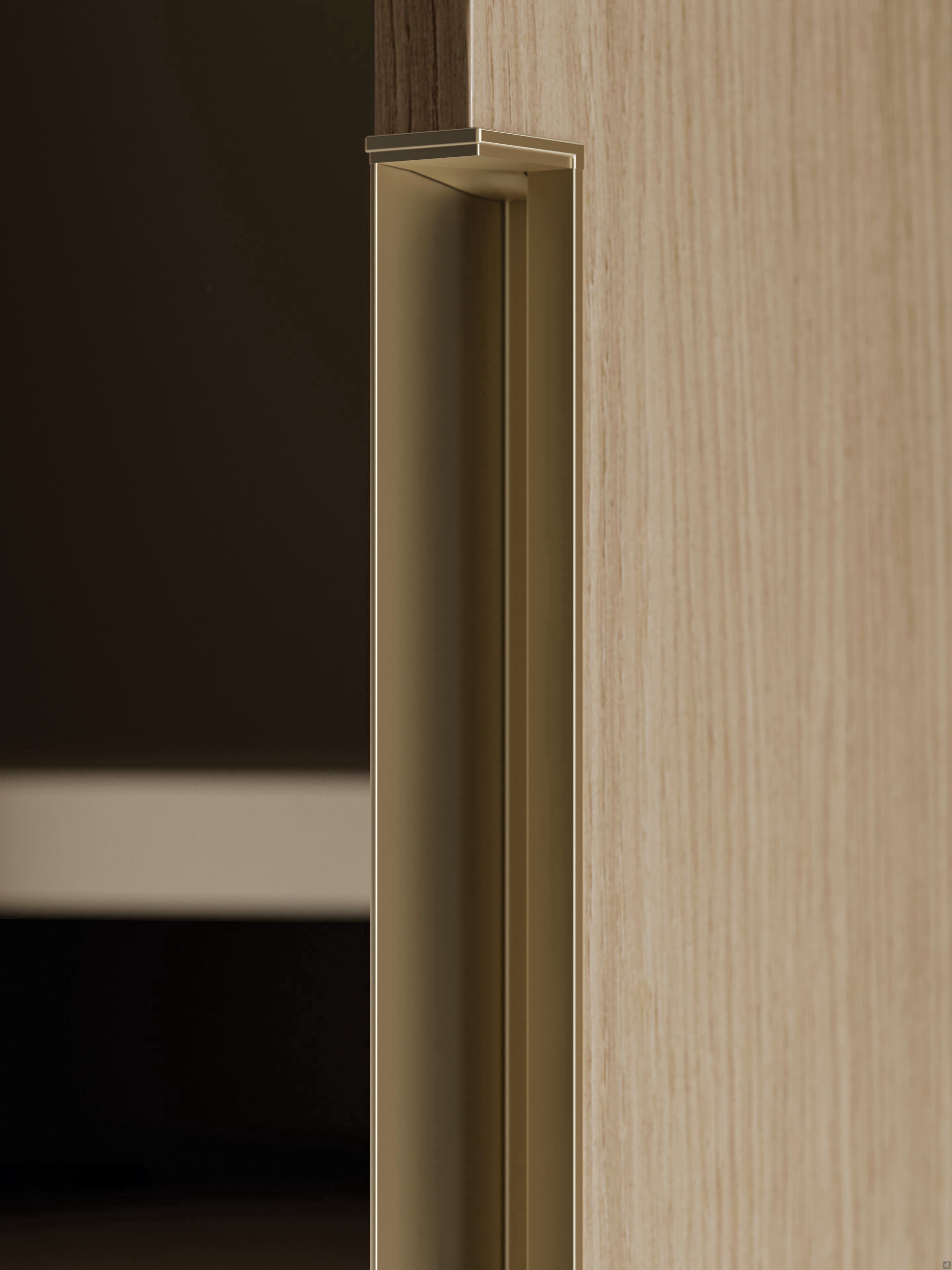 Midley est une armoire à portes battantes avec poignée laquée, disponible avec une ouverture partielle ou totale, caractérisée par des devantures aux finitions personnalisables en mélaminé, laqué mat, essence de bois ou miroir.