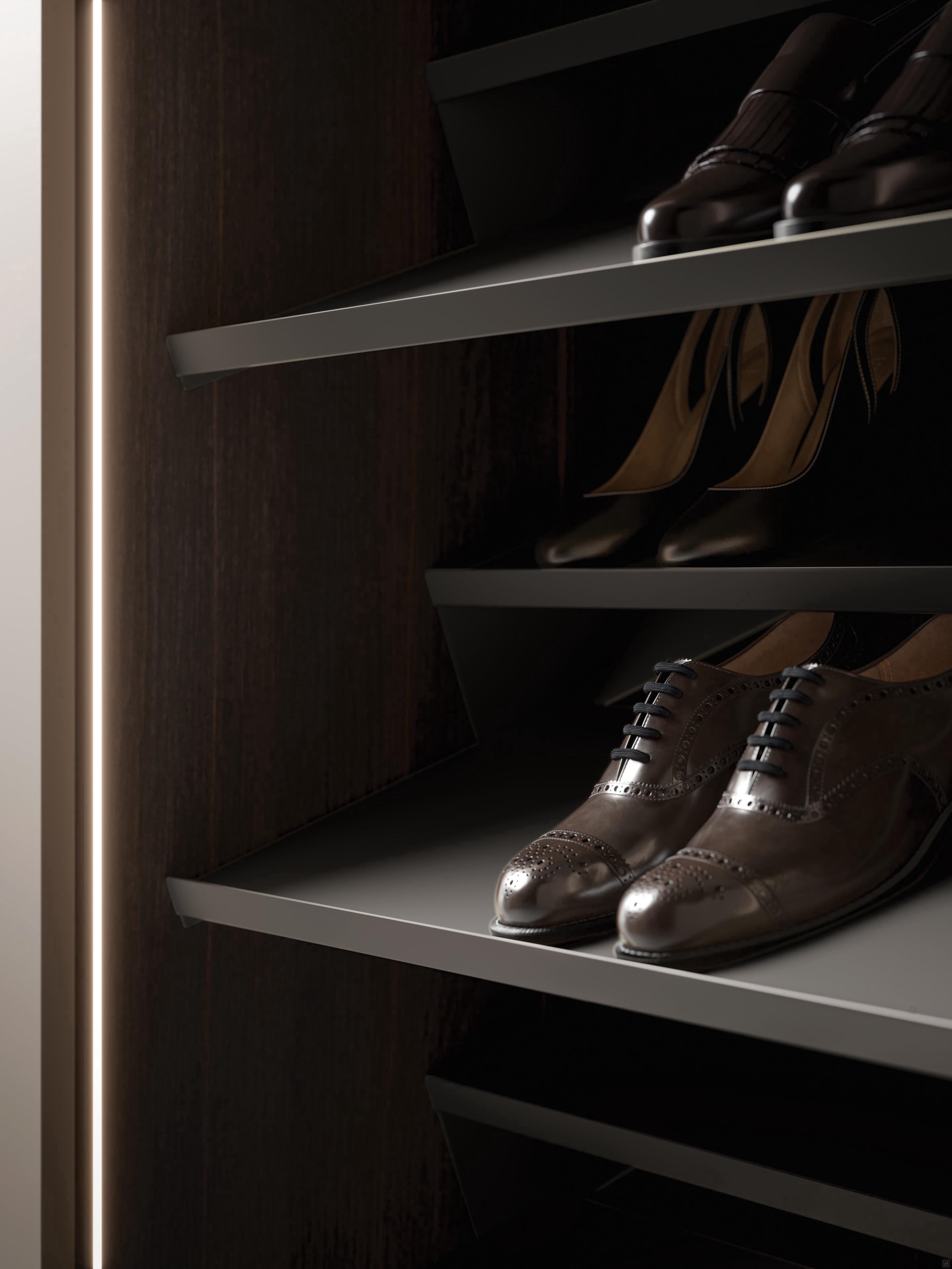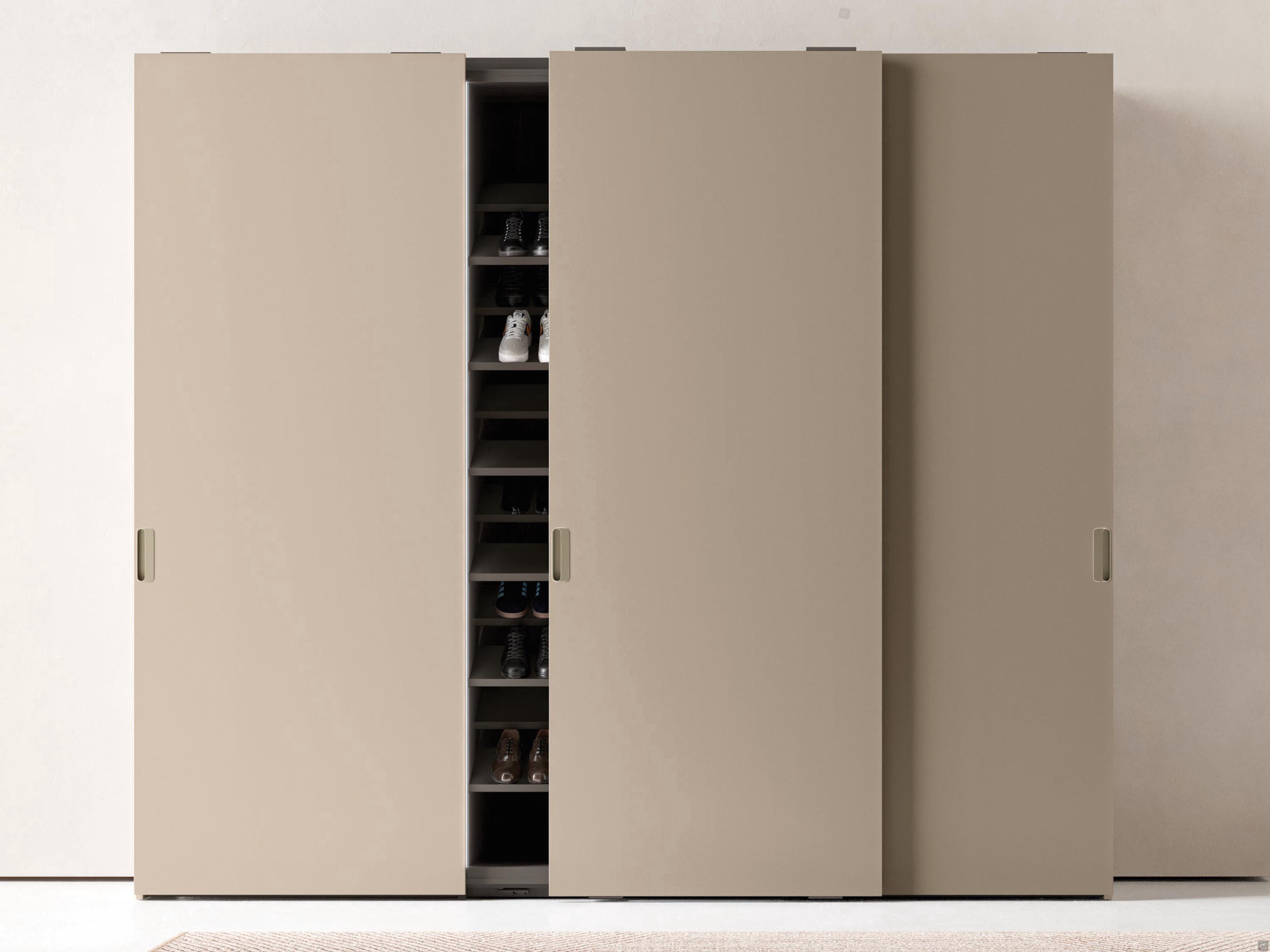 Portes : épaisseur cm 2,2. Equipées d'un tendeur et d'un mécanisme de fermeture assistée. Dans le cas d'armoires à 3 ou 4 portes, les portes extérieures ont toujours une poignée sur les côtés extérieurs.