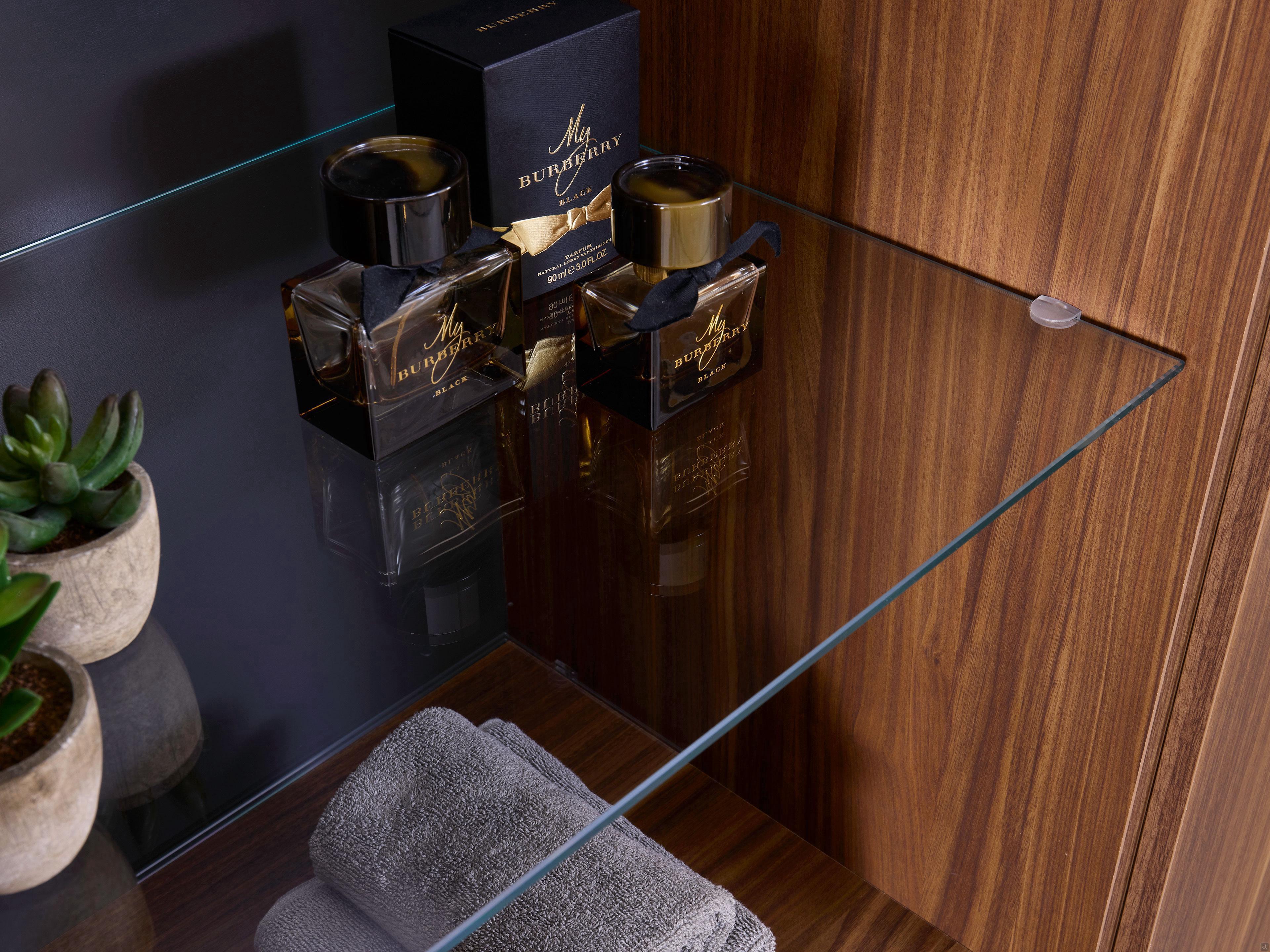 Spécifications des matériaux Structure : en panneaux de particules de 1,8 cm d'épaisseur. Façades : en panneaux de particules de 1,8 cm d'épaisseur. La façade est en MDF de 1,9 cm d'épaisseur, avec une finition laquée lisse. Caractéristiques techniques et équipementPortes : équipées de charnières avec système de ralentissement intégré pour une fermeture lente et silencieuse.Tablettes intérieures : en verre transparent de 6 mm d'épaisseur, avec supports en plastique. Colonne avec compartiment ouvert : le dos est en mélaminé gris orione (pour le fond mélaminé), laqué mat assorti (pour le fond laqué mat ou brillant), laqué sablé assorti (pour le fond laqué sablé). Conseils d'entretienPlacage : utiliser des détergents liquides neutres pour le nettoyage. Pour éliminer les taches de calcaire, passer une éponge imbibée de vinaigre ou de produit anti-calcaire, puis rincer et sécher. Ne pas utiliser d'acides, de produits abrasifs ou de poudres ; ne pas laisser les produits anticalcaires en contact avec la surface pendant une période prolongée, car cela pourrait créer des auréoles.Laque : utiliser des chiffons doux et non abrasifs pour le nettoyage afin d'éviter d'endommager la surface. Ne pas utiliser de produits contenant des solvants, de l'acétone ou des abrasifs, ni de produits à base de cire, d'alcool ou de silicone.