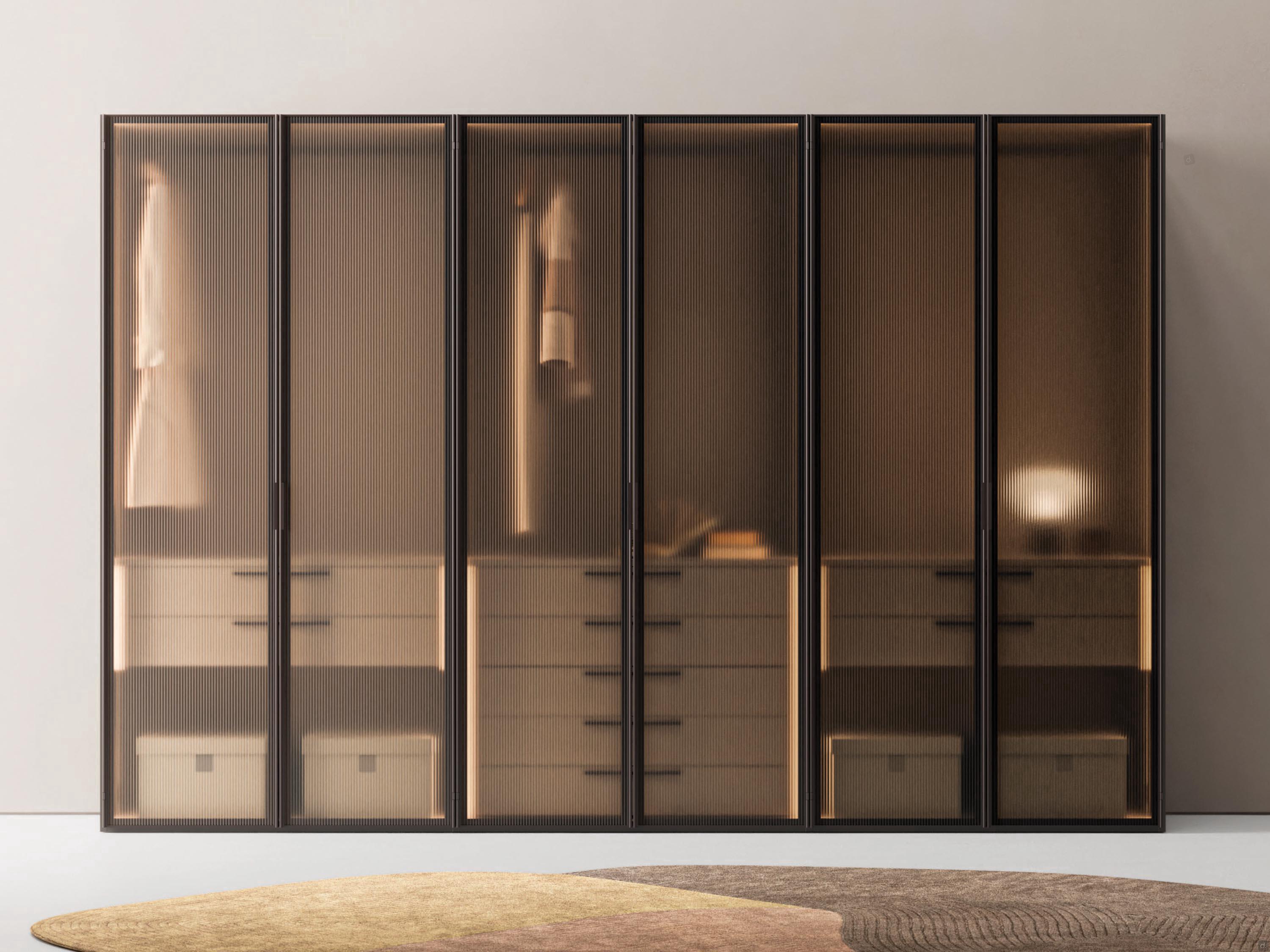 La petite profondeur ne limite pas les possibilités de composition, les intérieurs (en mélaminé ou laqué mat) pouvant toujours être équipés d'étagères, de tiroirs et de penderies.